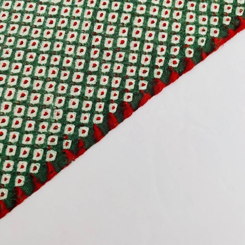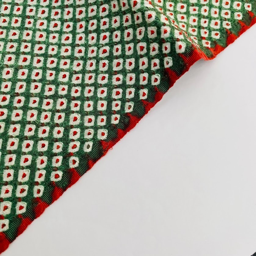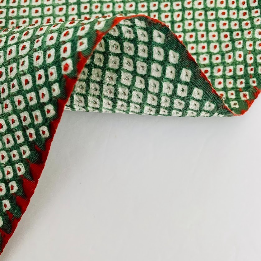 ChristmasHigh Quality SilkShibori Dyed Technique Called Kanoko ShiboriAll Hand Tied - see the last pictureMedium WeightDrapeyKanoko DotsGreen & Orange Colors14.5 x 66 inThis listing was once a part of kimono robe, therefore there might be light spots. The Kimonos are carefully selected by an owner of a long established kimono store (over 100 years old!), then deconstructed and ironed by highly experienced Japanese women before shipped to the US by air. Quality and satisfaction guaranteed.This listing was once a part of kimono robe. The Kimonos are carefully selected by an owner of a long established kimono store (over 100 years old!), then deconstructed and ironed by highly experienced Japanese women before shipped to the US by air. Quality and satisfaction guaranteed.Although every effort is made to photograph our items accurately and describe our products in detail, we cannot guarantee every computer monitor will accurately depict the actual