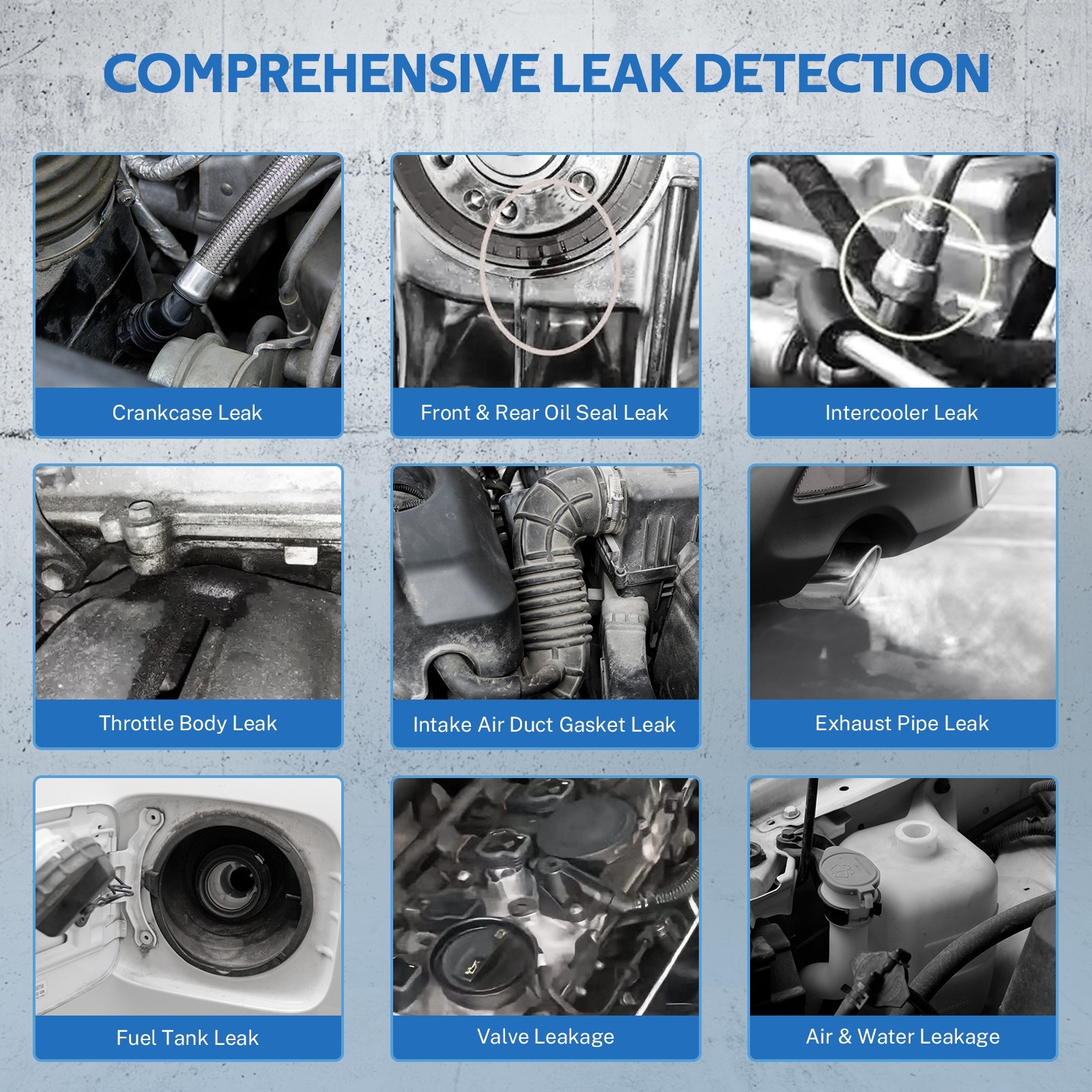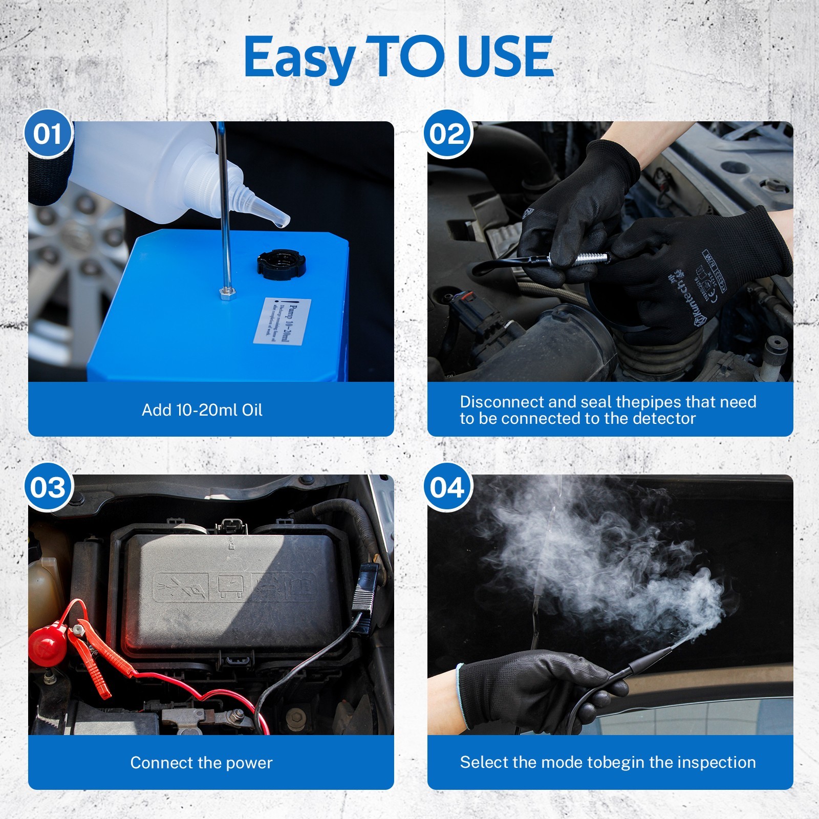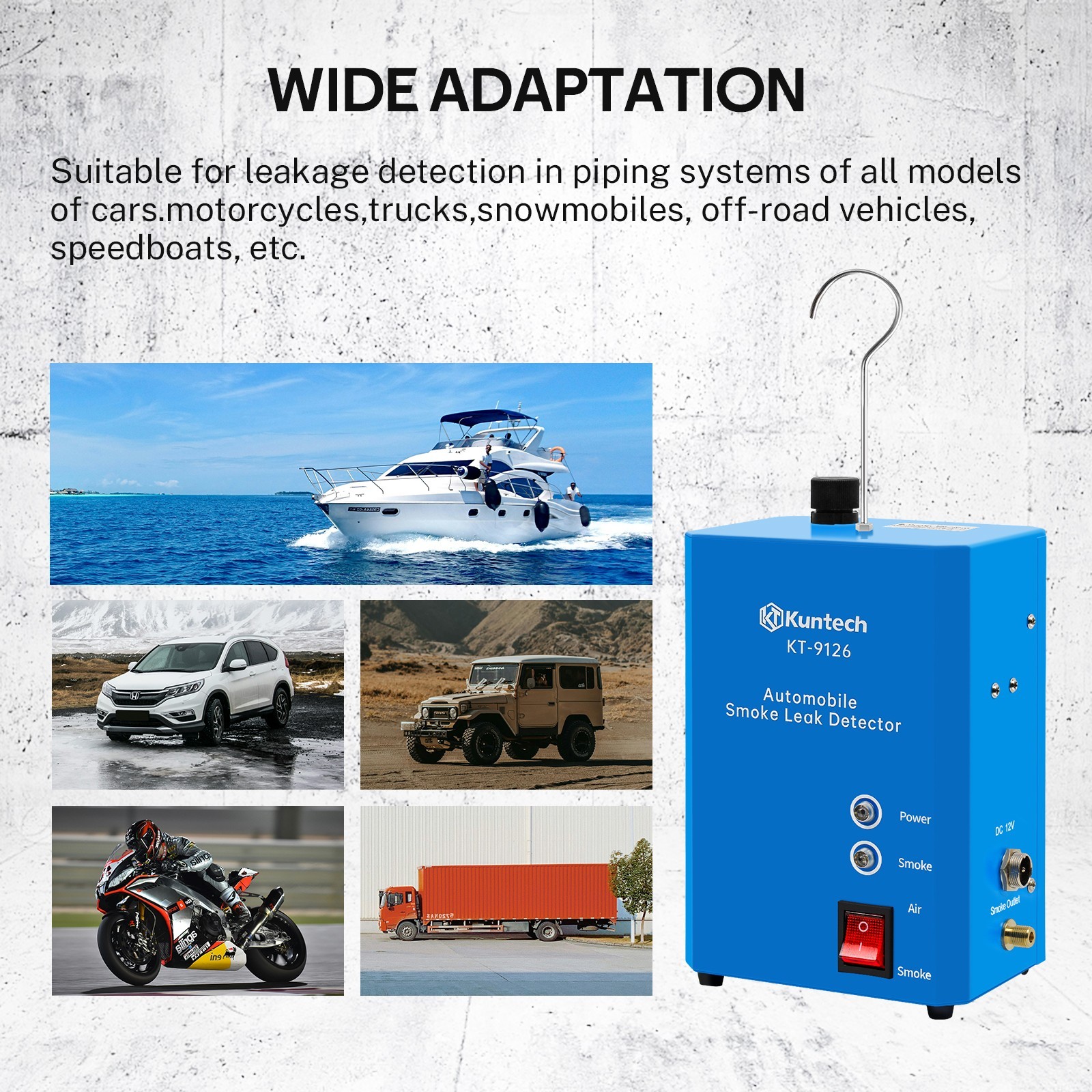 Smoke Machine Automotive Built-in Air Pump, 12V DC Smoke Leak Detector for Pipe System, Fuel Leakage, Leakage Diagnostic TesterSpecifications:Model:KT-9126Power Source: Vehicle DC 12V BatteryRated Power: 48WOutput pressure: 0-18psiSmoke flow rate: 20-30L/minTest oil capacity: 250mlNet weight: 4.82 poundsPackage Dimensions: 10.04 x 9.88 x 6.89 inWarranty:3 YearsPackage Includes:Features:【Multifunction】 This smoke detector has multiple functions such as Pipe system test, car sealing test, fuel tank system test, exhaust system test, intake system test, etc. It's suitable for all cars, motorcycles, light trucks, boats, etc.【Air Mode & Smoke Mode】The auto smoke machine has the air mode and the smoke mode, and the fog can be produced within 4 seconds, so you can accurately detect the leak【Safety Operation】Smoke tester uses baby oil or mineral oil to produce harmless smoke and is ideal for leak detection in all vehicles. The amount of fume filling should not exceed 30ml each time【Intelligent protection】Smoke machine leak detector has overheating protection, which can automatically power off at extreme temperatures to ensure the safety of operators and equipment【Lightweight and Portable】The car smoke tester weighs only 2.0 kg, small and light, not only can be stored easily but also can be used easily