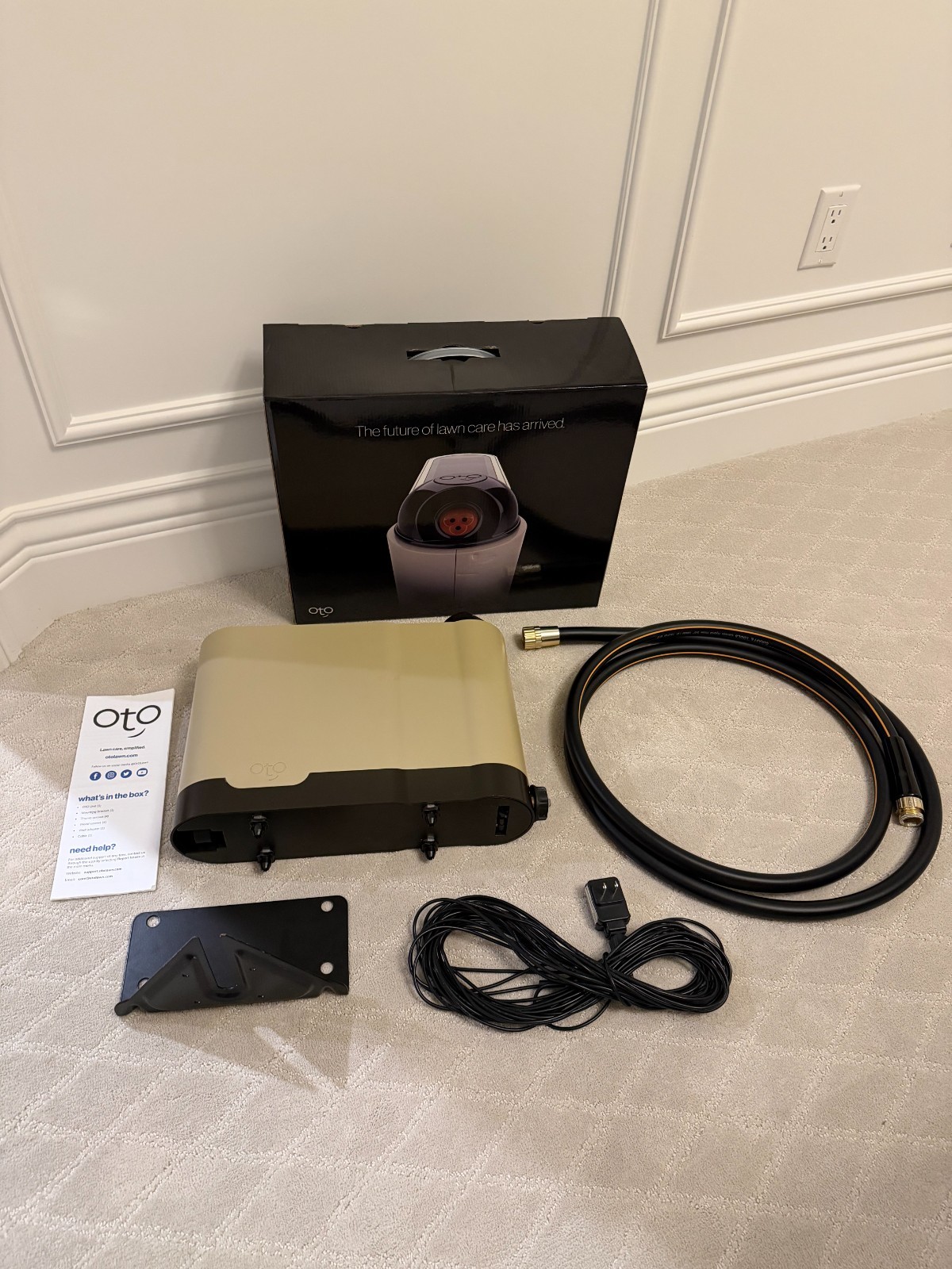 OtO Lawn Smart Sprinkler Unit + Bracket, Adapter& Hose – Used 1 SeasonUsed OtO Lawn Smart Sprinkler Unit — fully functional and tested, used for just one season. Includes mounting bracket, screws, wall adapter, quick start guide, and a 10.5 ft Giraffe Tools 5/8" Hybrid Garden Hose (150 PSI) for easy setup.Works great! Only light cosmetic wear from normal light outdoor use.Perfect for automating watering zones, lawn care routines, and saving water with precision targeting.UNIT OVERVIEWThis OtO Lawn Smart Sprinkler Unit is an all-in-one automatic watering and lawn-care solution. It uses smart zone targeting, app-controlled schedules, and a built-in spray system to water precise areas without the need for underground irrigation. The OtO unit mounts easily to a wall, fence, or post using the included bracket and hardware. It connects to your hose line(included in this sale) and automatically rotates, adjusts distance, and controls watering timing based on your settings in the OtO app. This model supports multiple watering zones, pet-safe lawn treatments (via OtO pods, not included), and real-time adjustments to minimize water waste. A great choice for anyone looking to upgrade their lawn care automation.CONDITION – see photos• Used for 1 season – fully functional, no performance issues• Light cosmetic wear from outdoor use (normal, does not affect operation)• Mounting bracket and screws included• Wall power adapter included — works perfectly• Quick Start Guide included for easy setup• Giraffe Tools hose is in excellent condition (used lightly)FEATURES• App-controlled smart sprinkler system• Precision watering zones without trenching or underground irrigation• Adjustable spray distance and rotation• Automated schedules with optional AI-based optimization• Wall-mount design with included bracket• Weather-resistant outdoor housing• Compatible with OtO lawn treatment pods (sold separately)• Low water usage and efficient coverage• Easy setup — plug in, connect hose, calibrate in app• Works with standard garden hoses (5/8" connection included)KEY SPECIFICATIONS Specification Detail Model OtO Lawn Smart Sprinkler Unit Color White / Outdoor weather-resistant Power Wall AC Adapter Included Water Connection Standard 5/8" garden hose Season Used 1 Mount Wall/Fence Mount w/ bracket & screws Hose Included 10.5 ft Giraffe Tools Hybrid Hose (5/8", 150 PSI) Condition Used – Fully Functional INCLUDES – Original Box! • OtO Lawn Smart Sprinkler Unit• Mounting Bracket• Mounting Screws• Official OtO Wall Power Adapter• Quick Start Guide• Bonus: 10.5 ft Giraffe Tools Hybrid Garden Hose (5/8", 16mm, 150 PSI)– Perfect length for connecting OtO to your spigotBONUSThis listing includes a Giraffe Tools 10.5 ft Hybrid Garden Hose, a durable, flexible, kink-resistant hose ideal for OtO installations.Most listings do not include a hose, making this a near plug-and-play kit.SUMMARYA reliable and well-maintained OtO Lawn Smart Sprinkler Unit — used only one season and fully functional.Perfect for homeowners seeking smart watering automation without underground irrigation costs.Ships fast, well-packed, and includes everything needed to get started immediately.OtO Lawn, smart sprinkler, robot sprinkler, automatic watering, lawn automation, OtO unit, OtO smart irrigation, garden sprinkler, app-controlled irrigation, wall mount sprinkler, Giraffe Tools hose, hybrid garden hose, smart lawn care, outdoor watering system, precision sprinkler, OtO sprinkler used.