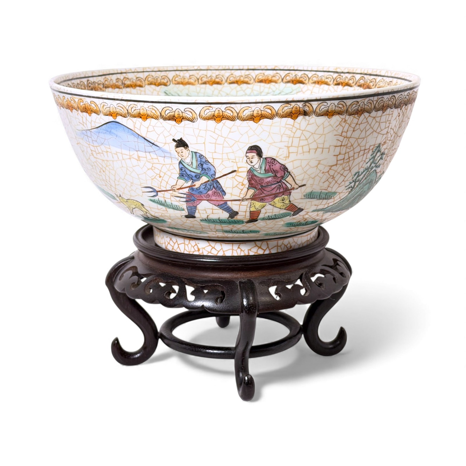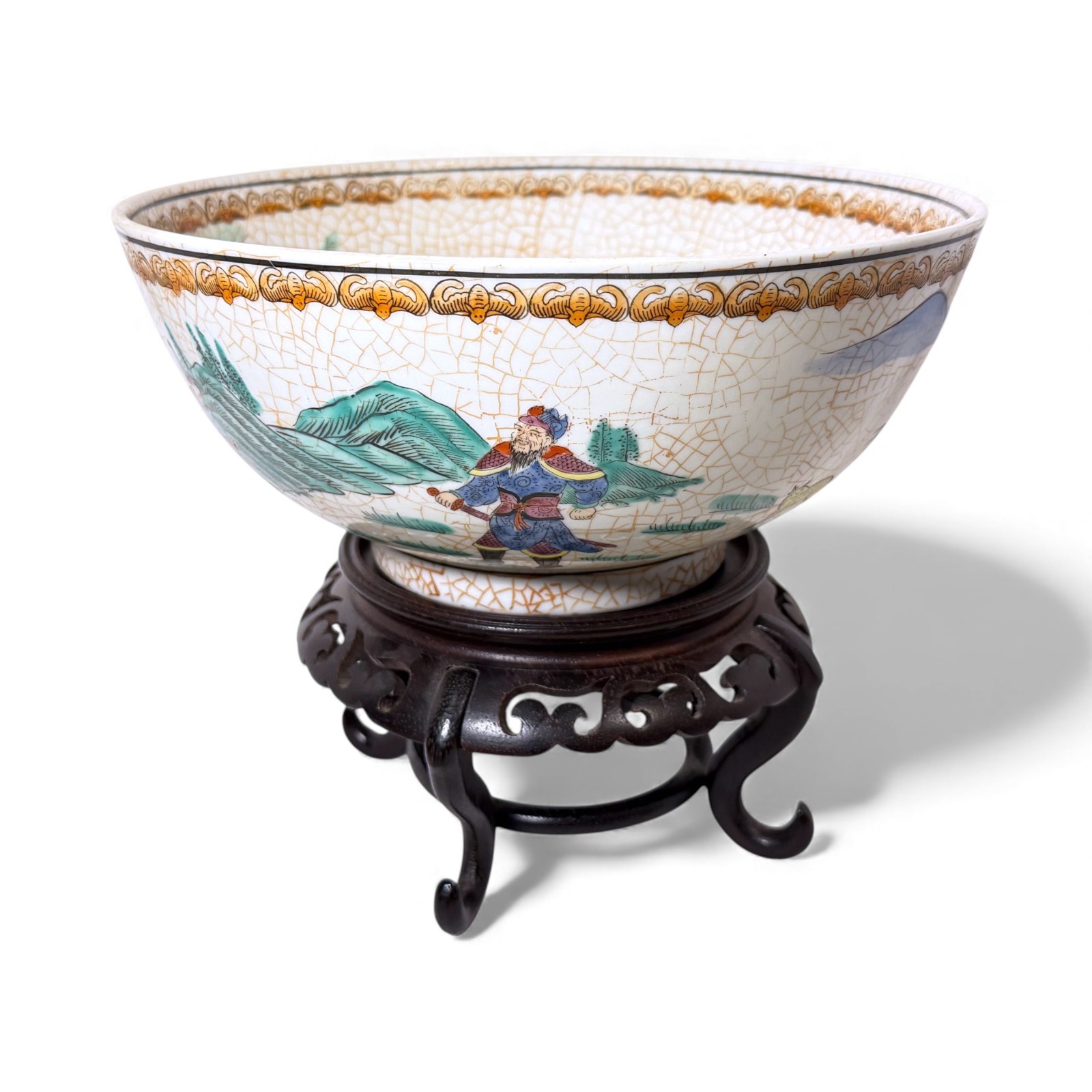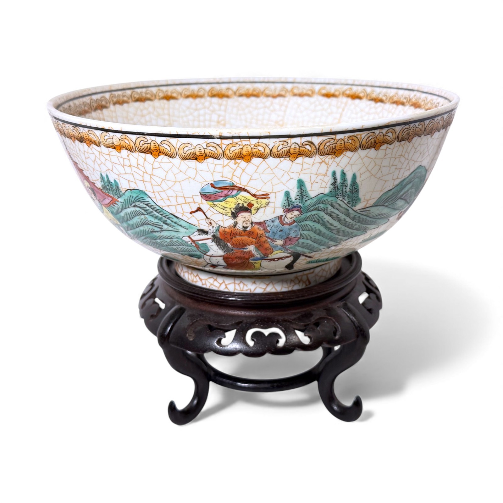 Vintage-style Chinese porcelain bowl in the Mandarin palette, featuring hand-painted narrative scenes of figures, horsemen, and traditional landscape. Finished with a fine crackle glaze and includes a carved wood display stand. Porcelain ceramic with crackle glaze Mandarin-style hand-painted scene Diameter approx. 10 inches Height approx. 4.5 inches (bowl only) Includes carved dark wood display stand No chips or cracks; intentional glaze crazing 💵 Save $5 when you buy 2 or more items - use code SAVE5ON2 at checkout 🆓 Free Shipping via USPS Ground Advantage 🚚 Orders ship DAILY, Monday-Saturday 📦 Item will be carefully packed to ensure safe delivery