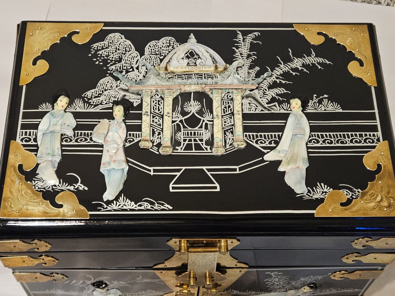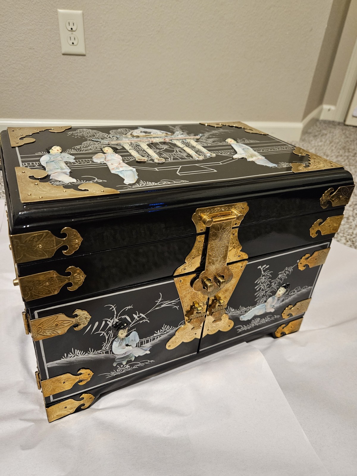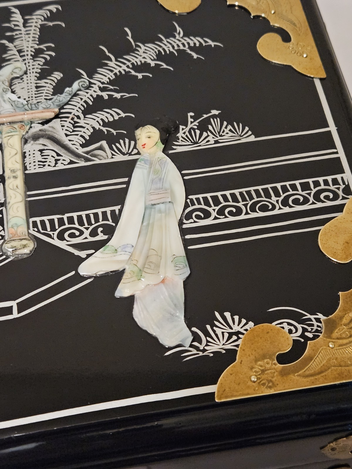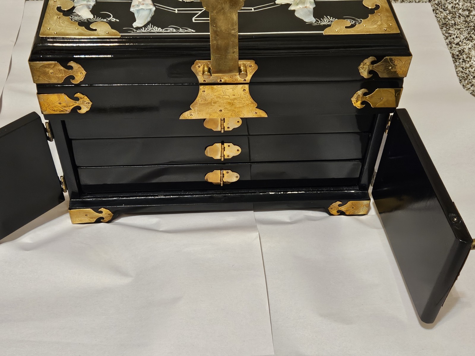 This vintage Chinese black lacquer jewelry box features a mother-of-pearl (MOP) geisha overlay and brass accents, making it a distinctive collectible storage piece. Condition is overall great, with some natural tarnish on the brass hardware and a few small chips in the lacquer: along the inside bottom edge where the lower drawer pulls out, plus a small chip on the right side bottom edge. It has been stored in a non-smoking environment. Free shipping is included; check the listing for details on delivery timing and any additional information.
