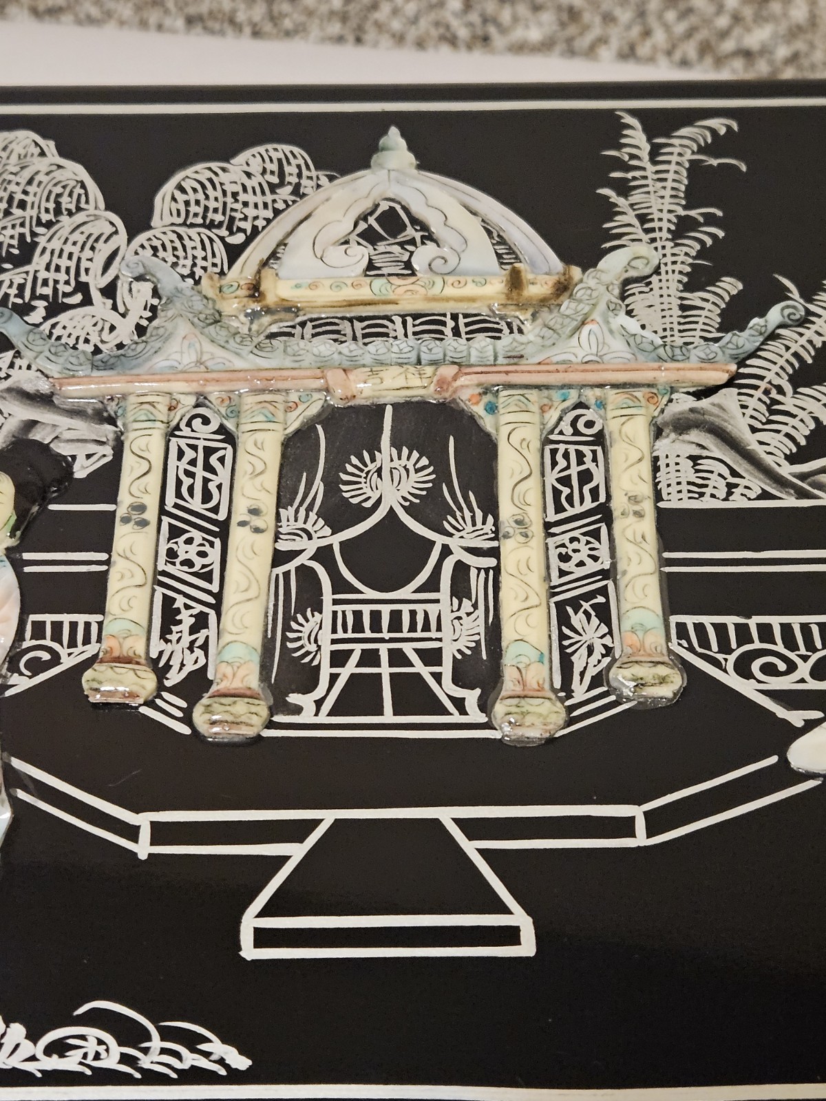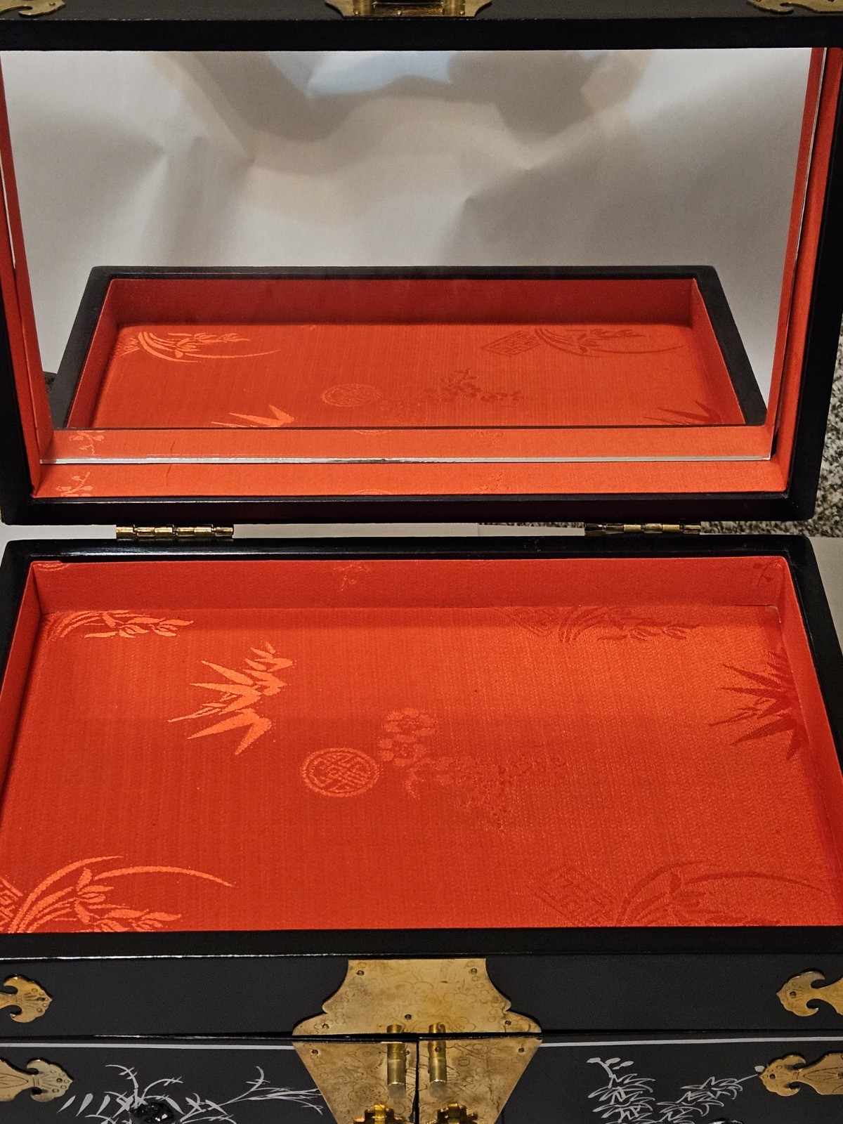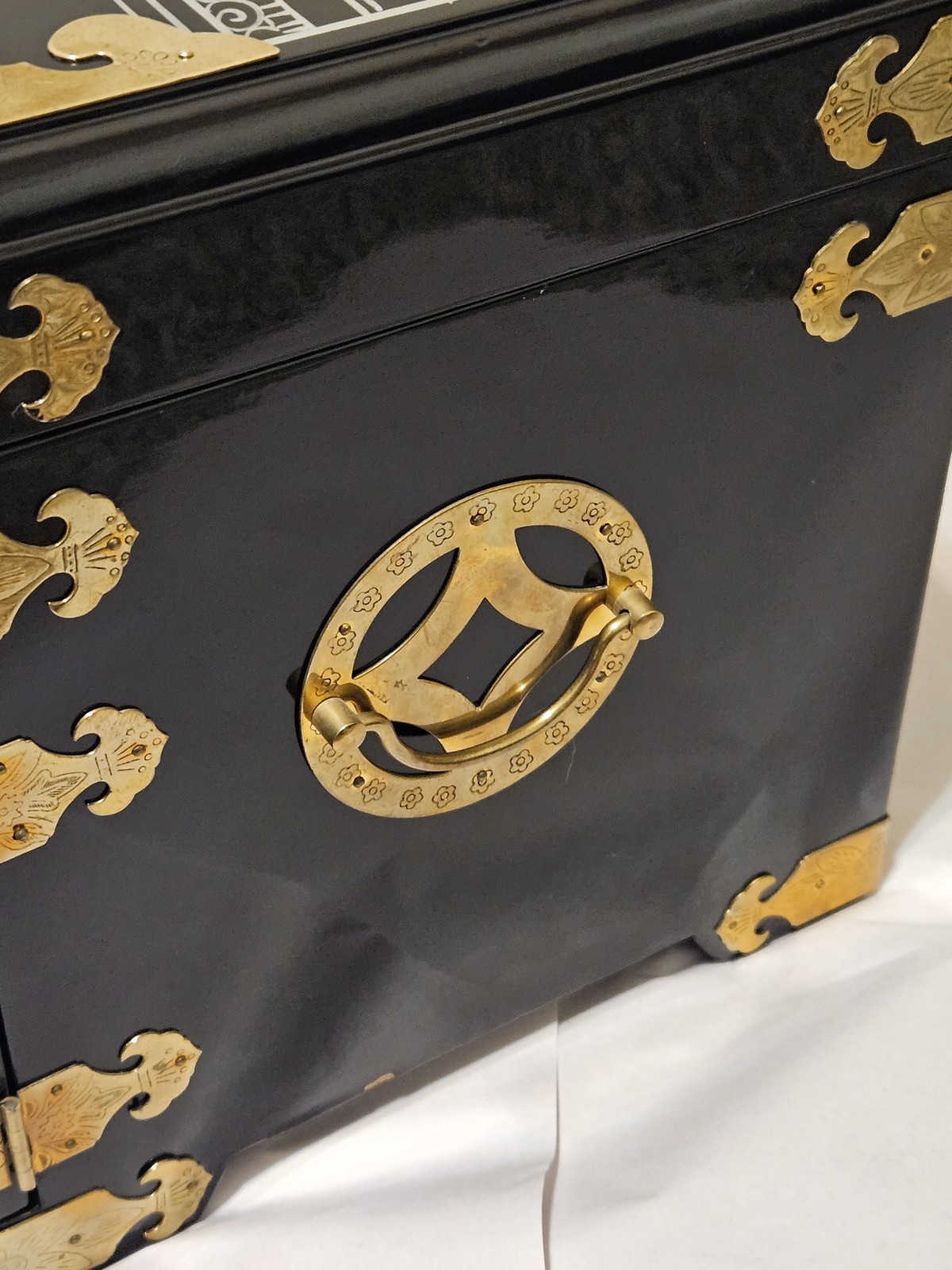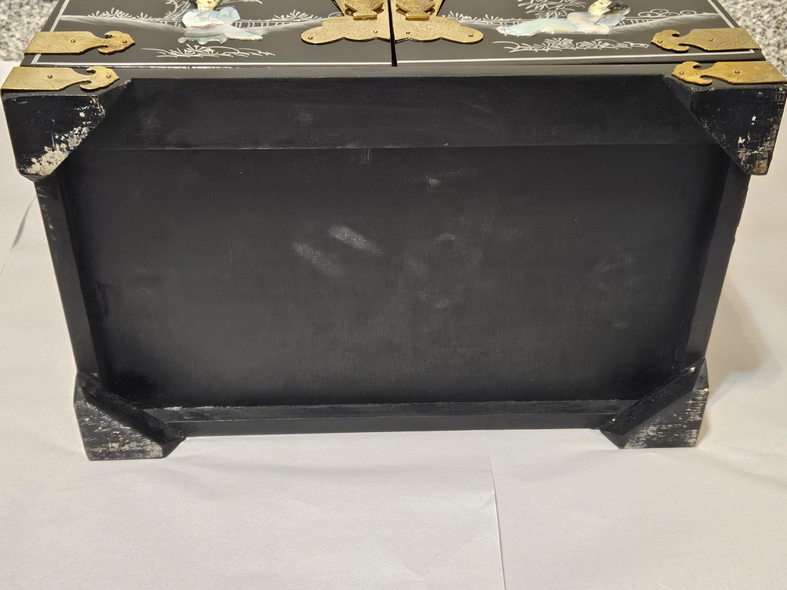 This vintage Chinese black lacquer jewelry box features a mother-of-pearl (MOP) geisha overlay and brass accents, making it a distinctive collectible storage piece. Condition is overall great, with some natural tarnish on the brass hardware and a few small chips in the lacquer: along the inside bottom edge where the lower drawer pulls out, plus a small chip on the right side bottom edge. It has been stored in a non-smoking environment. Free shipping is included; check the listing for details on delivery timing and any additional information.
