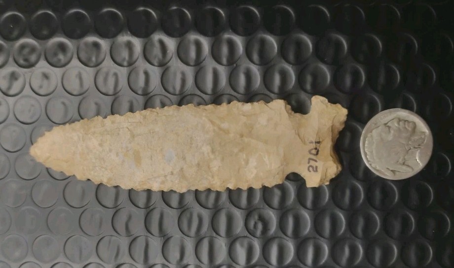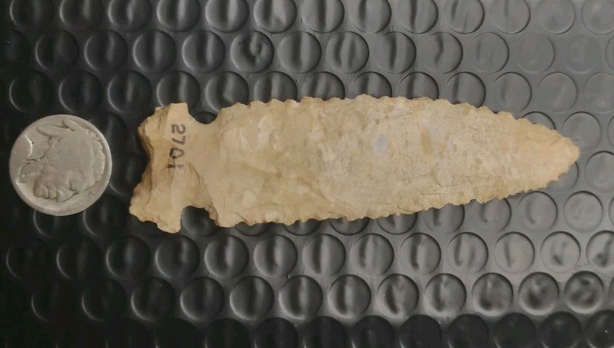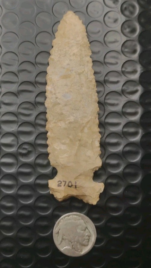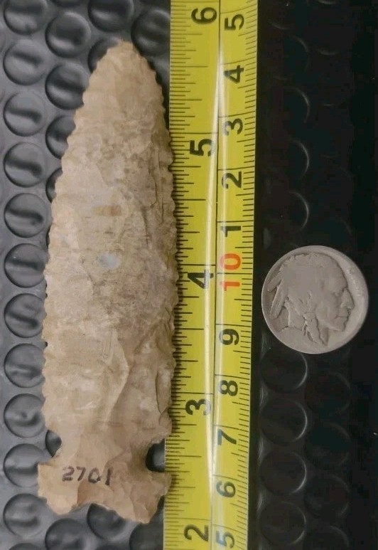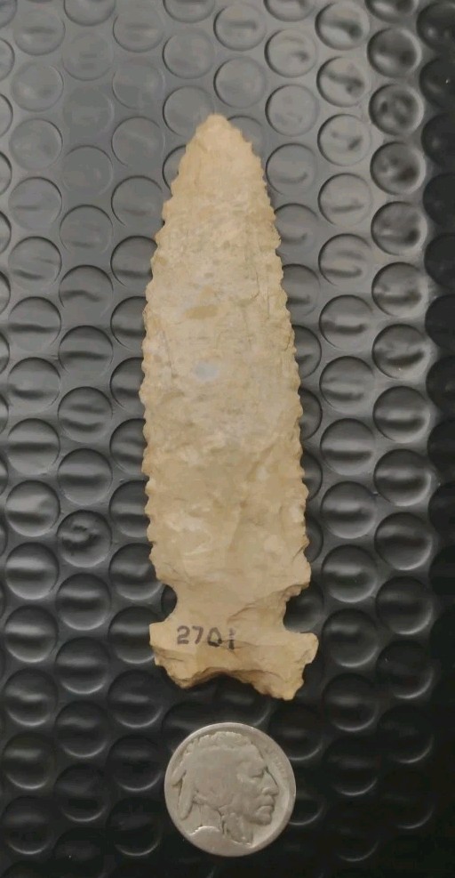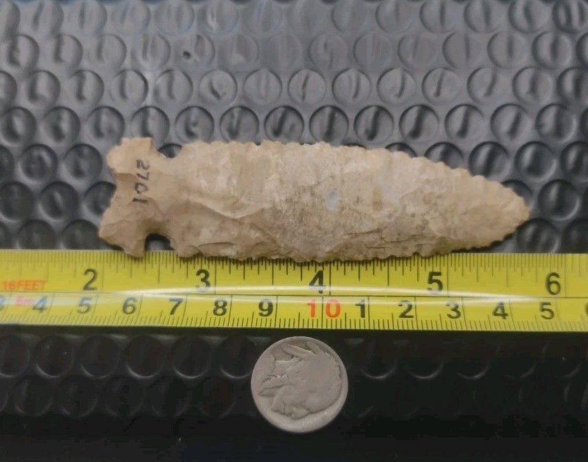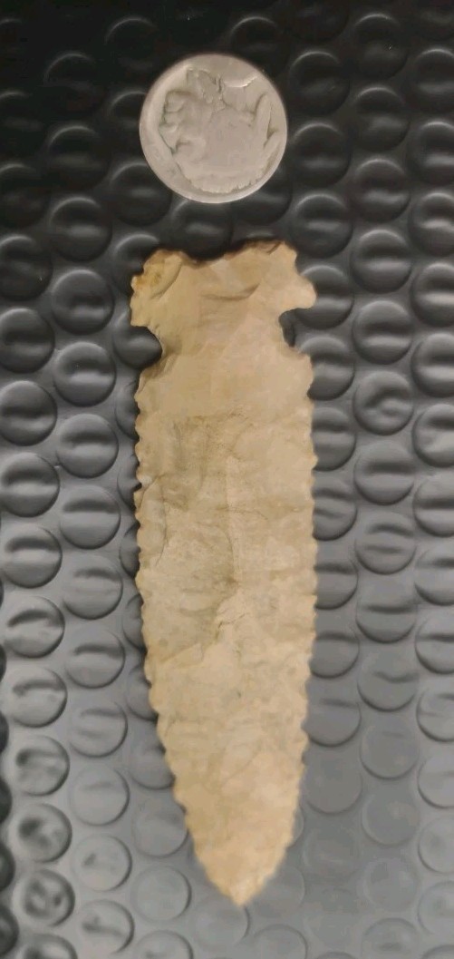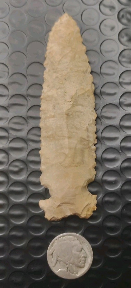 This authentic Indian arrowhead a Graham Cave is a beautiful piece of US Native American craftsmanship, measuring 3 3/4 inches. Handmade in the United States, this artifact represents a piece of Native American history and culture. Perfect for collectors interested in pre-1600 artifacts, this arrowhead offers a glimpse into the artistry and skill of the indigenous people of the Americas.