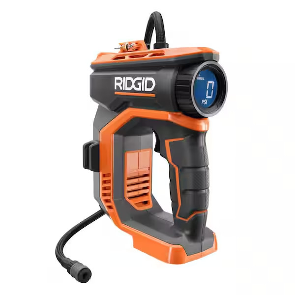 About This ProductRIDGID introduces the 18V Digital Inflator (Tool Only). This tool provides the fastest truck tire fill from flat to full. This tool is backed by the Industry's Only Lifetime Service Agreement, simply register within 90 days of purchase for FREE Parts, FREE Service, For LIFE. The 18V RIDGID Cordless High-Pressure Inflator includes a 12-Volt Vehicle Power Cord, Quick Coupler Chuck, Ball Inflation Needle, Brass Presta Chuck, Inflator Nozzle, and operator's manual. Battery and Charger sold separately.HighlightsEasily rotate the digital dial to set inflator to desired pressureQuick Connect Air Chuck allows for quick and easy attaching/detaching of tire stem or