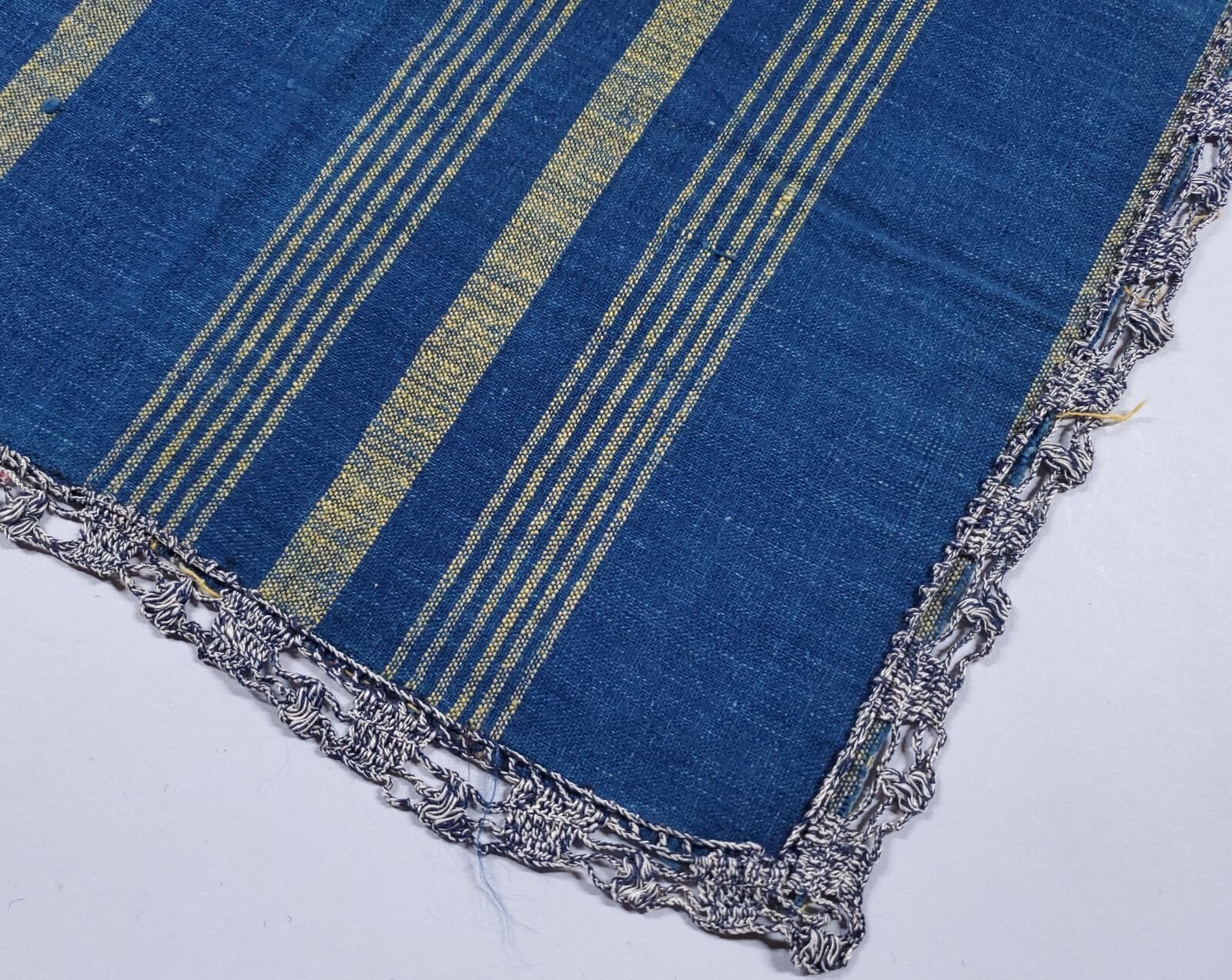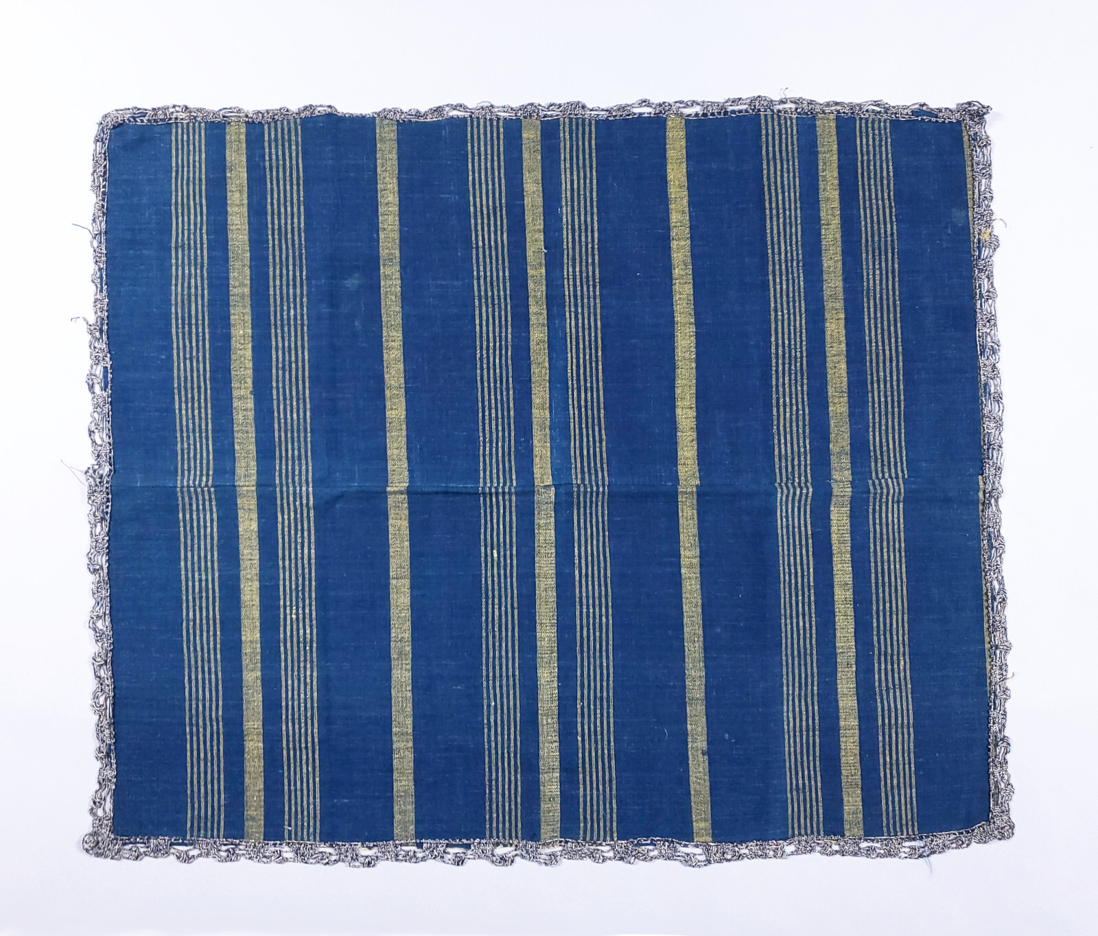 Vintage peasant tablecloth or other covering from Bulgaria. Hand-woven on a rural loom and trimmed with handmade lace. Perfect for a rustic table setting. Measures 28.5" x 34" including the lace. In very good condition with one faint spot as shown in the last photo.