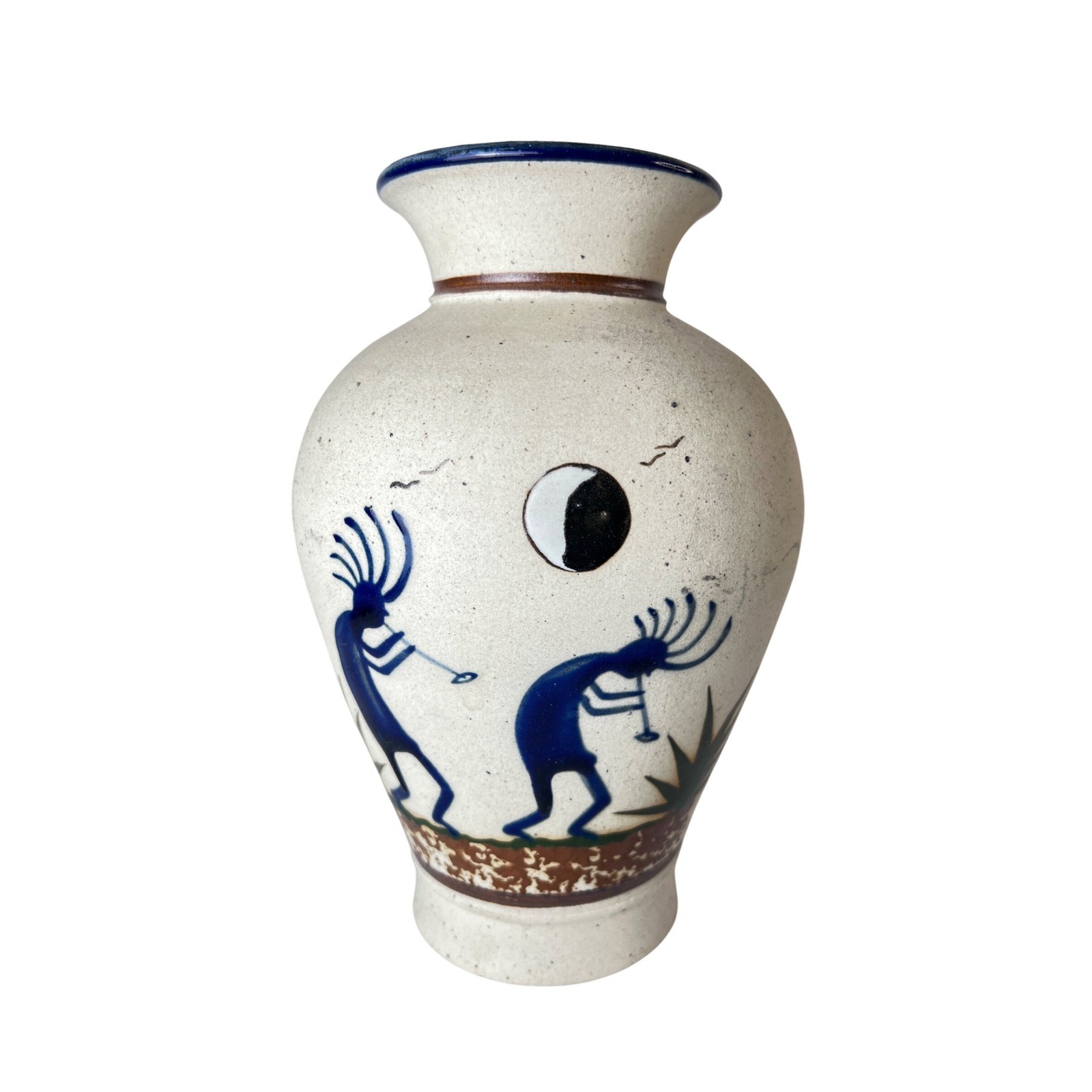 Handmade rustic pottery vase featuring hand-painted Kokopelli dancers, created in Mexico. This piece has a speckled clay body, cobalt blue rim, and painted desert landscape banding. Signed "Mexico" on the base. A great decorative accent for Southwestern, desert, boho, or folk art styling.Details:Origin: Mexico (signed)Height: approx. 9"Opening diameter: approx. 2.75"Design: Kokopelli dancersMaterial: Hand-thrown ceramicStyle: Rustic / Southwest pottery / Folk artCondition: Preowned, natural imperfections from handmade production; overall very goodA unique handcrafted piece with classic desert-inspired imagery.