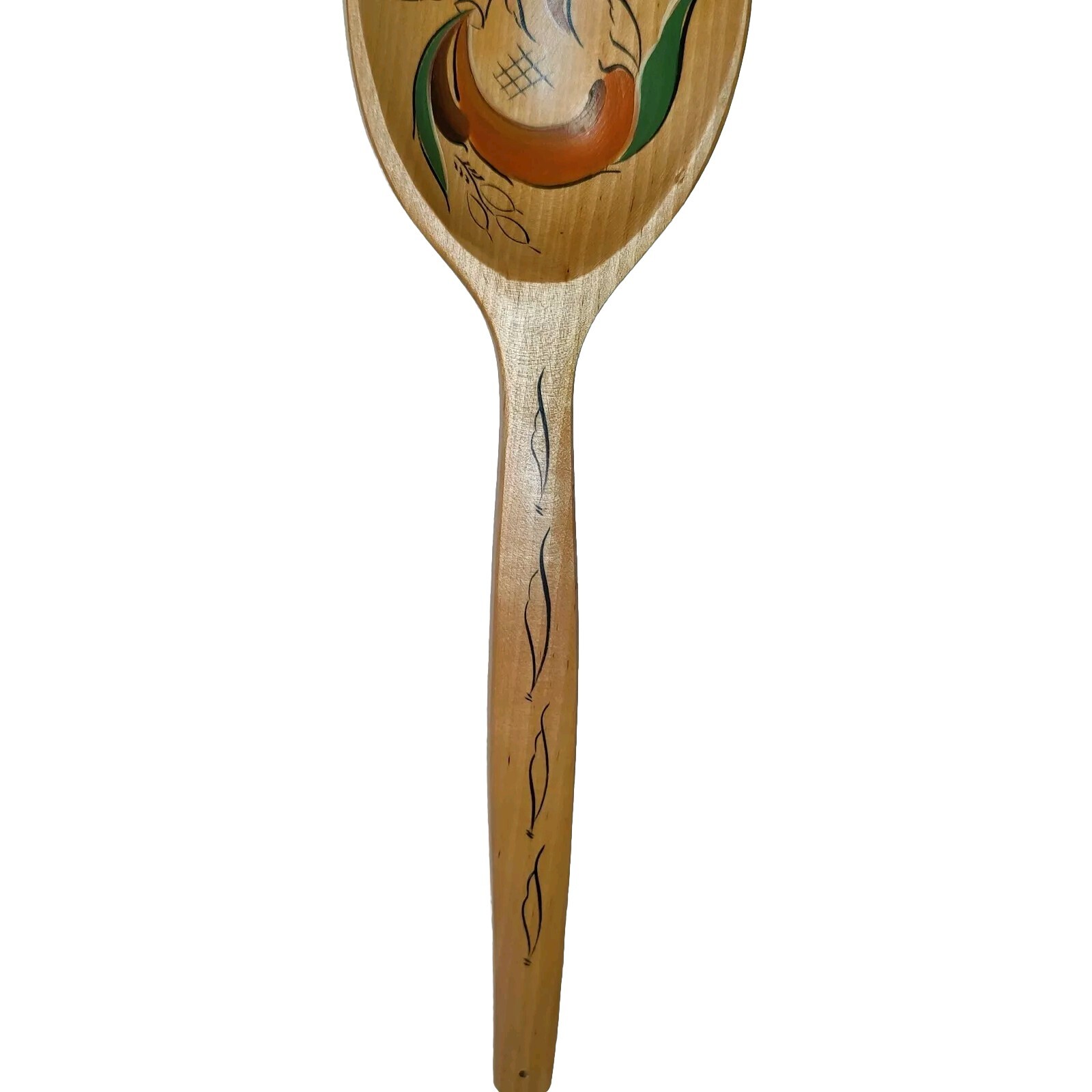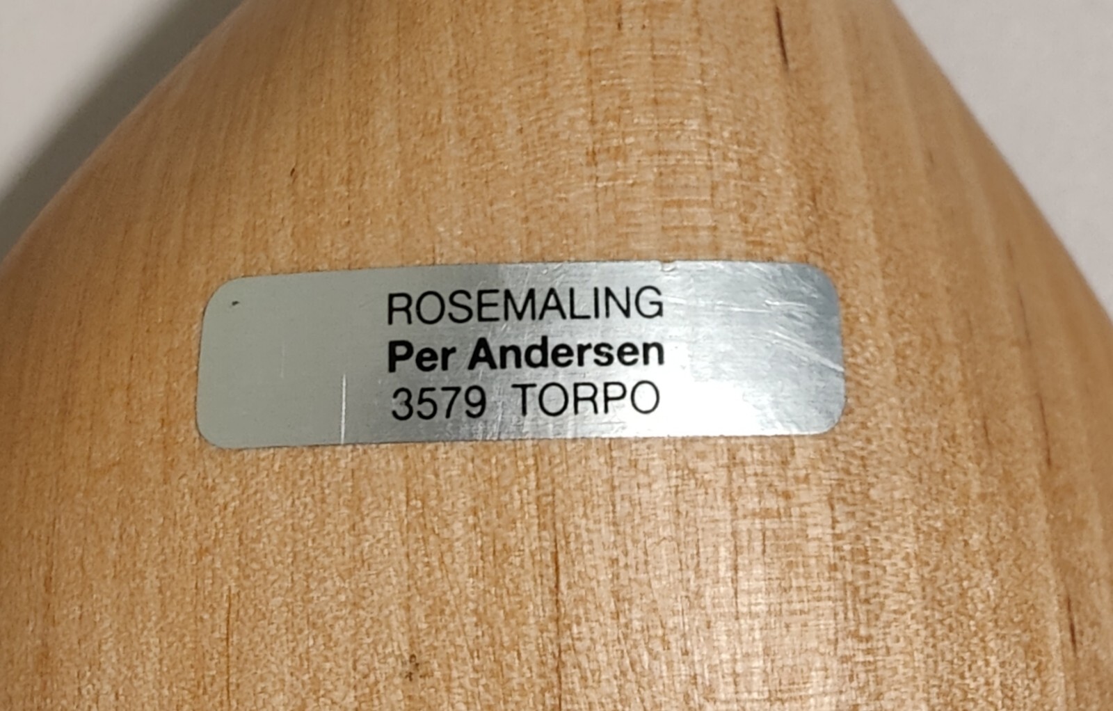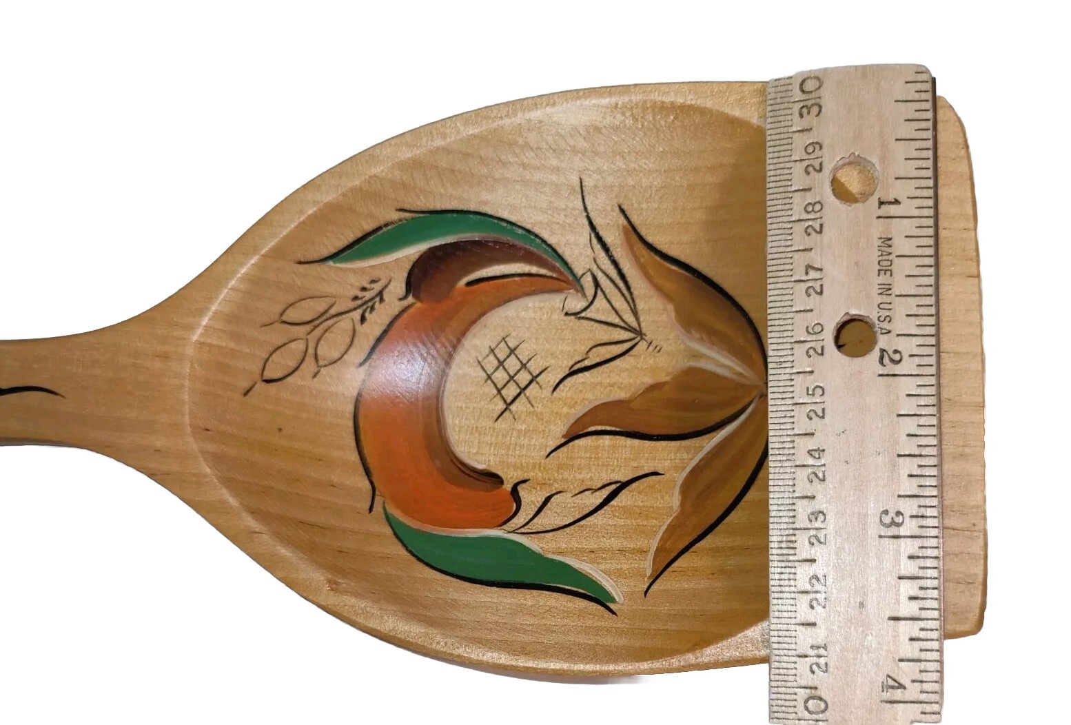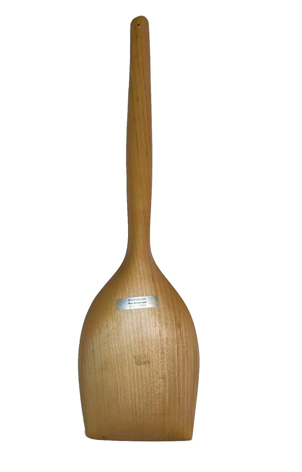 This used Per Andersen rosemaling wooden spoon is a hand-painted piece of Norwegian folk art decor, marked by the maker. It can be displayed in a kitchen, cabin, or collectible folk art grouping. Condition is used; check the listing for details on any wear, paint loss, markings, size, or hanging/display features. Free shipping is included with purchase. Check the listing for details.