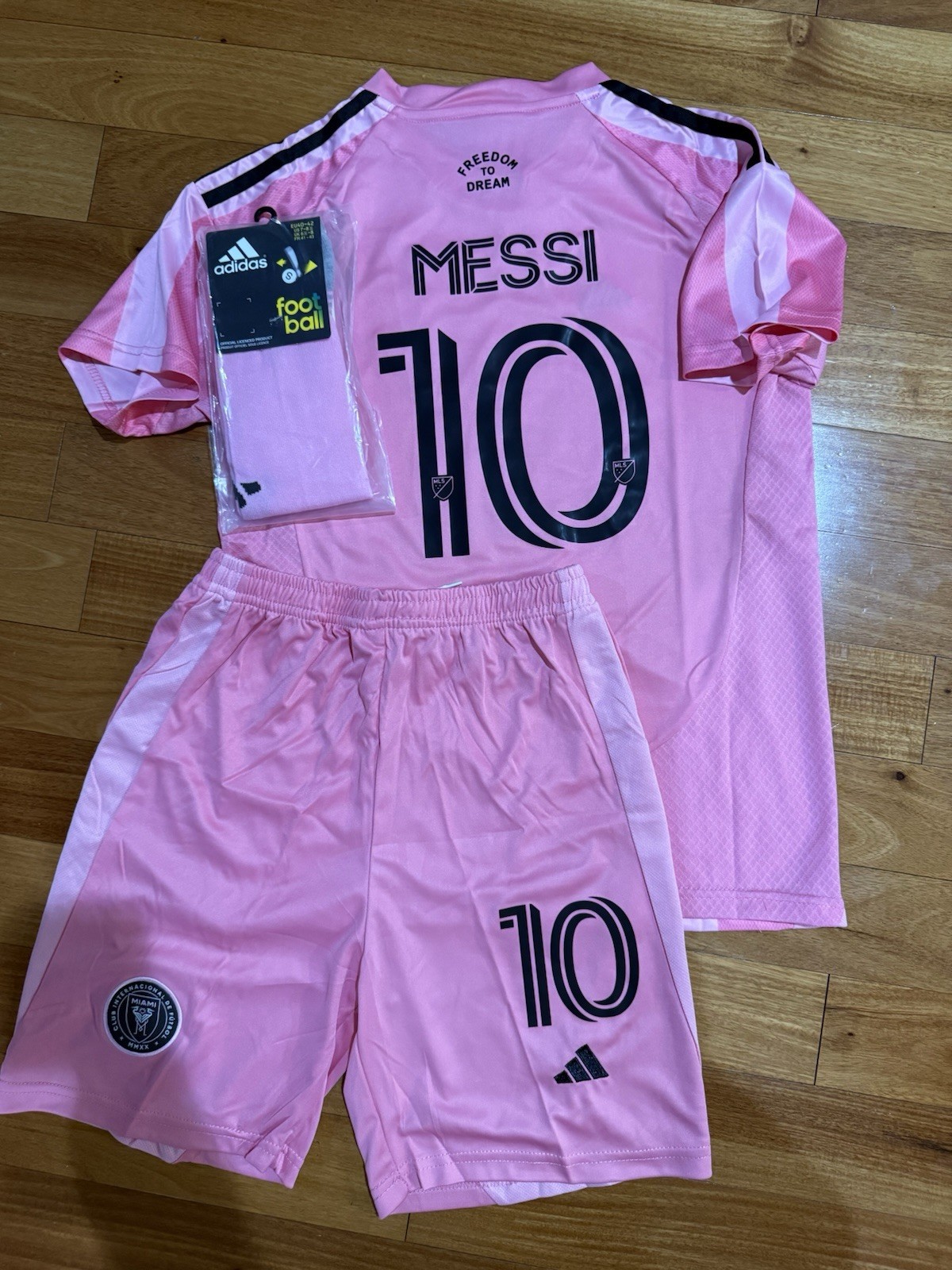 BNWT Kids Inter Miami Leo Lionel Messi Home Jersey Shorts Socks set Pink Size 28Approx 17" pit to pitApprox 23" Top to bottom