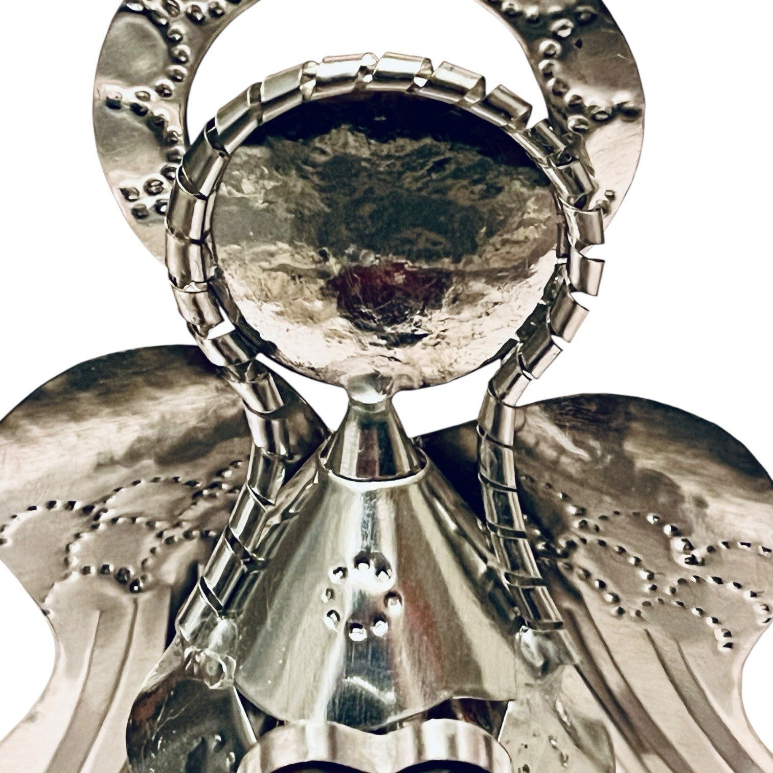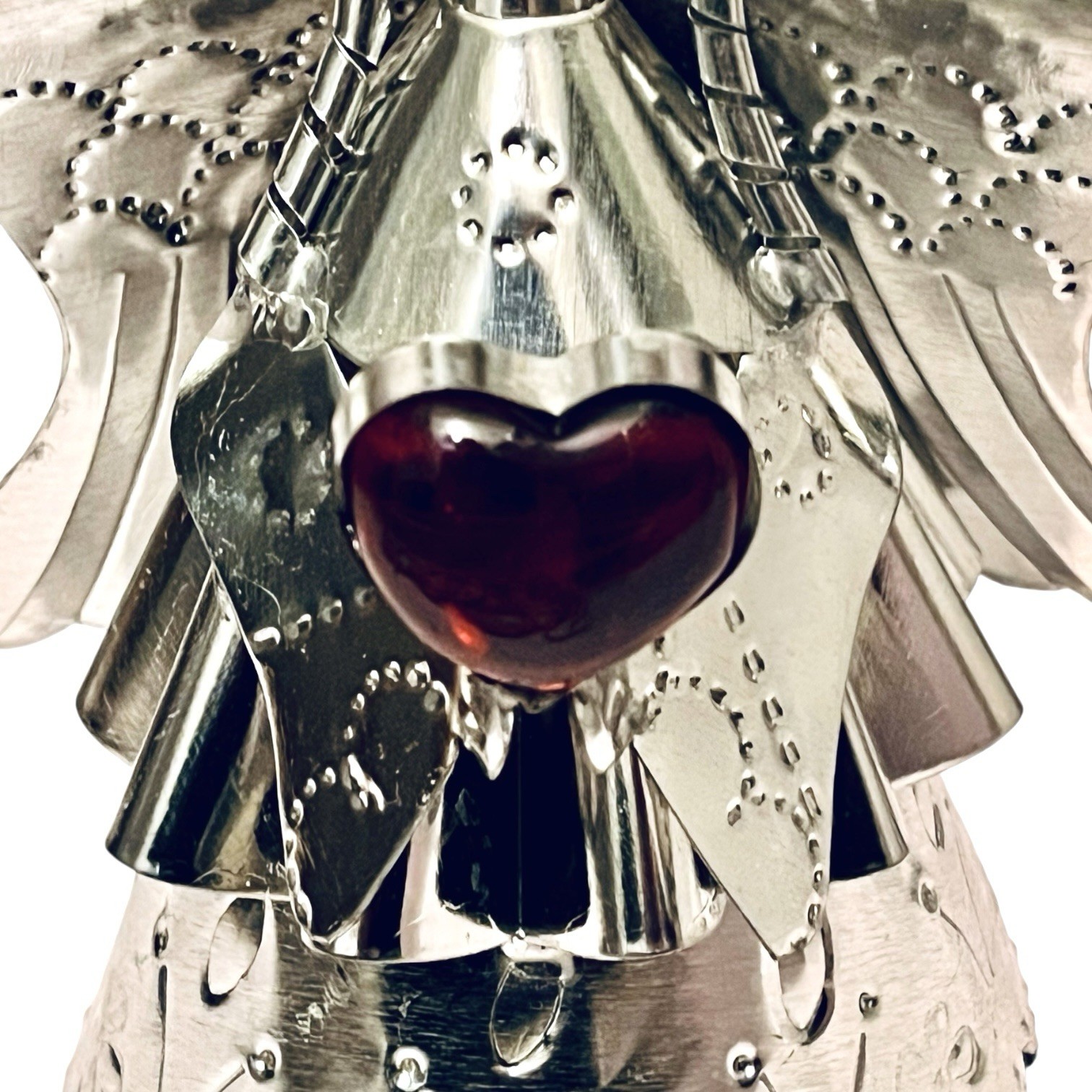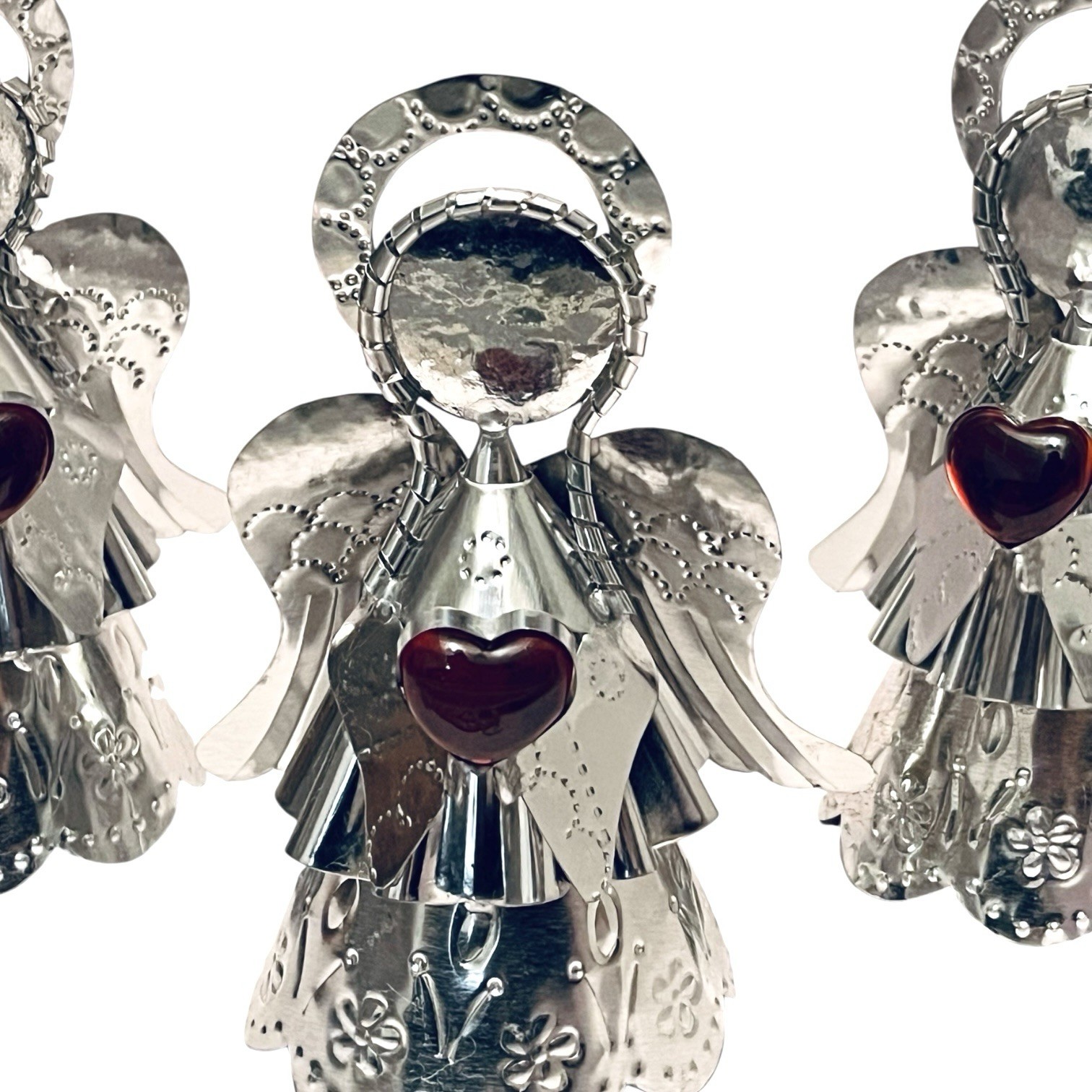 Sweet little tin Angel holding a red glass heart!Tin has a silver finish.Measures approx:7”H x 5”W x 3”DEach Angel is handmade and unique.Listing is for (1) Angel. Crafted by hand in San Miguel de Allende.****Our items are made by hand. Some of them have small imperfections that give them character as a whole. It simply adds to the uniqueness and rustic quality of the items. Therefore, checking and other rustic qualities are not considered defects.