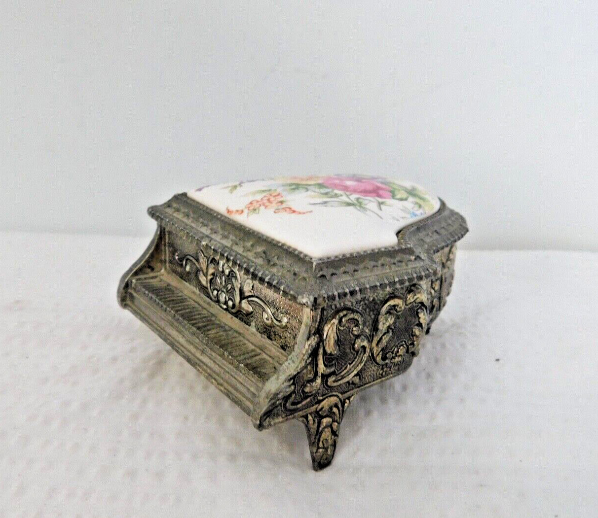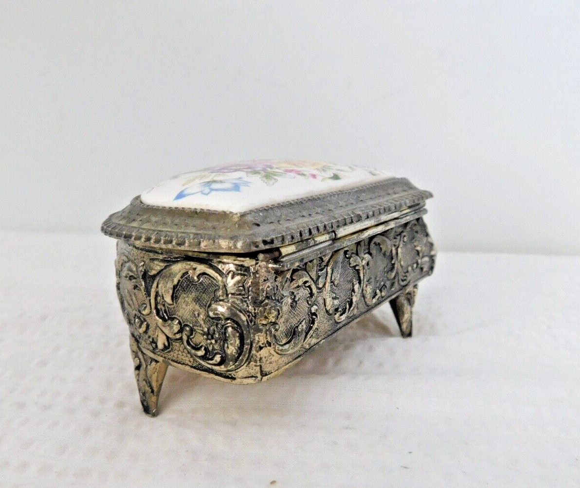 Vintage grand piano silver tone metal trinket box with floral porcelain lid.It measures 4 " by 3" and stands 2 1/4" tall.Made in Japan.Please check pictures and description or email your question.We live in a smoke free home.We ship in one day.Thank you for visiting our EBAY store