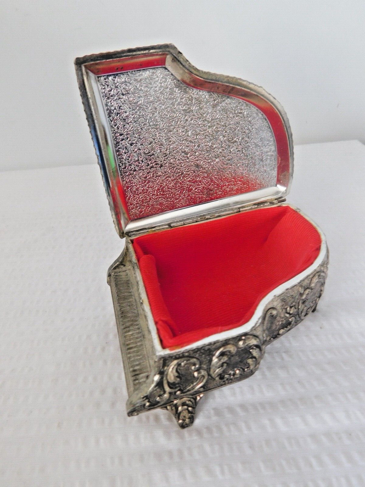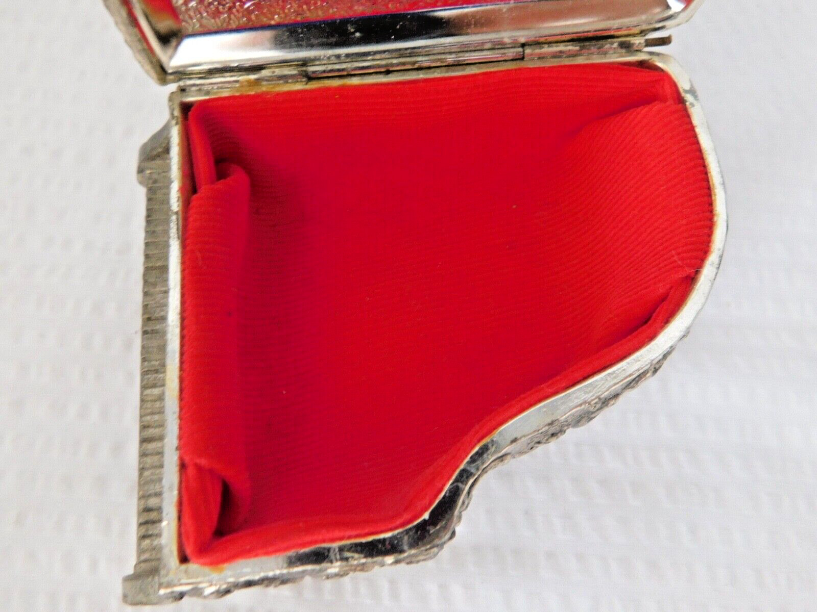 This vintage Japan piano trinket box is a silver-tone metal collectible with an enamel floral design and a red fabric-lined interior. Condition notes: there is a tiny spot of flaking just above the keyboard, and tarnish shows on the bottom. It can be used to store small jewelry, keepsakes, or coins. Free shipping is included. Check the listing for details on exact size, markings, and any additional wear.