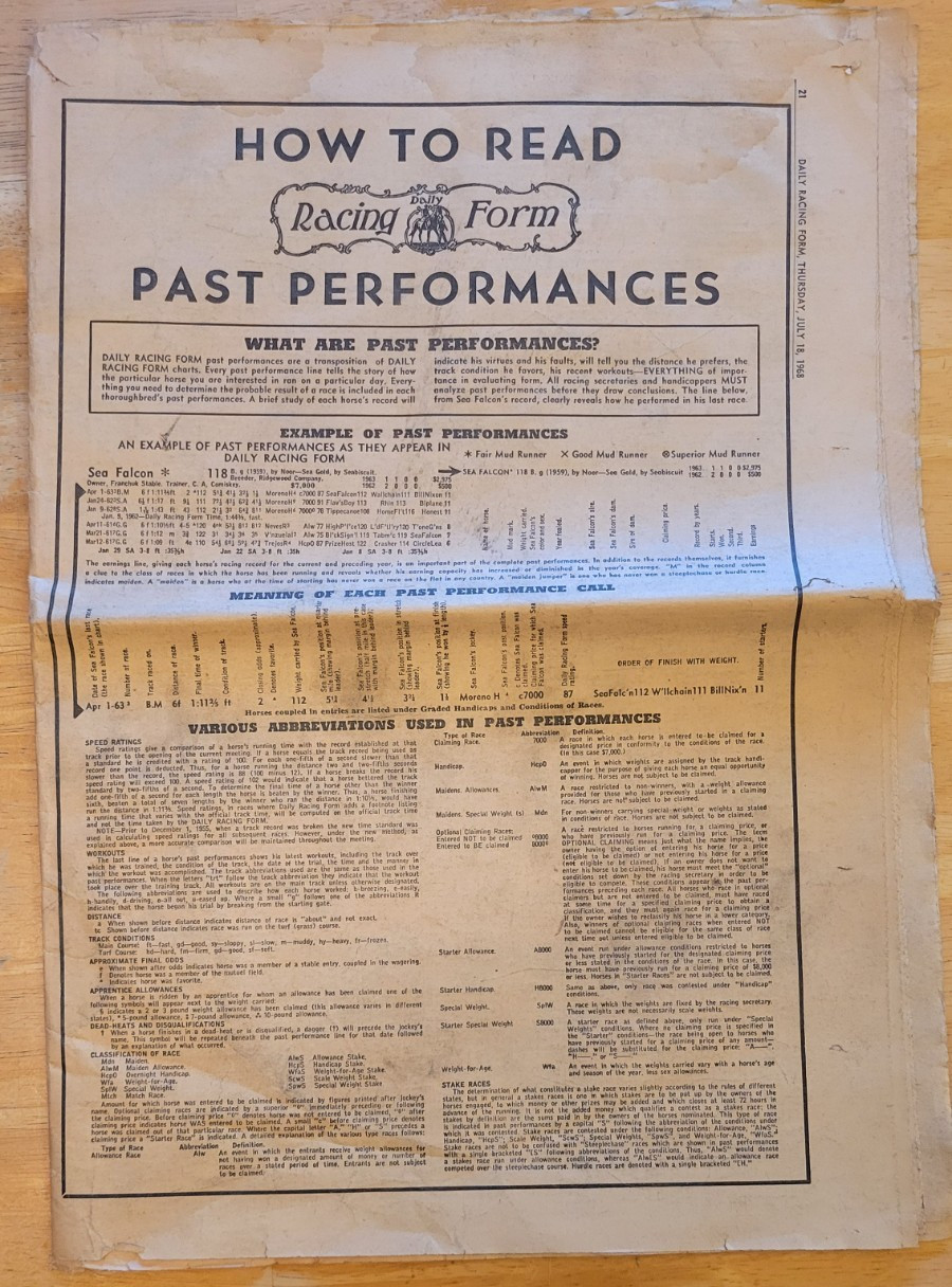Vintage 1968 - Racing Form - Stage Door Johnny Colorado City CaptionJuly 15 has coffee stain (?) on cover.July 18 is a partial copy mainly the 'How to Read Past Performances' section.Item is vintage/pre-owned, see photos for condition.NOTE: Good condition (vintage original). Ungraded.This item is sold AS-IS, so if you have any questions, please ask them BEFORE buying.