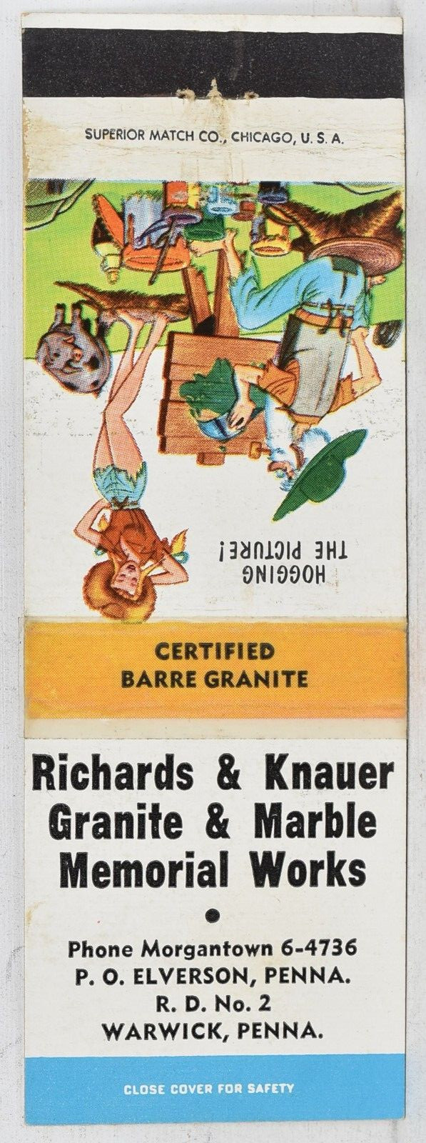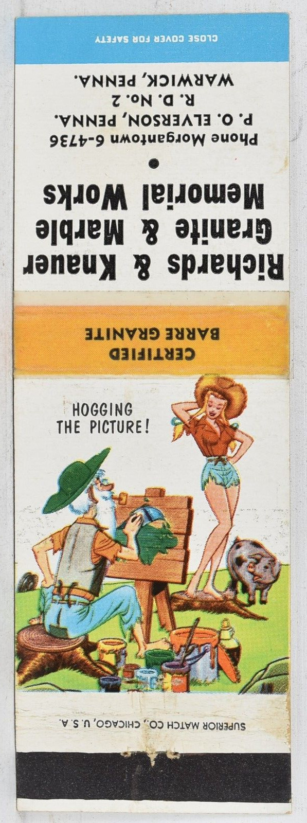 Original Vintage 1950s Richard & Knauer Granite & Marble Memorial Works Elverson Warwick Pennsylvania Matchbook Cover measures 4.5" x 1.5" openCheck out my other Antiques and Collectibles. I give discounts on multiple purchases and combine shipping.Stored in Q-21