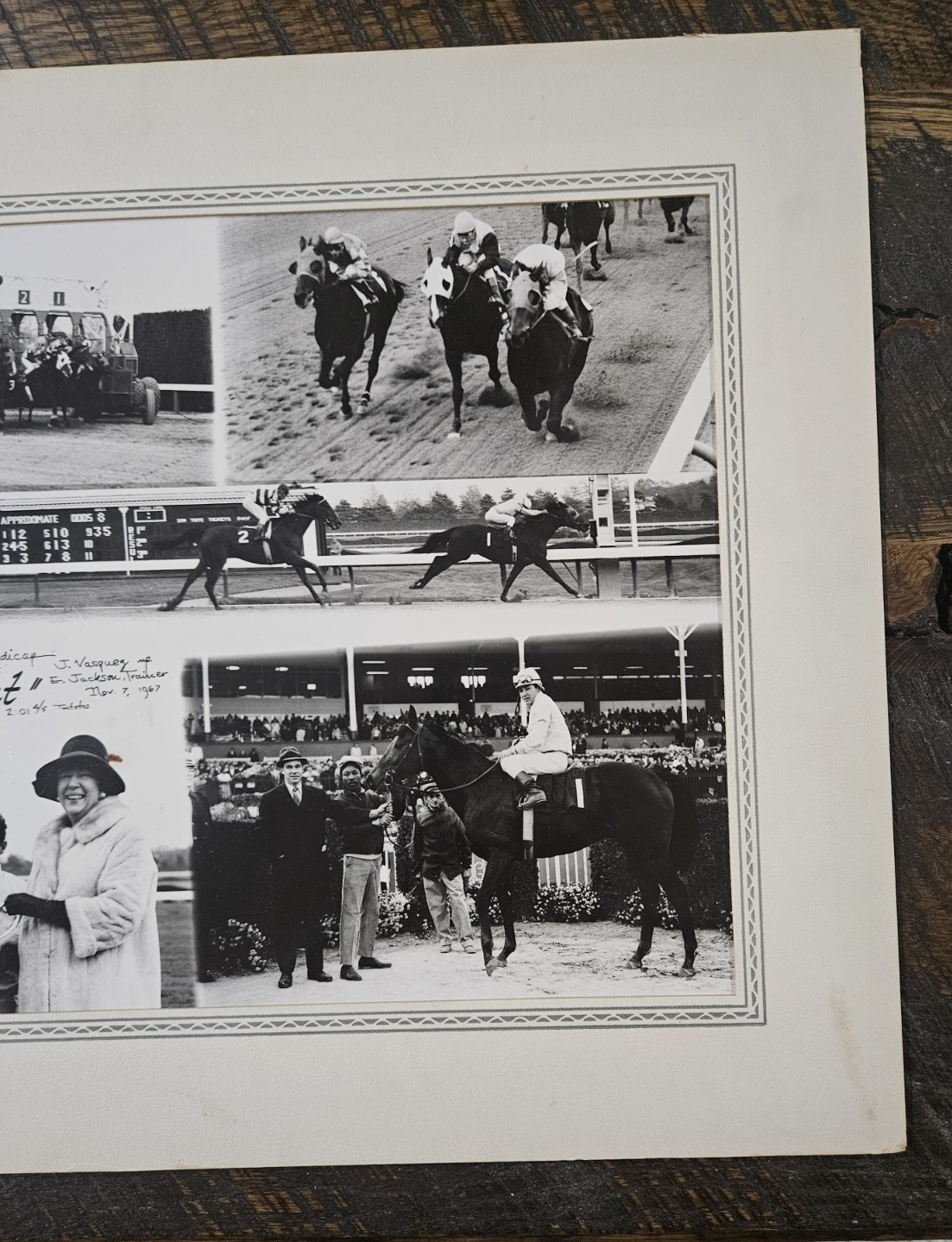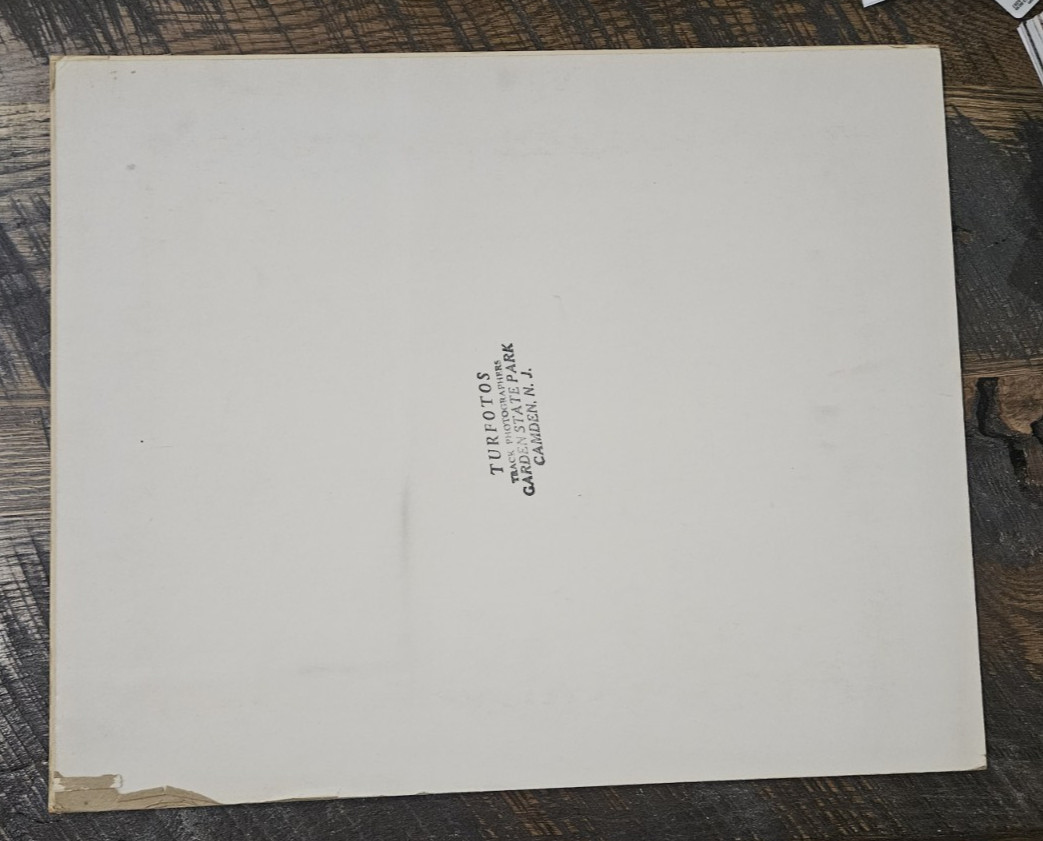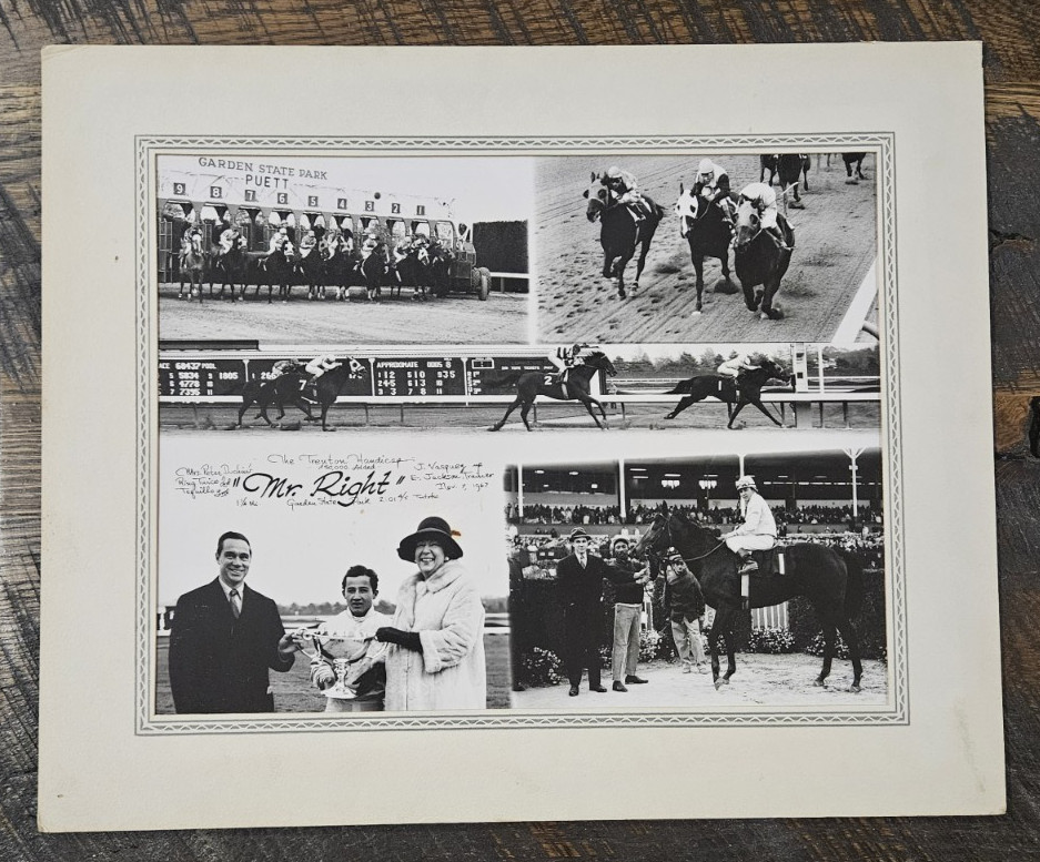 Oversized vintage and original winner's circle photo of Mr. Right winning the $50,000 Trenton Handicap at Garden State Park in 1967. Mr Right was one of the top horses of the era who won the Santa Anita Handicap and the Woodward Stakes. He finished just behind the great Dr. Fager in the 1968 Brooklyn Handicap won by Damascus. This is pretty large with the cardboard frame measuring 14"x17" and the photo is 11"x14" (slightly less is visible). It's in great condition with just some light wear on the frame, mostly on the corners. The photo itself has great gloss and is not faded at all. There is a few very light scratches to the photo and a couple brownish spots in the trophy presentation (the biggest spot being next to the woman's hat). Really a cool piece with five separate images in the collage.Please review the photos and use the magnify feature to review the condition. We guarantee satisfaction with the racing items we sell, so if you are not happy with it then it can be returned for a full refund, assuming it is returned in the same condition of course. Shipping is $14.95 and this will be shipped well protected in a box. We are always happy to combine shipping on multiple items. If you are buying multiple programs in the same transaction then you only pay shipping on the first one and the rest are free! Please see our other auctions for an extensive collection of historic horse racing programs, trophies and memorabilia featuring horses like Secretariat, Seattle Slew, Dr. Fager, Damascus, Dan Patch, Buckpasser, Kelso and other champions and Kentucky Derby winners. We will be selling off most of our collection over the next couple months.