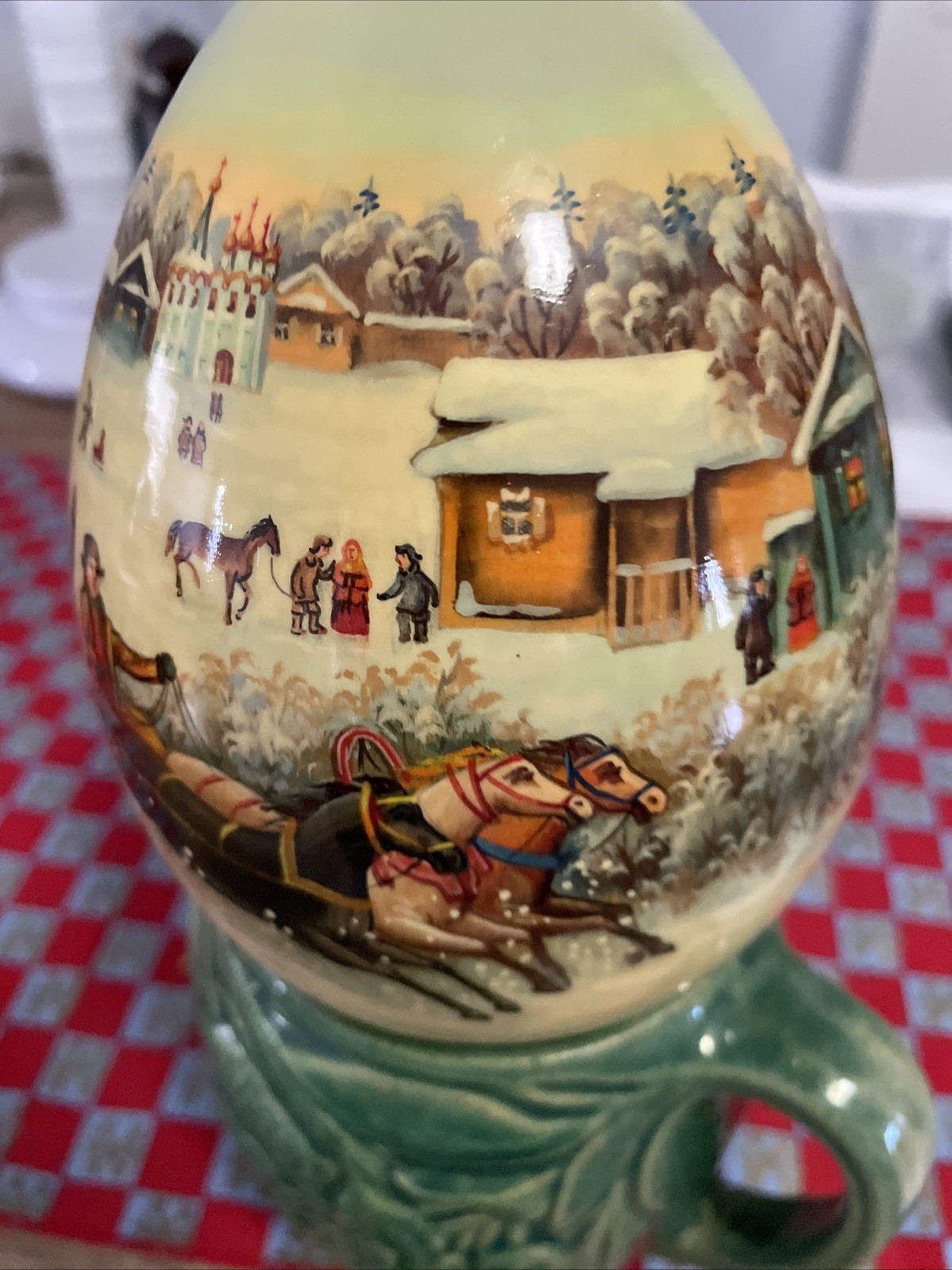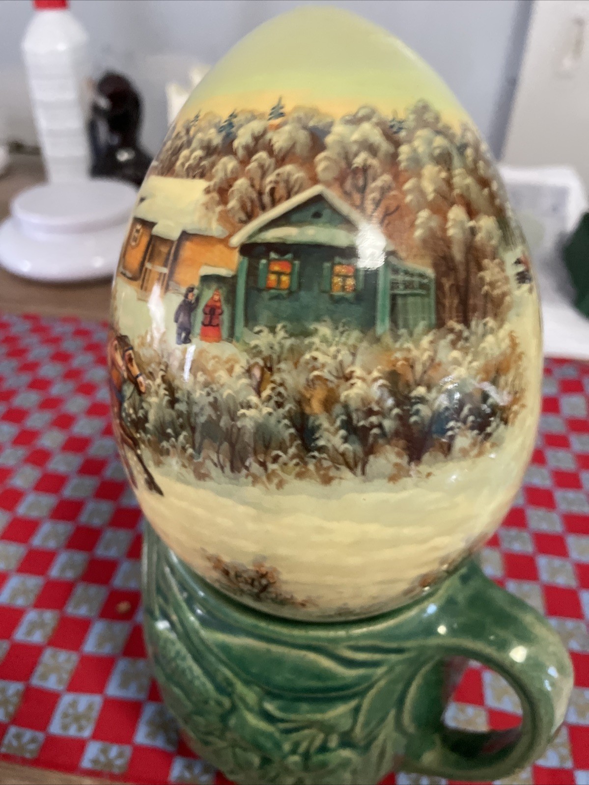 This vintage Russian hand-painted lacquered Christmas egg is a collectible decorative piece. It is signed and measures about 6 inches; check the listing for details on the exact signature and any included stand or packaging. Condition is used, so expect possible light wear from age and prior display; review the photos and description for specific marks, chips, or finish imperfections. Free shipping is included, and it will be packed securely for transit. If you need confirmation of any details, check the listing for details.
