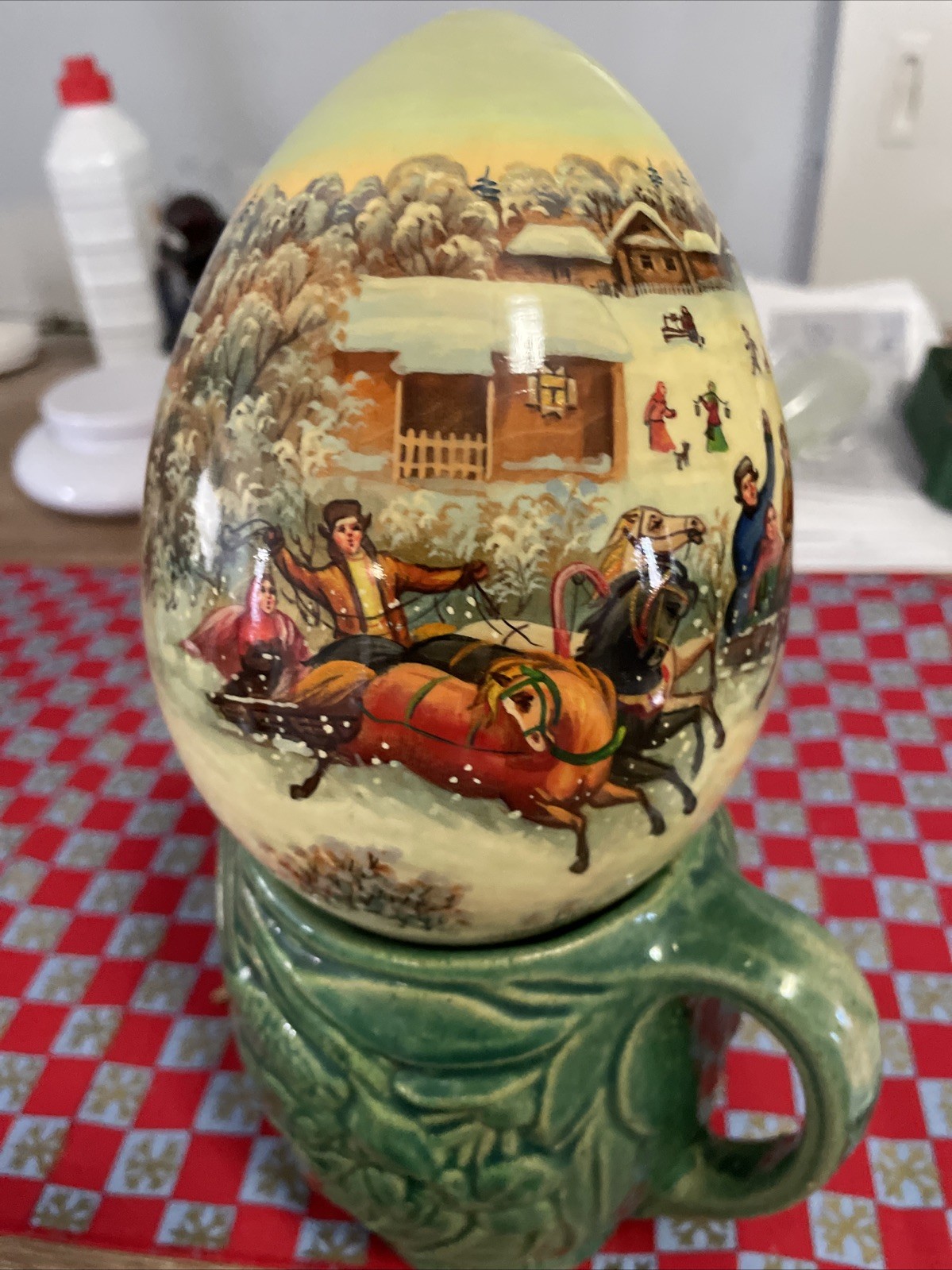 This vintage Russian hand-painted lacquered Christmas egg is a unique collectible piece standing at 6 inches tall. Made with care and precision, this handmade egg showcases traditional Russian cultural elements and festive holiday scenes. With a provenance of origin from the Russian Federation, this signed piece adds a touch of authenticity and charm to any collection of Russian cultural artifacts. Perfect for those who appreciate traditional craftsmanship and cultural heritage.