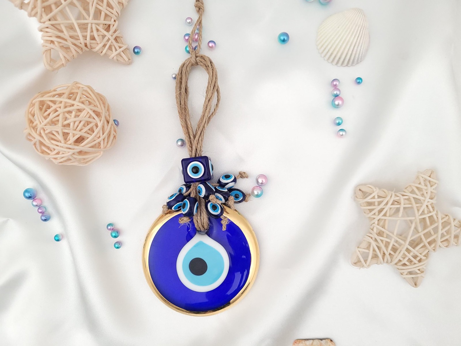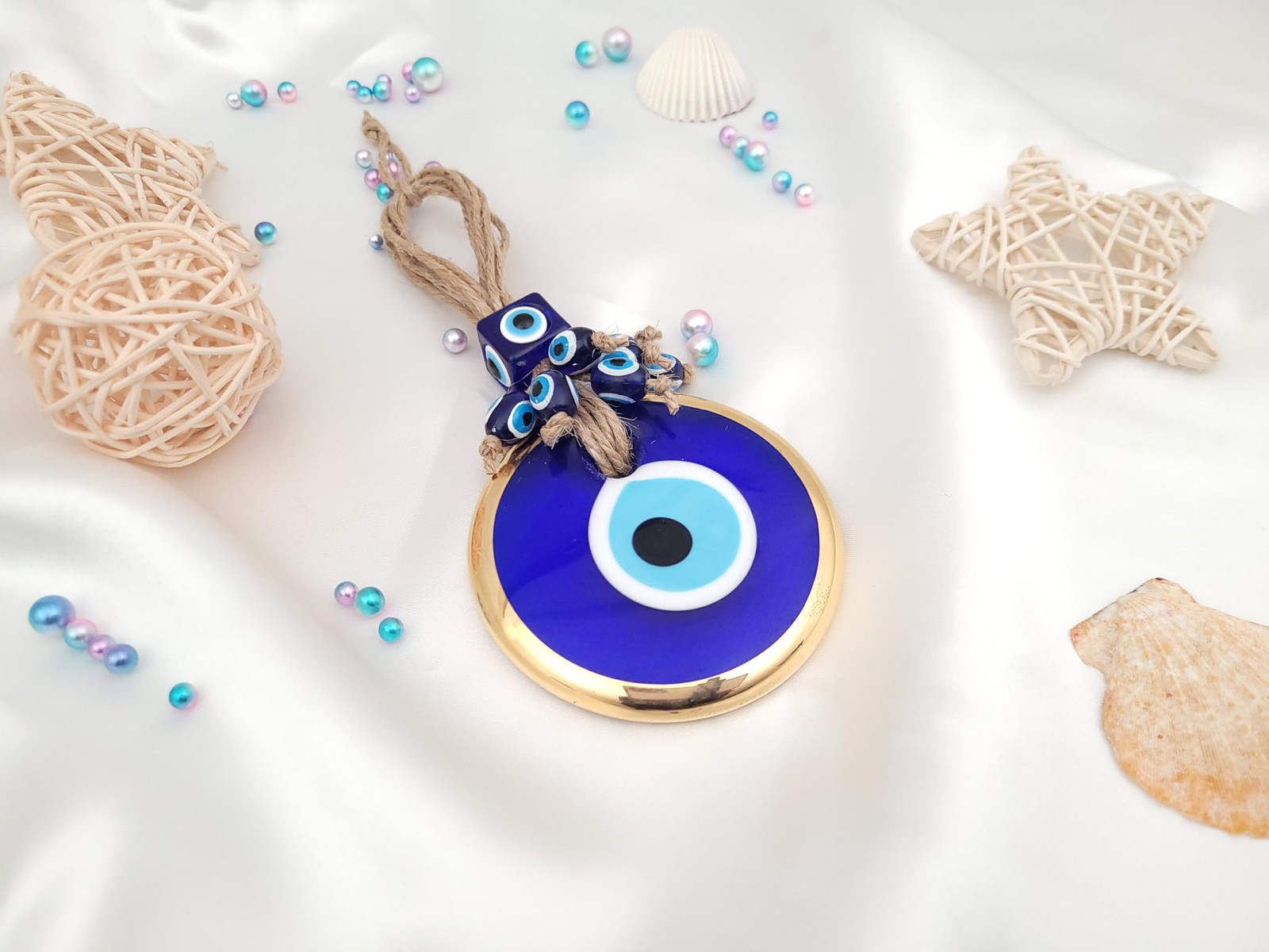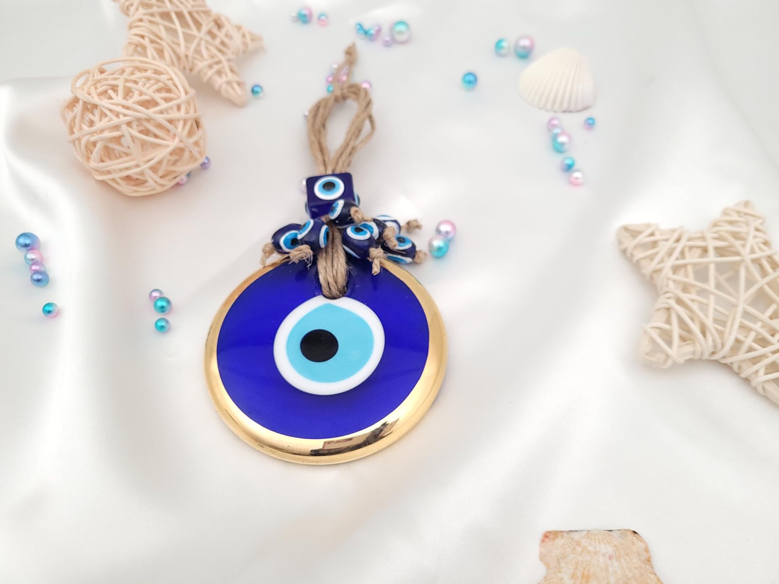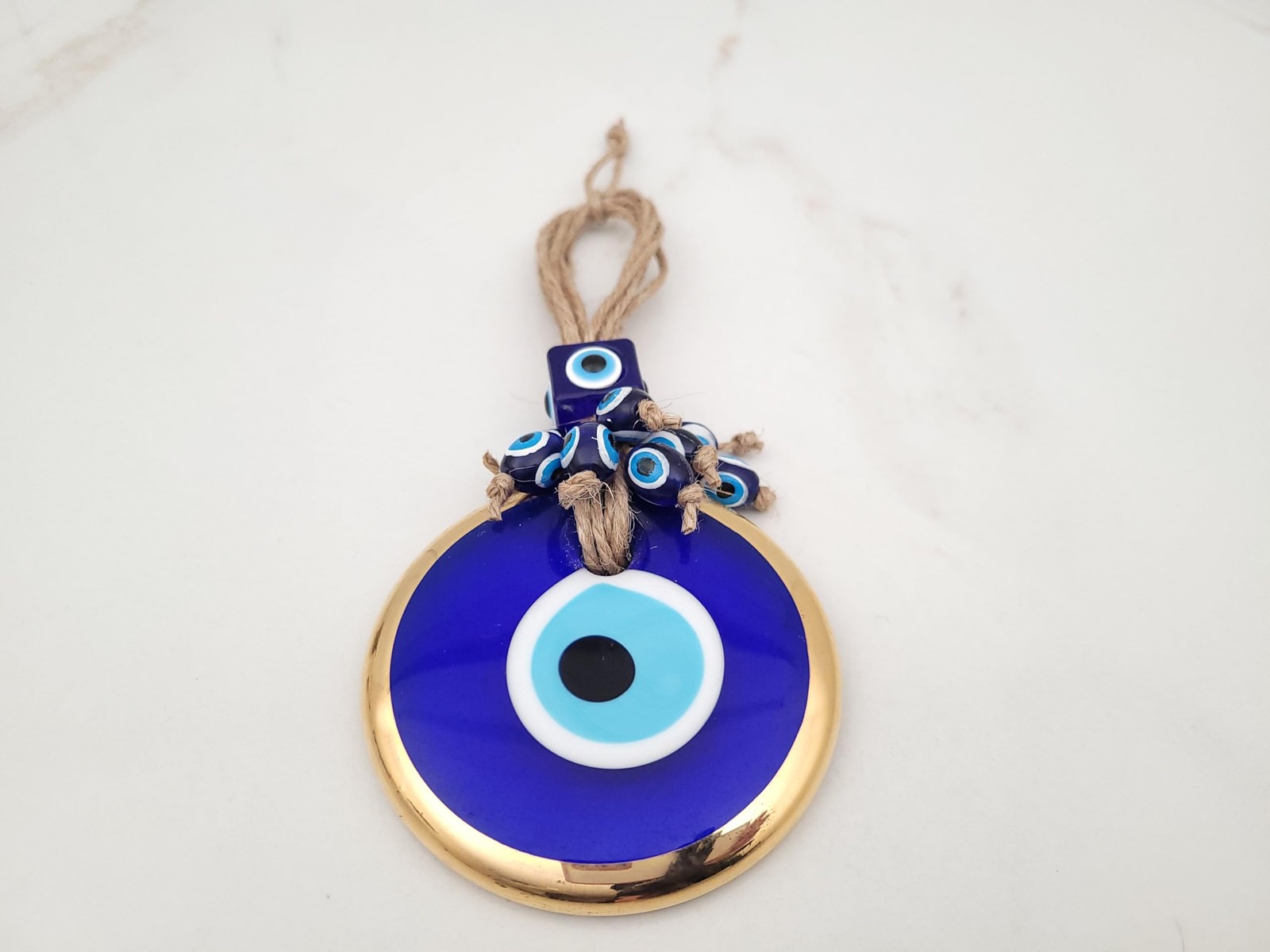 Turkish evil eye beads are made in furnaces called "quarry". Quarry pine wood is used to provide high energy in the quarries. Waste glass and coloring materials are placed in special compartments located inside the quarry and it is turned on. As the temperature of the quarry reaches a temperature of about 1000 ° C, waste glass and coloring matter melts and masters begin to produce. Blue, white, yellow, green, purple, brown and red colors are used in the production of evil eye beads. During the production, various tools are used which are sindirgısıdır iron, merdan, asaba, rail iron, steel bar, merteke and mold. Bead mastering, which has reached today by transferring the skills in master-apprentice relationship, is a traditional profession. In Turkey, it is known by the name nazar boncugu and known by the name ojo turco in Spain.Evil eye, also known as the nazar boncugu, is believed to be protective in Turkish and Greek culture. The nazar bead, which is believed to protect from bad energies and emotions, is carried as a home protection or evil eye amulet.The evil eye charm is Made in Türkiye and Turkish glass is used in its material068The diameters of the evil eyes bead which is blue and gold; 3.5” (9cm), 8” (20cm).The package contains two same sizes evil eye beads. Nazar amulet is produced in a classical style. Due to the fact that each product is handcrafted, there may be a slightly different hue and pattern difference among different products.Perfect for Gift: Evil eye decor and charm ornament to your loved ones. You can also use it as home decor, evil eye wall hanging decoration, nazar amulet, blessing, party decoration and protection for outdoor, interior door, office, wall decor eye.