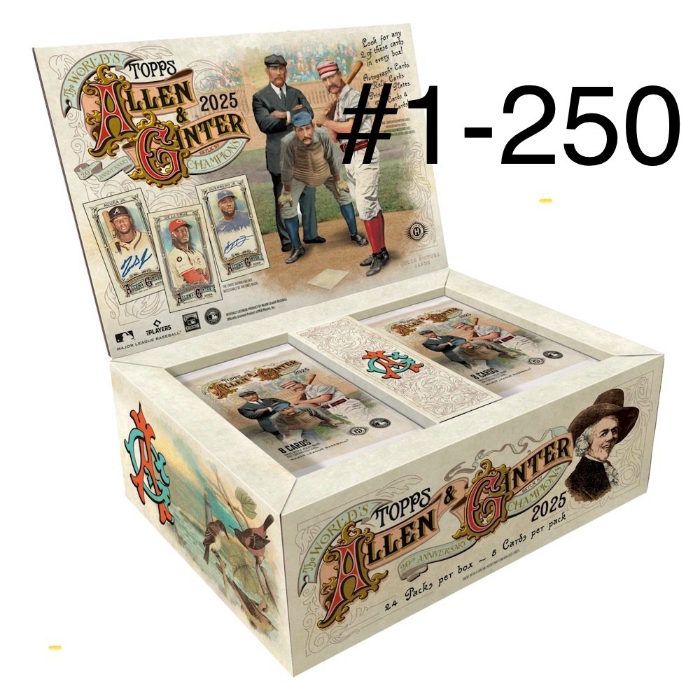 The product is a set of 2025 Topps Allen & Ginter baseball trading cards, featuring a variety of players including Corbin Carroll, Adley Rutschman, and Lou Gehrig. These standard-sized cards are made of card stock and belong to the Major League Baseball league. The set includes base cards for teams like the New York Yankees, Seattle Mariners, and Baltimore Orioles, among others. Manufactured by Topps in the United States, these cards are in English and are not autographed. Perfect for collectors looking to complete their set of baseball trading cards from the 2025 season.This listing is for cards 1-250. These are the regular sized cards. I will ship using an eBay pocket envelope but if it’s a larger order I may ship using a padded envelope or box I will combine shipping if you purchase from any of my other Allen & Ginter listings - past years and present