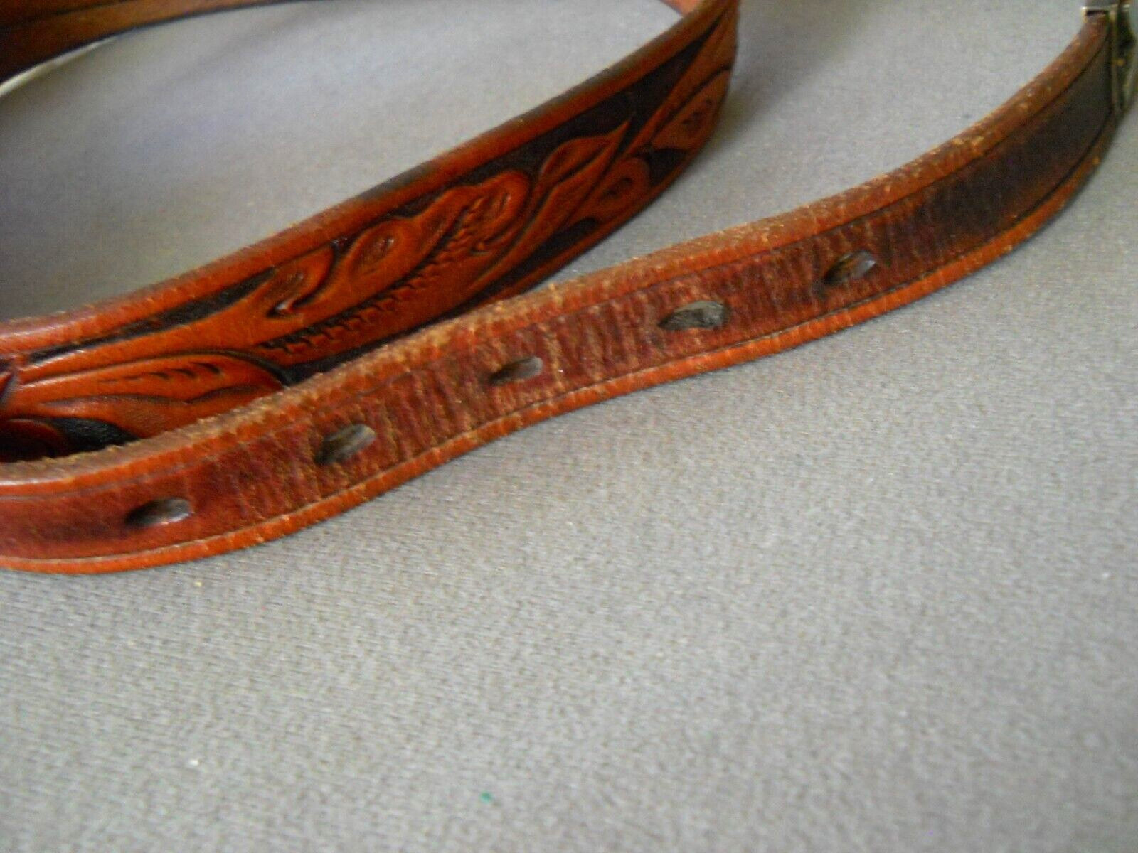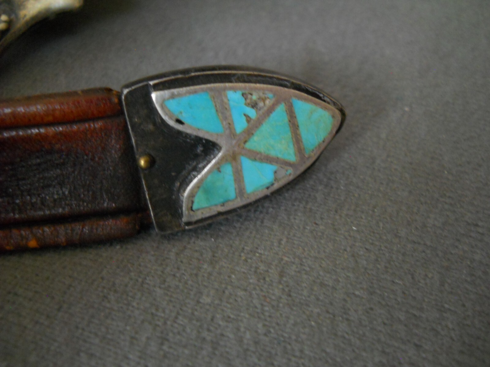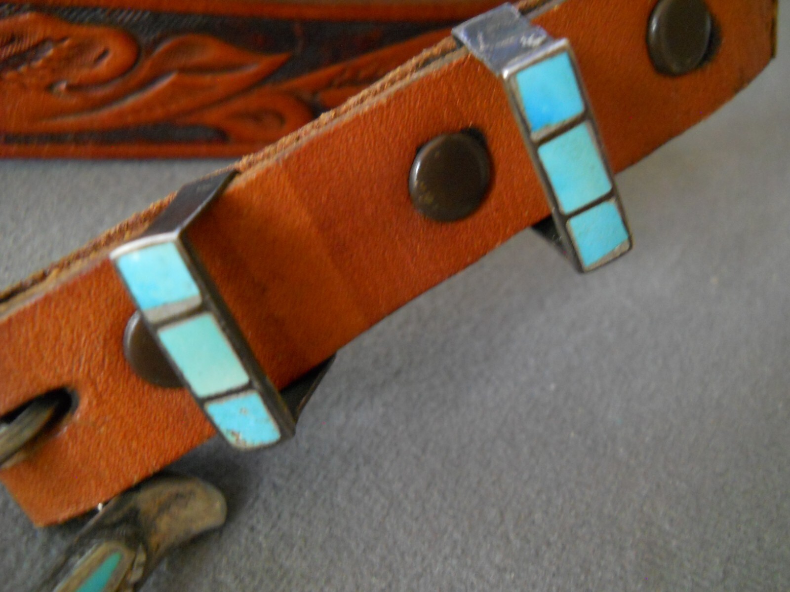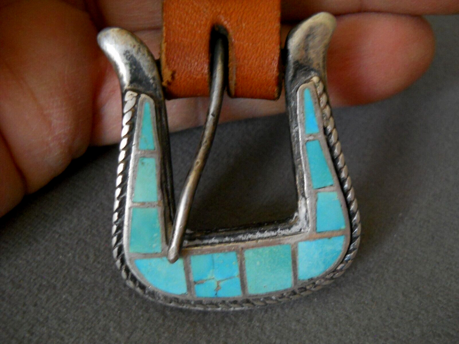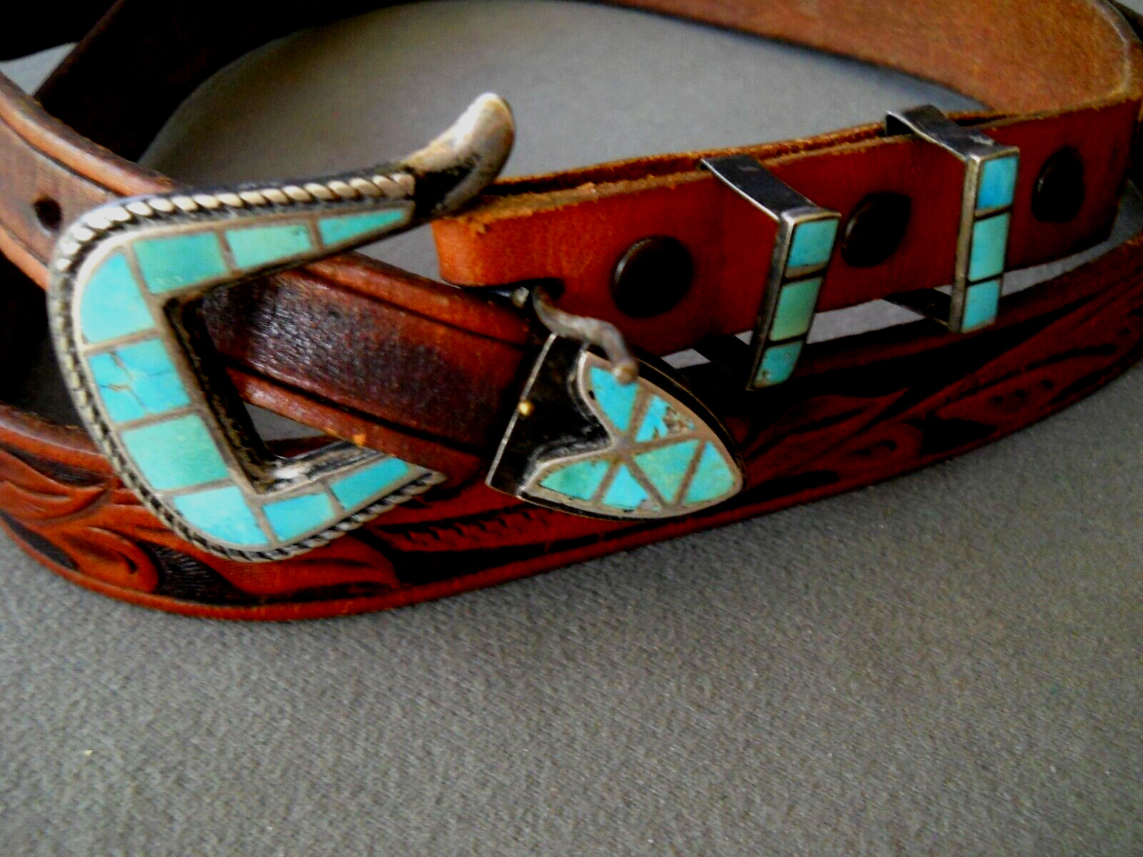 Please Read the Listing Description and Store Policies Thoroughly & See All Pictures for More Details Before Making your PurchaseWe welcome questions, so please don't hesitate to contact us. We may not always be available on weekends and/or holidays, but we will respond to your message, in the order it was received, when we return to the office. Item: OLD Native American Zuni Blue Turquoise Inlay Sterling Silver Ranger Set Tan Tooled BeltSku: 10755BEMArtist: Shop/Brand:Markings on the piece: NoneStone(s): Beautiful aqua (blue /green) turquoise stones flushed inlaid into silver channelsWeight: 106.1 gramsHeight: Buckle is just over 1 1/2"Width: Buckle is about 1 3/4"Depth:Length: Gap: Total Circumference: 43 7/8" from end to end, and 36 1/2" - 40" from first to last hole (there's a little room for an extra hole at the end of the strap)Clasp: Pin buckle with keepers that can accommodate straps just shy of 3/4" or straps that taper to this sizeRing Size:Belt Size: Not markedAdditional notes: The partial, slight split in the leather could be easily fixed with epoxy. Also, depending on your body type, it may be covered when worn. Other than that, the belt is nice.USPS has increased their prices, so we will slowly be updating our shipping cost to $14 for flat rate priority including signature confirmation as well, due to too many pieces being marked as delivered but buyers not receiving it. Any price discrepancy between or pieces are due to this gradual shipping cost update, and the higher cost will eventually apply to all listings.All measurements are approximations. Please, carefully measure your wrist, decolletage, finger, and waist or use an old bracelet, necklace, bolo tie, belt and so on, to determine your size. Returns due to