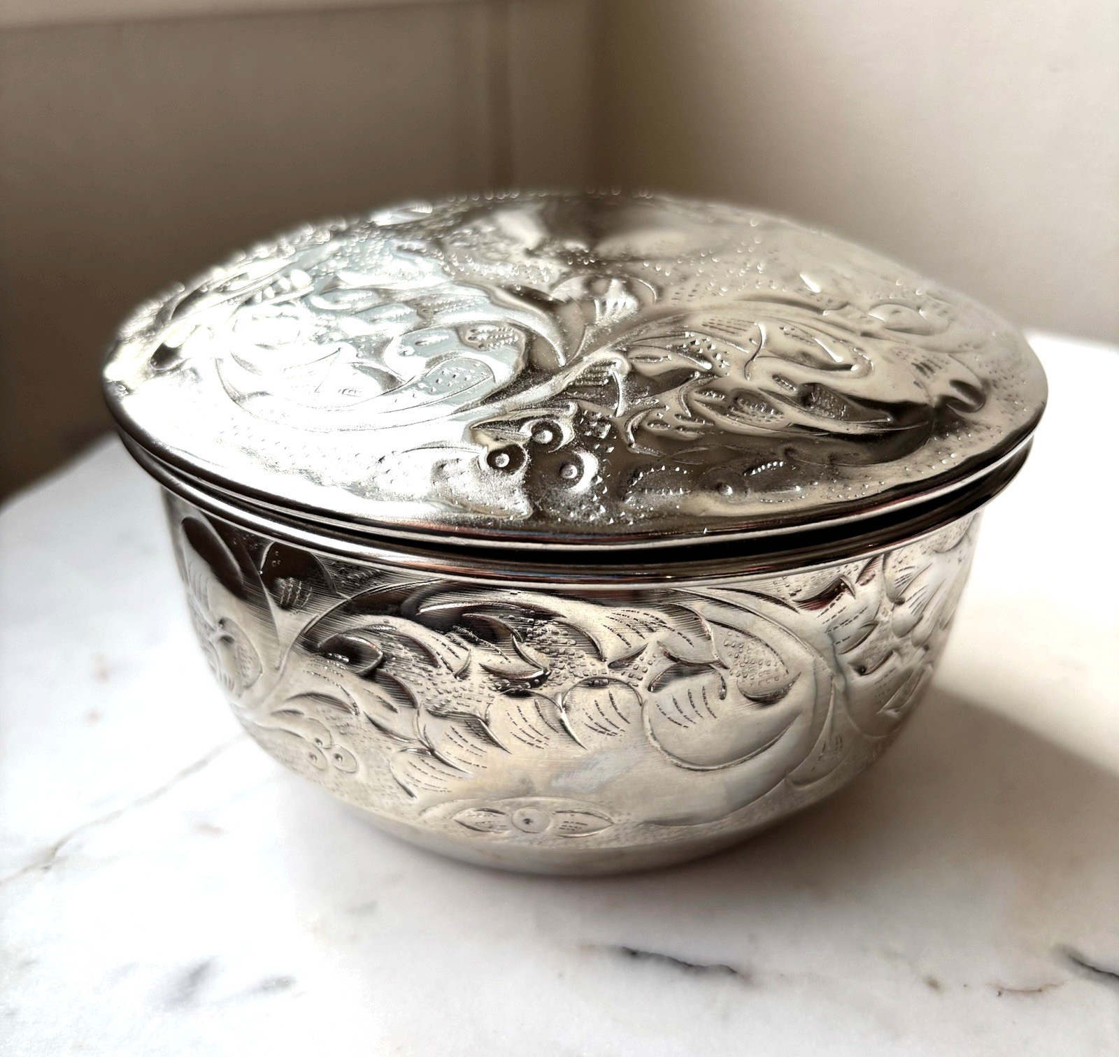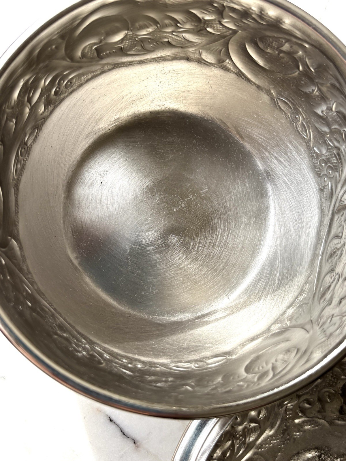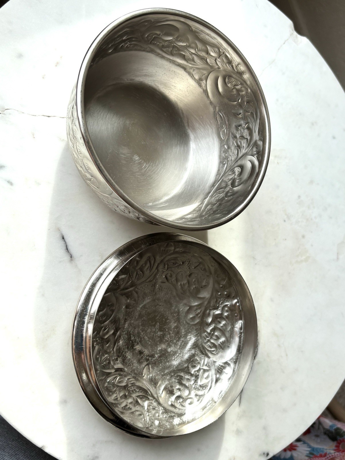 This Vintage Thai Aluminum Bowl with Lid is a unique and handmade piece from Thailand, showcasing traditional Thai culture. The bowl is perfect for storing Betel Nuts or other small items, making it a functional and decorative item for either ceremonial or everyday use. The intricate design and craftsmanship of this piece make it a valuable collectible for those interested in Asian cultures and ethnicities.