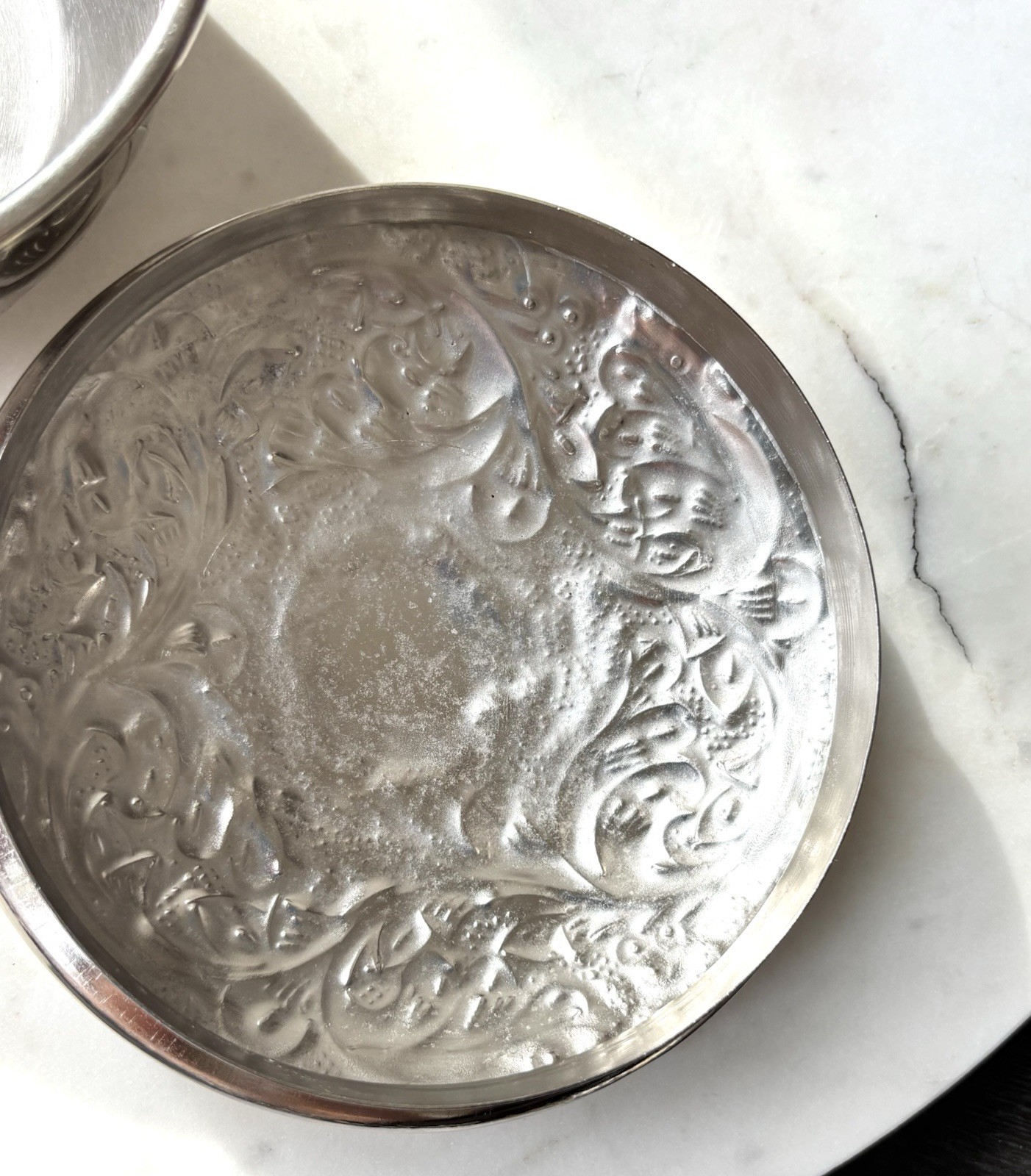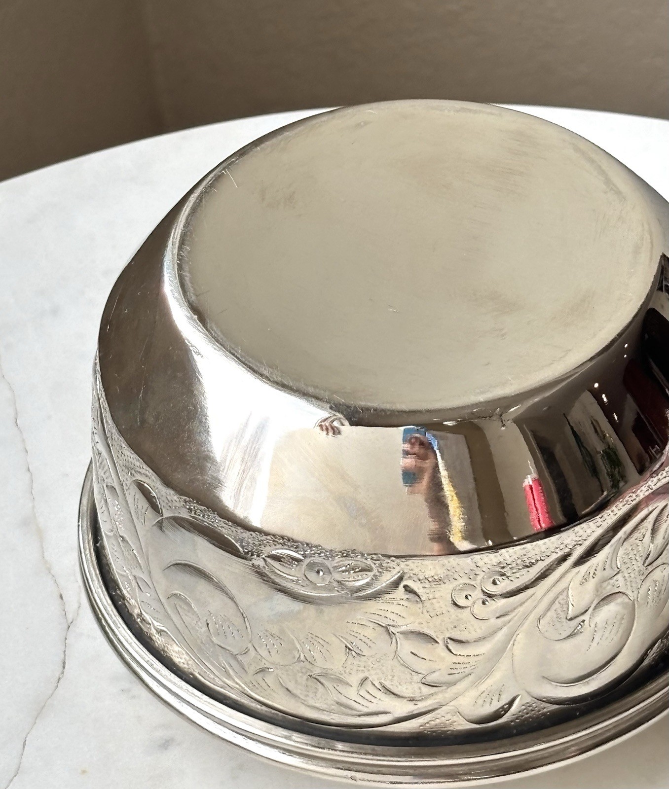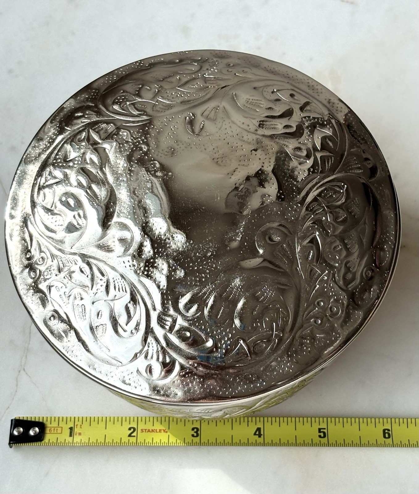 This Vintage Thai Aluminum Bowl with Lid is a unique and handmade piece from Thailand, showcasing traditional Thai culture. The bowl is perfect for storing Betel Nuts or other small items, making it a functional and decorative item for either ceremonial or everyday use. The intricate design and craftsmanship of this piece make it a valuable collectible for those interested in Asian cultures and ethnicities.