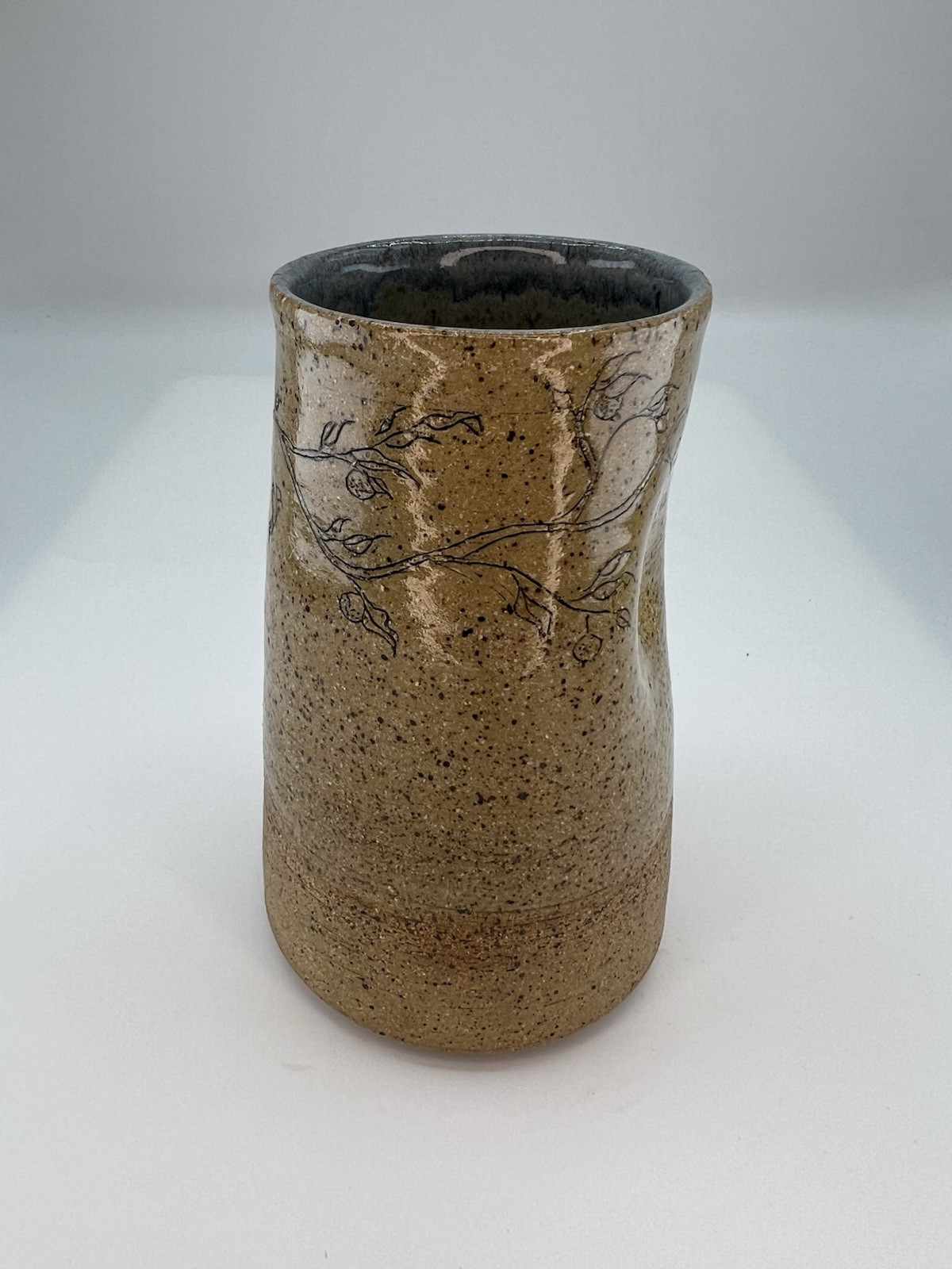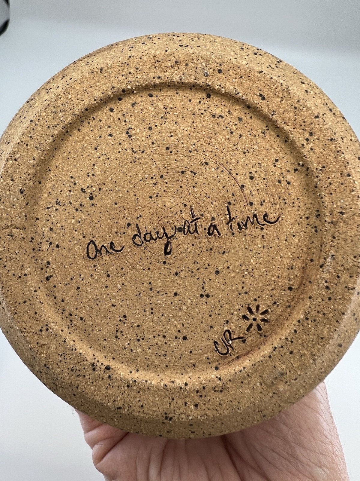 OFFERS WELCOME!Folk Art Sandstone Pottery Vase “One Day At A Time” Fauna Print Artist Signed