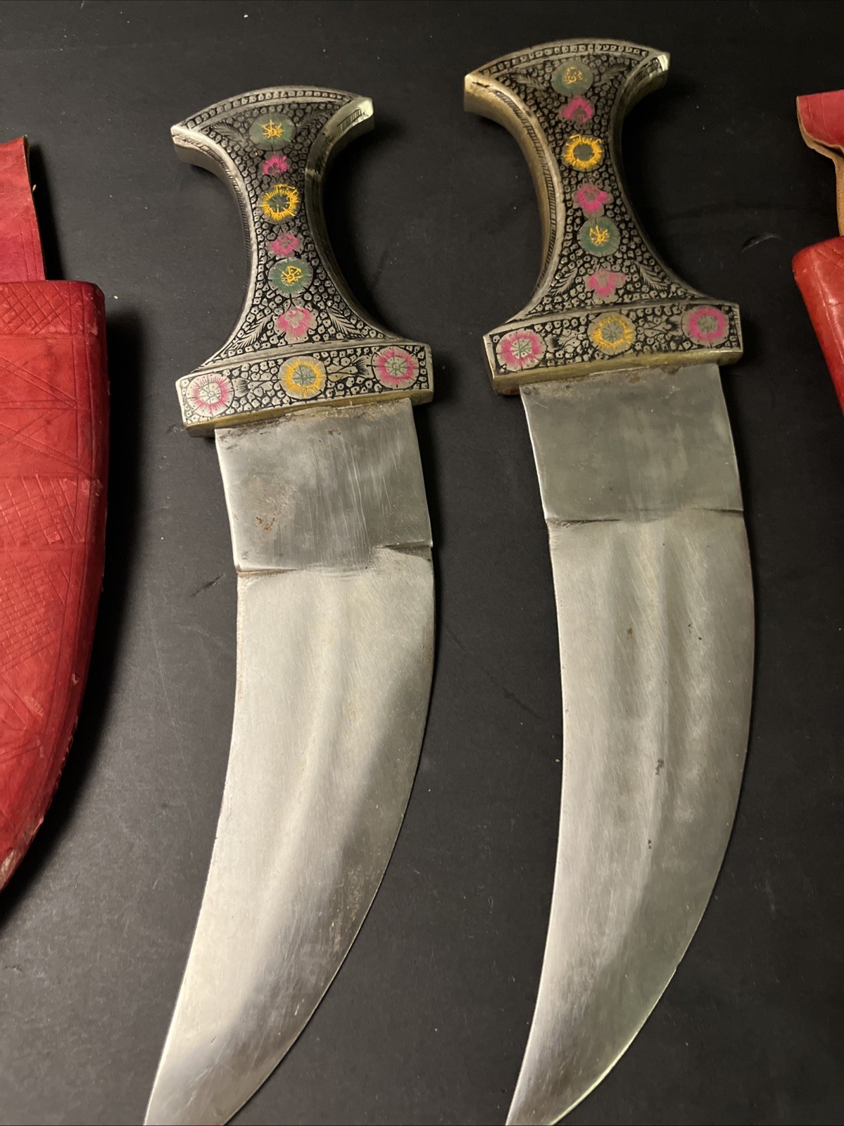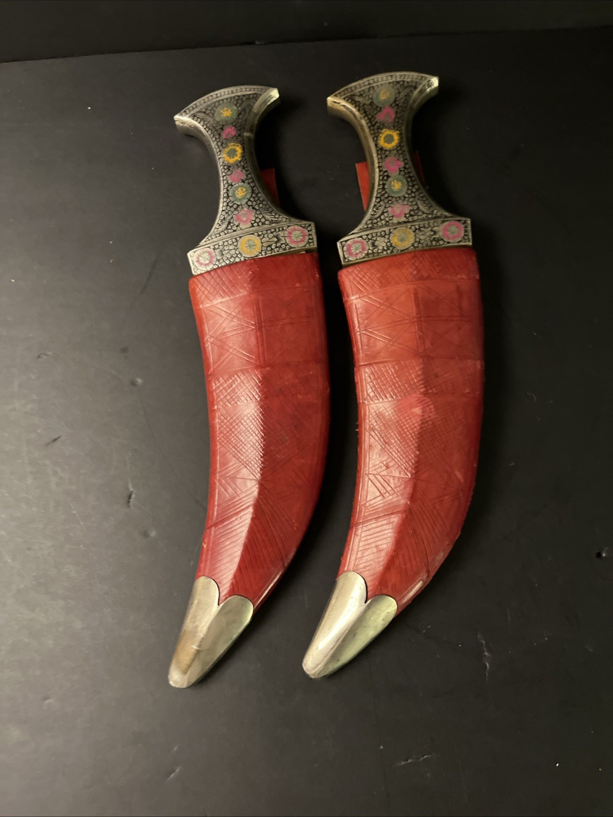 This listing includes two vintage large antique Yemeni jambiya handcrafted daggers from the Collectibles category. The item is in good used condition; please review the photos for the exact condition and any signs of age or wear. Check the listing for details on materials, measurements, and any included accessories, as specifications are not provided here. Free shipping is included with purchase. If you need confirmation of what is included or want closer images of specific areas, check the listing for details.