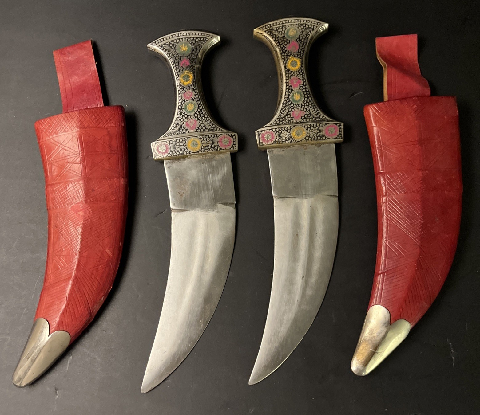 Crafted with meticulous care, these two vintage large antique Yemeni Jambiya are a testament to the rich heritage and skilled craftsmanship of Yemeni artisans. Each dagger is a unique masterpiece, with handles and sheaths that boast intricate designs, reflecting the wearer's status and cultural identity. Whether for display or as a functional piece, these jambiya embody the traditional artistry of Yemen. The set is an excellent addition to any collection of Middle Eastern artifacts or as a striking decorative piece that adds a touch of history and elegance to any space.