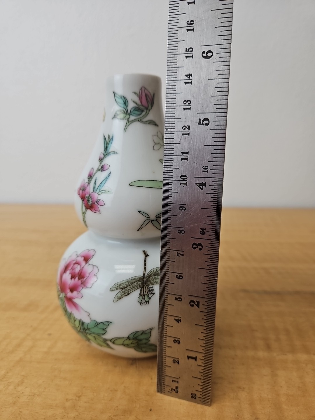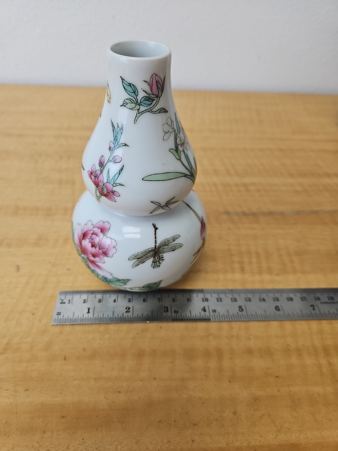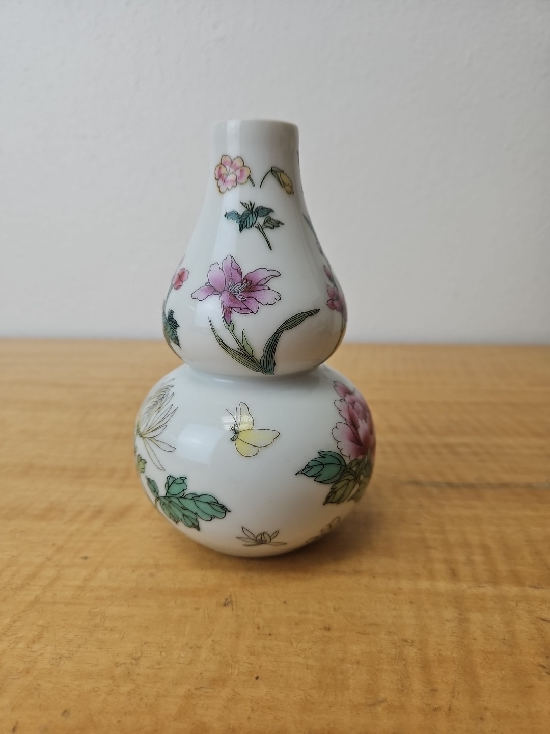 This Chinese double gourd porcelain vase is a collectible decorative vase featuring a white background with floral decoration. It measures approximately 5 7/8 inches tall. Condition is listed as "see photos, ask questions"—please review the images closely for wear, chips, cracks, or other details, and contact the seller with any questions before purchase. Free shipping is included. Check the listing for details.