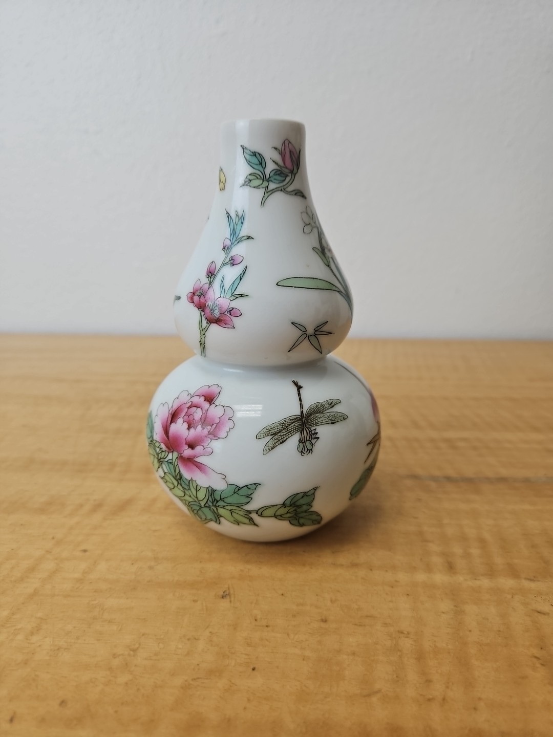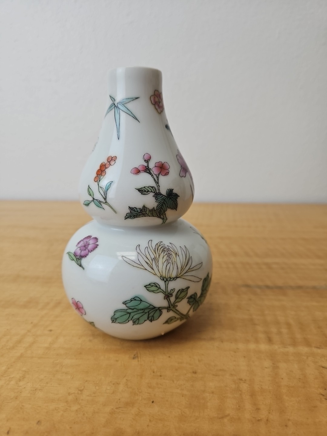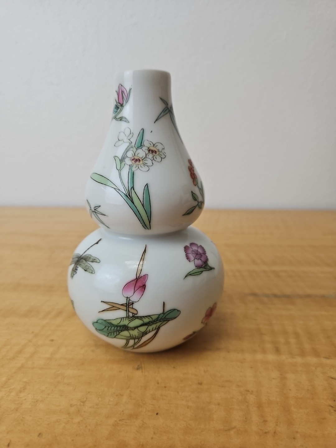 This Chinese double gourd porcelain vase is a collectible decorative vase featuring a white background with floral decoration. It measures approximately 5 7/8 inches tall. Condition is listed as "see photos, ask questions"—please review the images closely for wear, chips, cracks, or other details, and contact the seller with any questions before purchase. Free shipping is included. Check the listing for details.