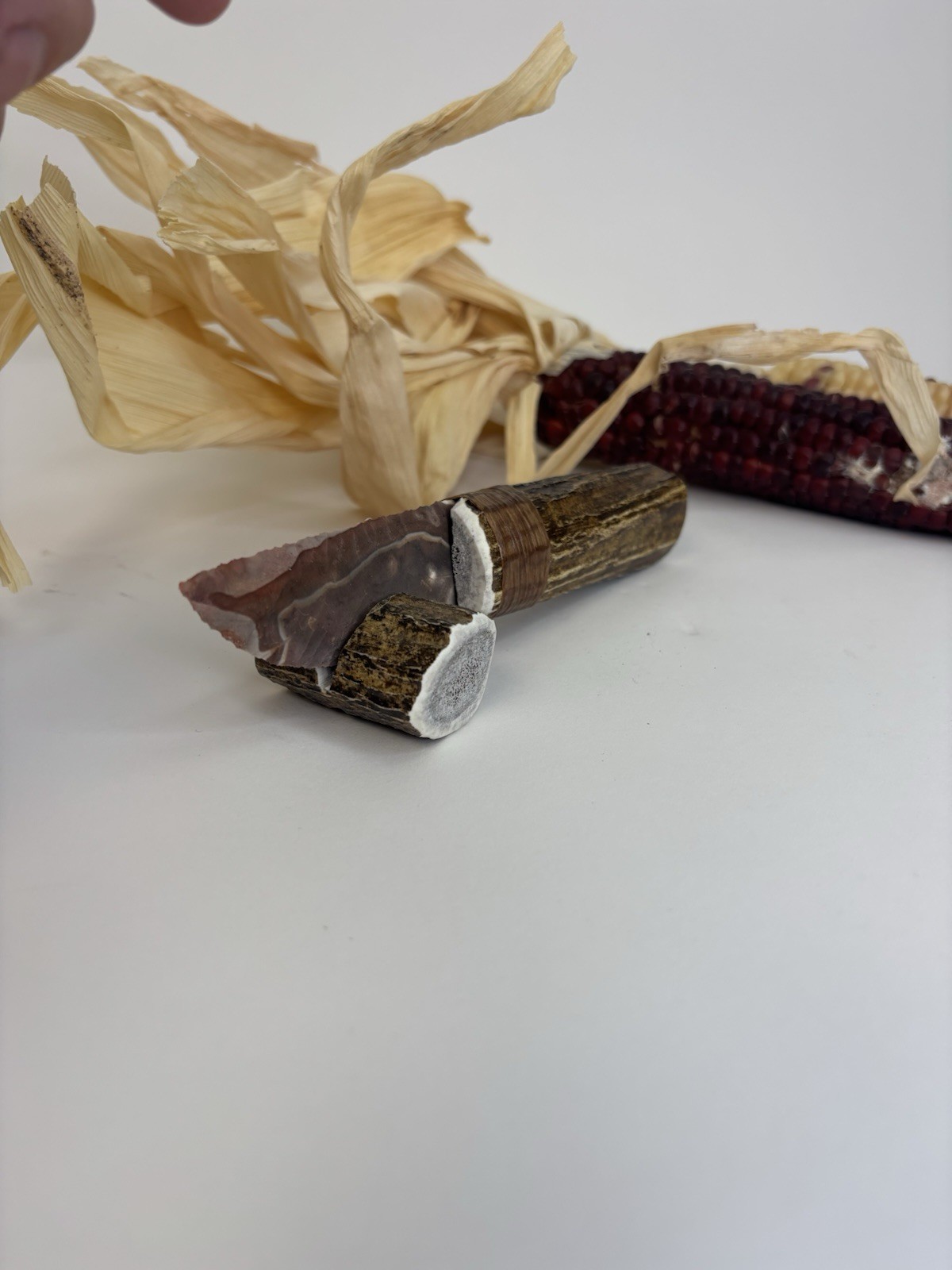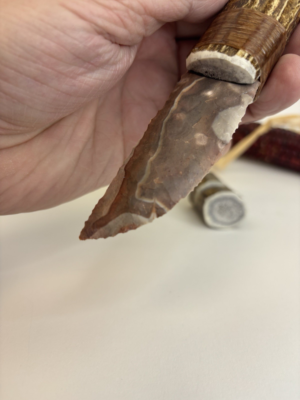 Elk antler handle knifeBlade: bulls eye Jasper from NV, Size: 6 3/4” over allBlade length: 3 1/8”Style: flake over grind Micro serrated flaking edge workShipping is USPS