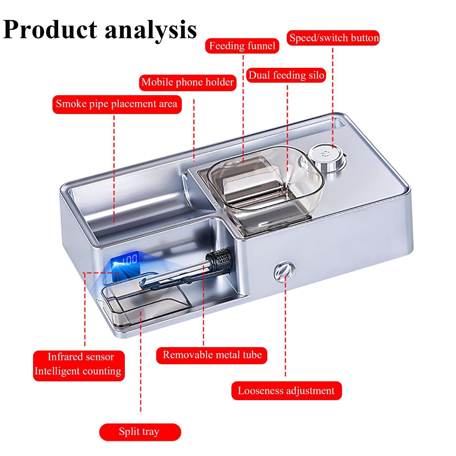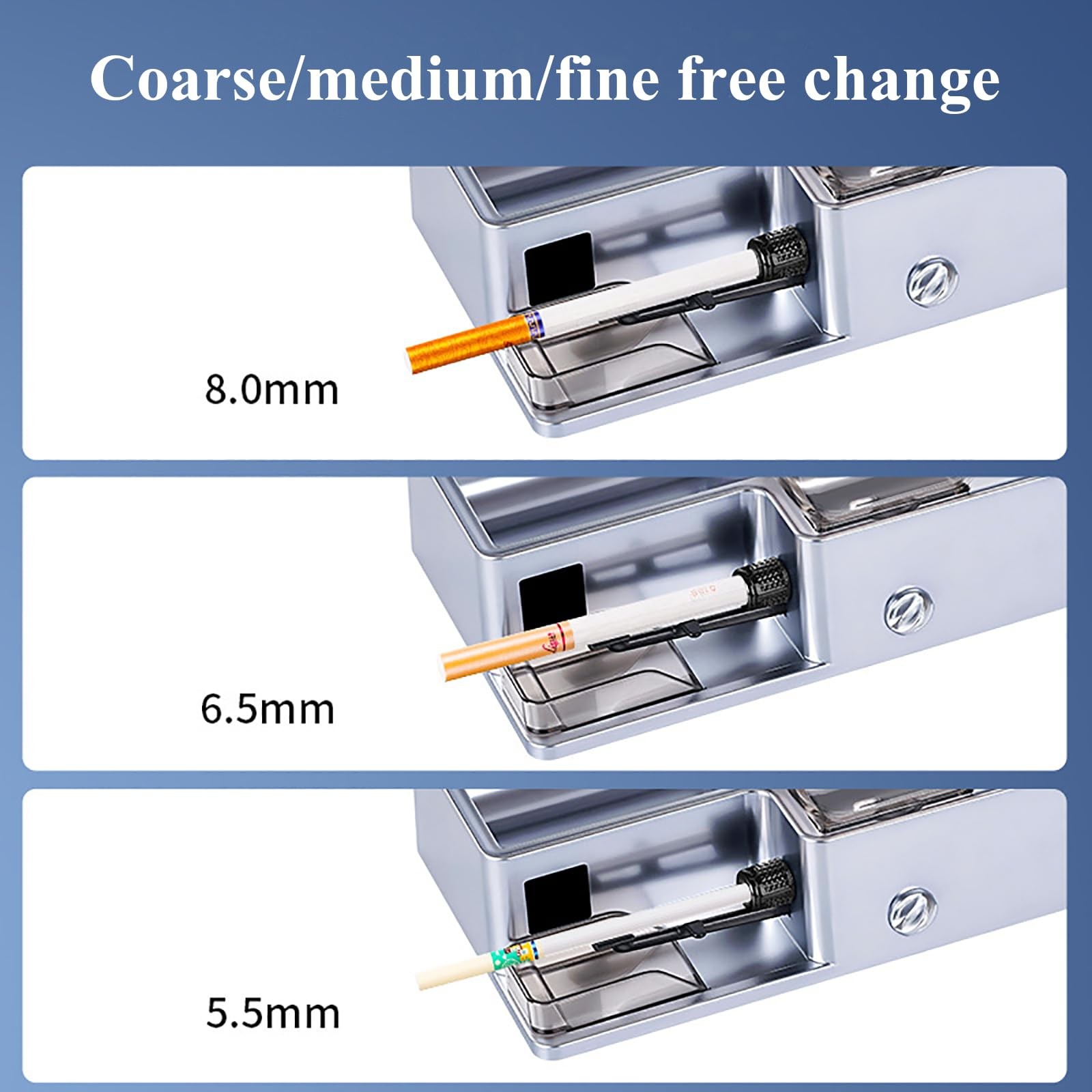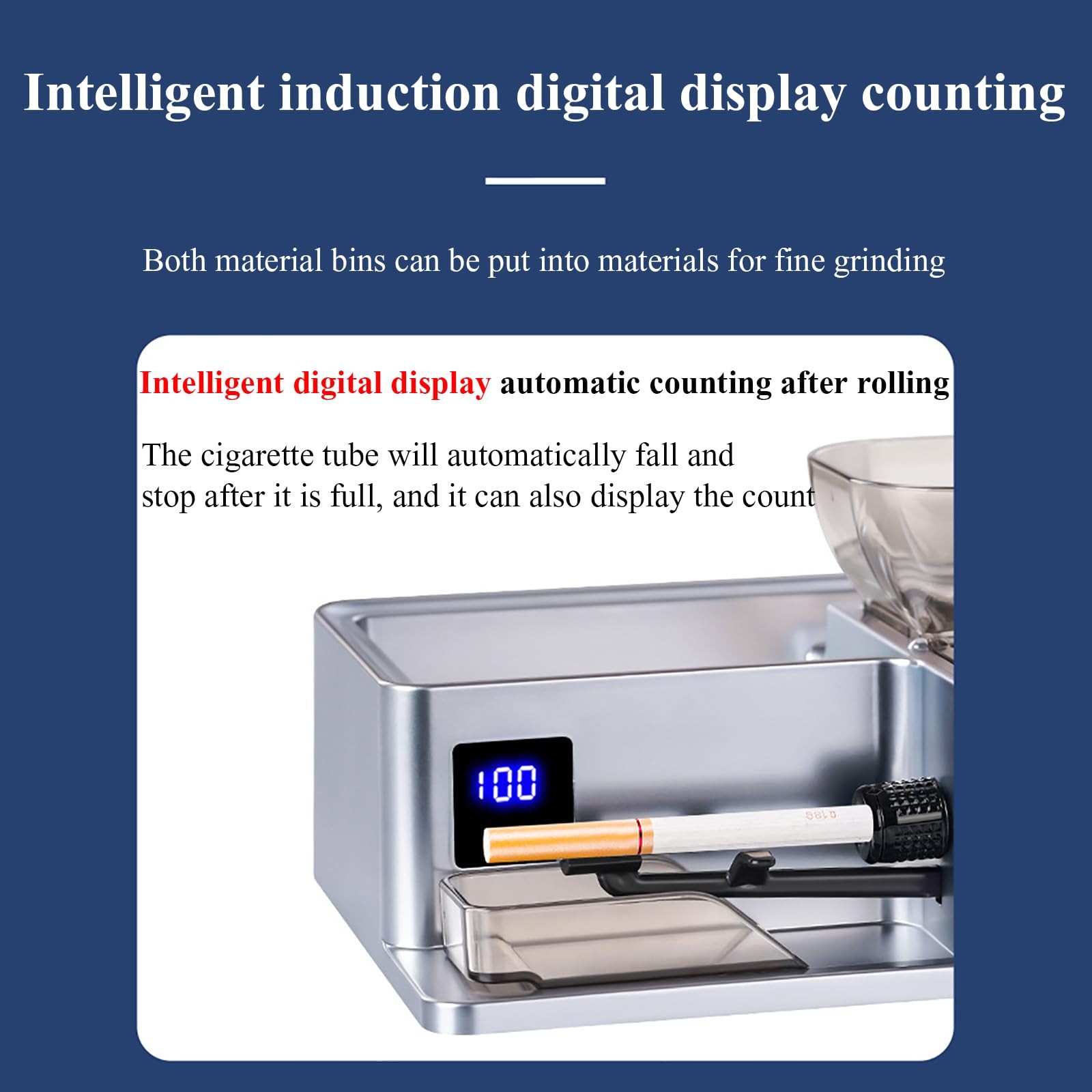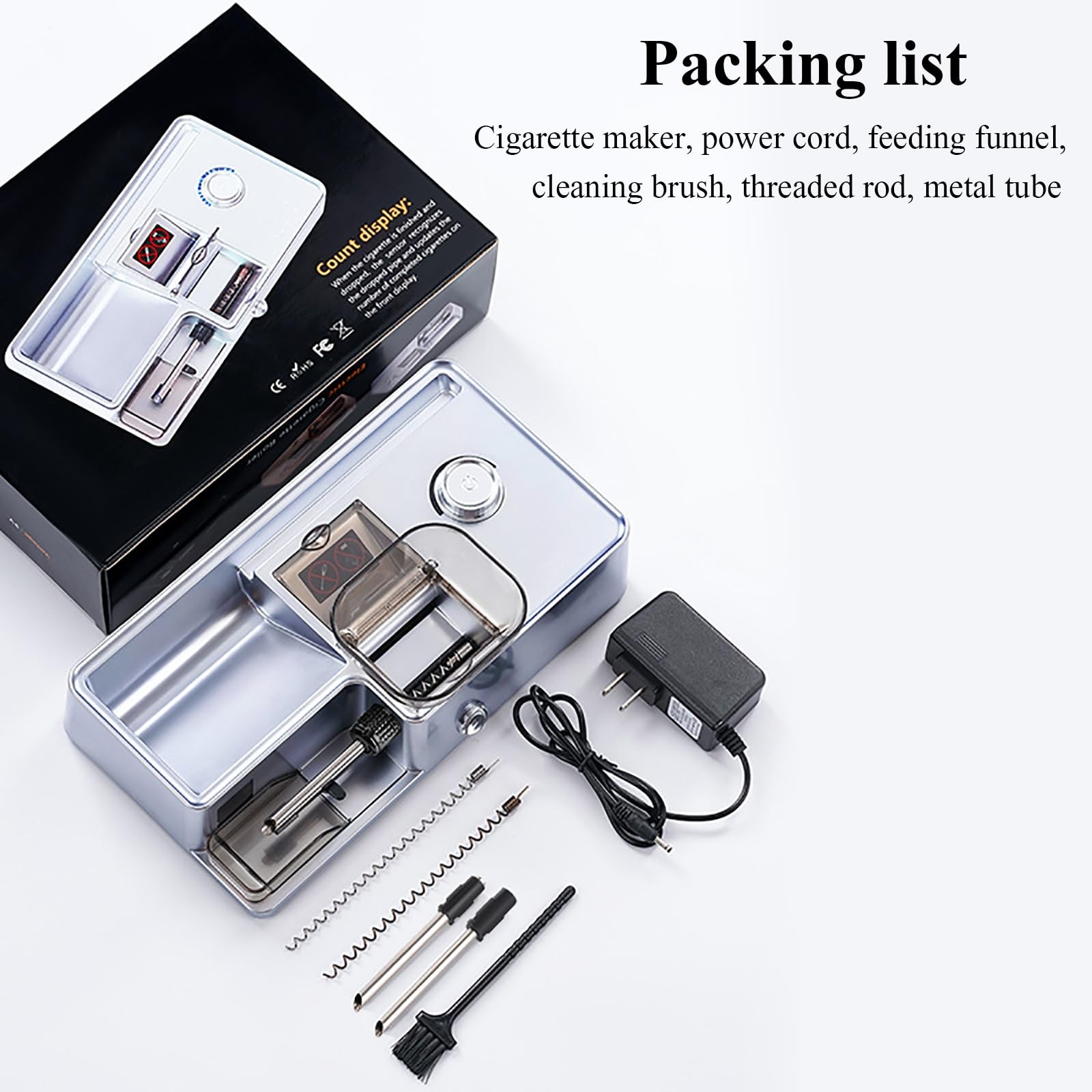 【Electric cigarette machine】Perfect in seconds, simple and fast operation, helping you save time and money. Adjustable speed, controllable tightness, 8,0/6,5/5,5 Mm3 uses.【Smart sensor】LED sensitive intelligent sensing, automatic induction shutdown after the tube is full of materials, avoiding material waste, intelligent counting function design, add 1 after rolling one number, experience a smarter cigarette machine.【Save money】Cigarette prices are rising every year, the best way to save money is to do it yourself, which helps save a lot of money. At the same time, the cigarettes produced by this machine are better than retail cigarettes, no chemicals are added, and the tar content is also less.【Easy to use】The flip hopper is large enough, the aluminum alloy body is sturdy and durable, the machine is deep and quiet, and it is easy and quick to make perfect smoke. The bottom drawer storage box, push-pull design, can be used at any time.【Men's gift】Our cigarette machine adopts a sturdy metal structure, simple operation, wide platform, and stable balance. It is an ideal gift choice for family and loved ones, Father's Day and birthday.Product Name:Household Electric Cigarette MakerColor:Black,Silver (Default Color is Silver Input voltage: 110v-240vWorking current: 2AWeight:900g(with packaging)Tips:We Support US/EU/Australia plug,We will ship according to the country you place your order.Product features:① Infrared sensing, automatic power outage;② High power motor;③ Adjustable filling tightness4.Dual-purpose 6.5mm-8mm, detachable and replaceableNote: 1.Please allow 0-1cm error due to manual measurement. pls make sure you do not mind before you bid.2.Due to the difference between different monitors, the picture may not reflect the actual