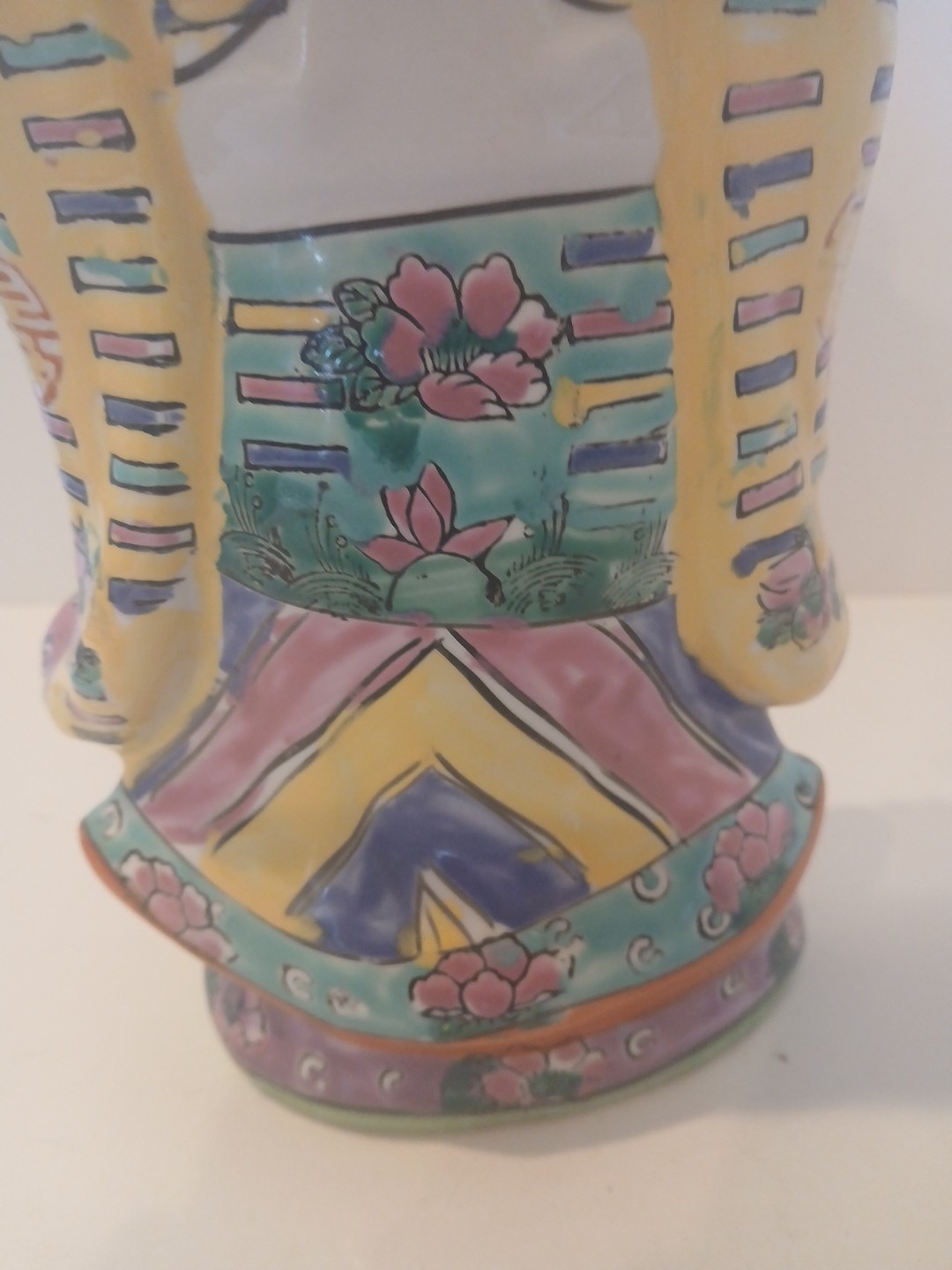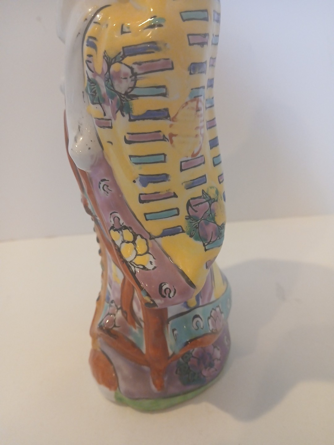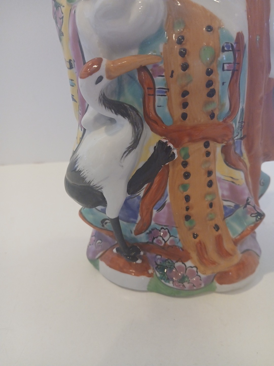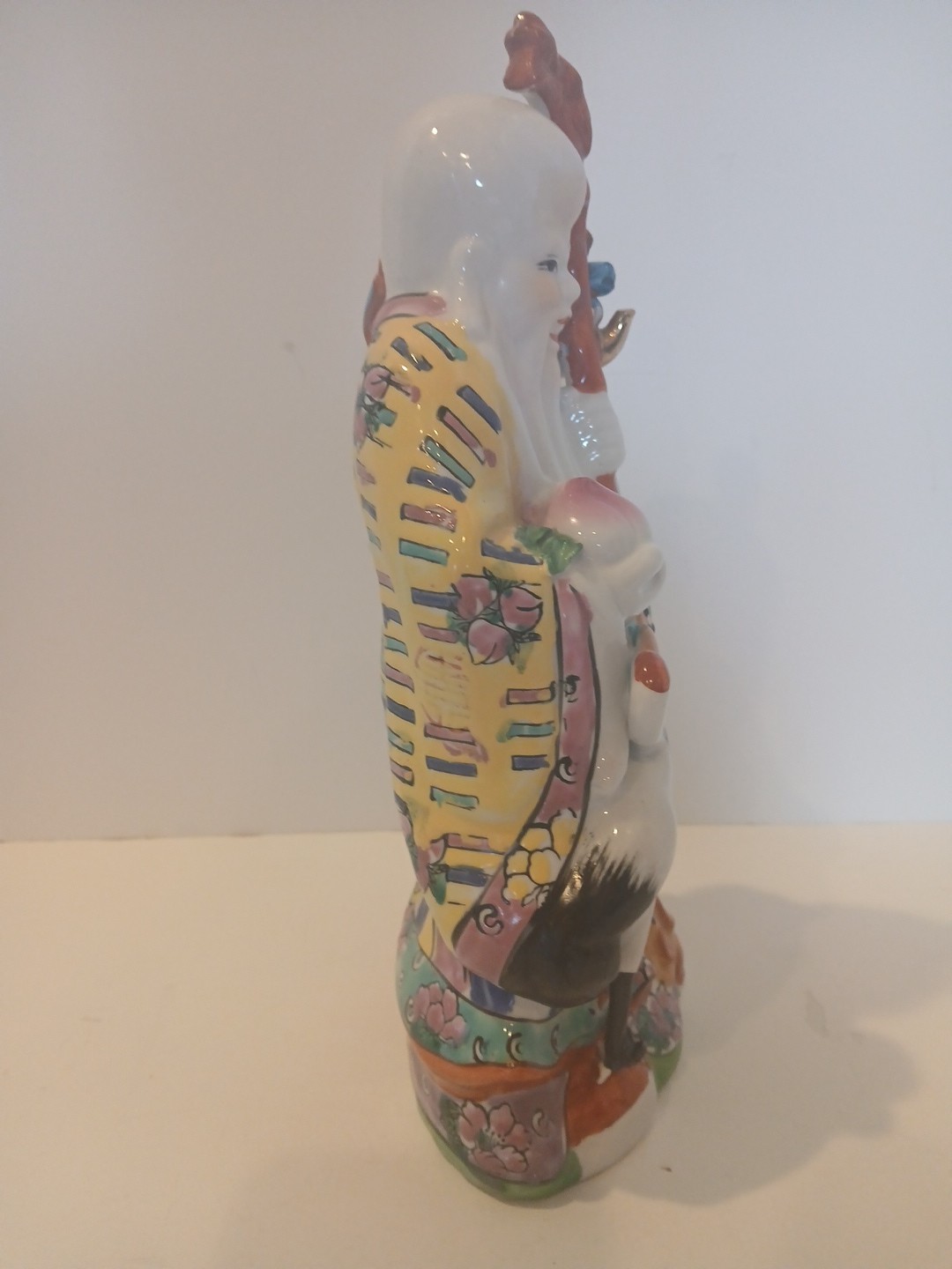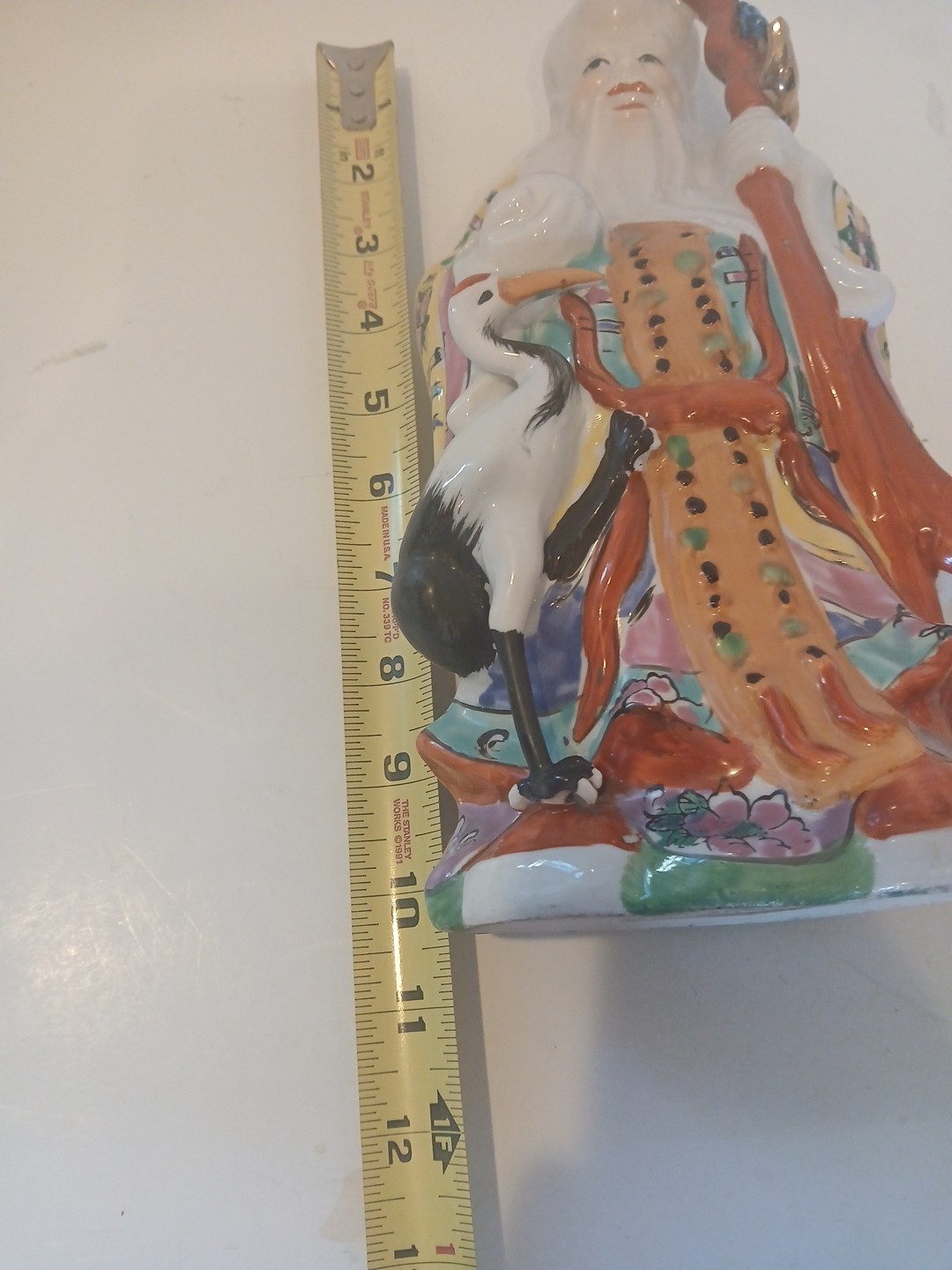 A vibrant vintage hand painted porcelain figurine of Shou Xing, the Chinese deity of long life, holding a red staff adorned with a gourd and symbols of immortality. A child gazes up at him, symbolizing generational blessings. Richly hand-painted and full of cultural charm. Beautiful crane by his side. Gold accent.This was owned by my friend's mother and was well cared for. Her mom passed and she gave several of her collectibles to me for my eBay store.Size approximations: 11 inches tall x 5 inches wide x 2.5 inches deep.Weight approximation: 1 pounds, 12 ounces.This listing is for a Vintage Shou Xing Porcelain Figurine, Chinese God of Longevity w/ Child & Staff, 16" as pictured. The pictures are part of the description, what you see is what you get. Since I am not an expert in authenticating this listing by any means, please inspect the pictures and be the judge. But, from my perspective it's in excellent condition!Beautiful figurine in beautiful condition.Thank you for shopping in my small business!Kindest regards!