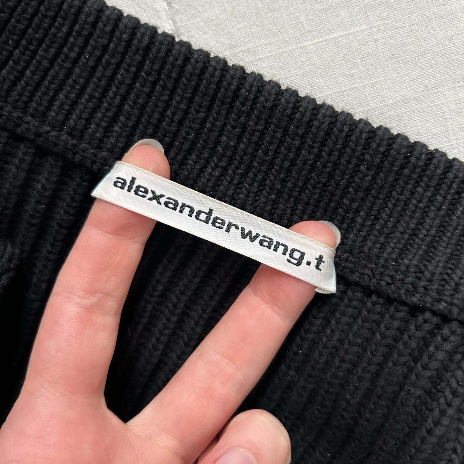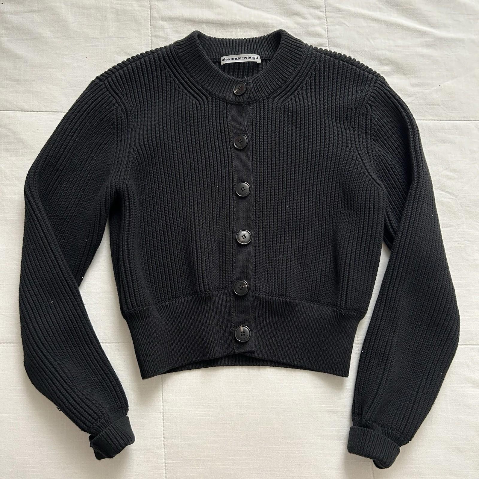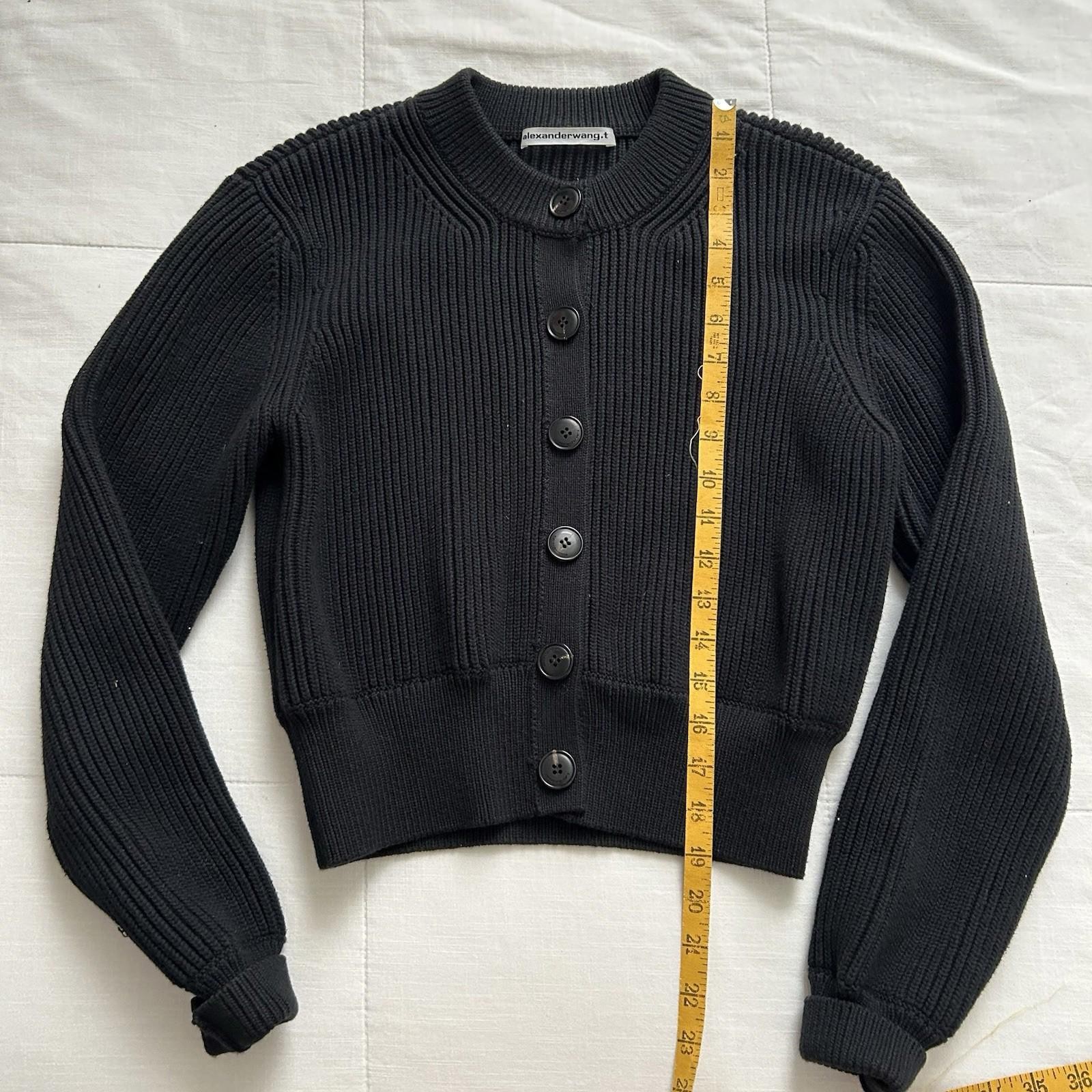 This T by Alexander Wang black knit button-down cardigan sweater in size S is a versatile layering piece for everyday wear. It is pre-owned in good condition; check the listing for details on any signs of wear, fabric content, and measurements. The crew neck and button-front design make it easy to style over tees, blouses, or dresses. Price is $65.00 USD, and it ships with free shipping. Review the listing photos and description for the most accurate condition notes before purchasing.