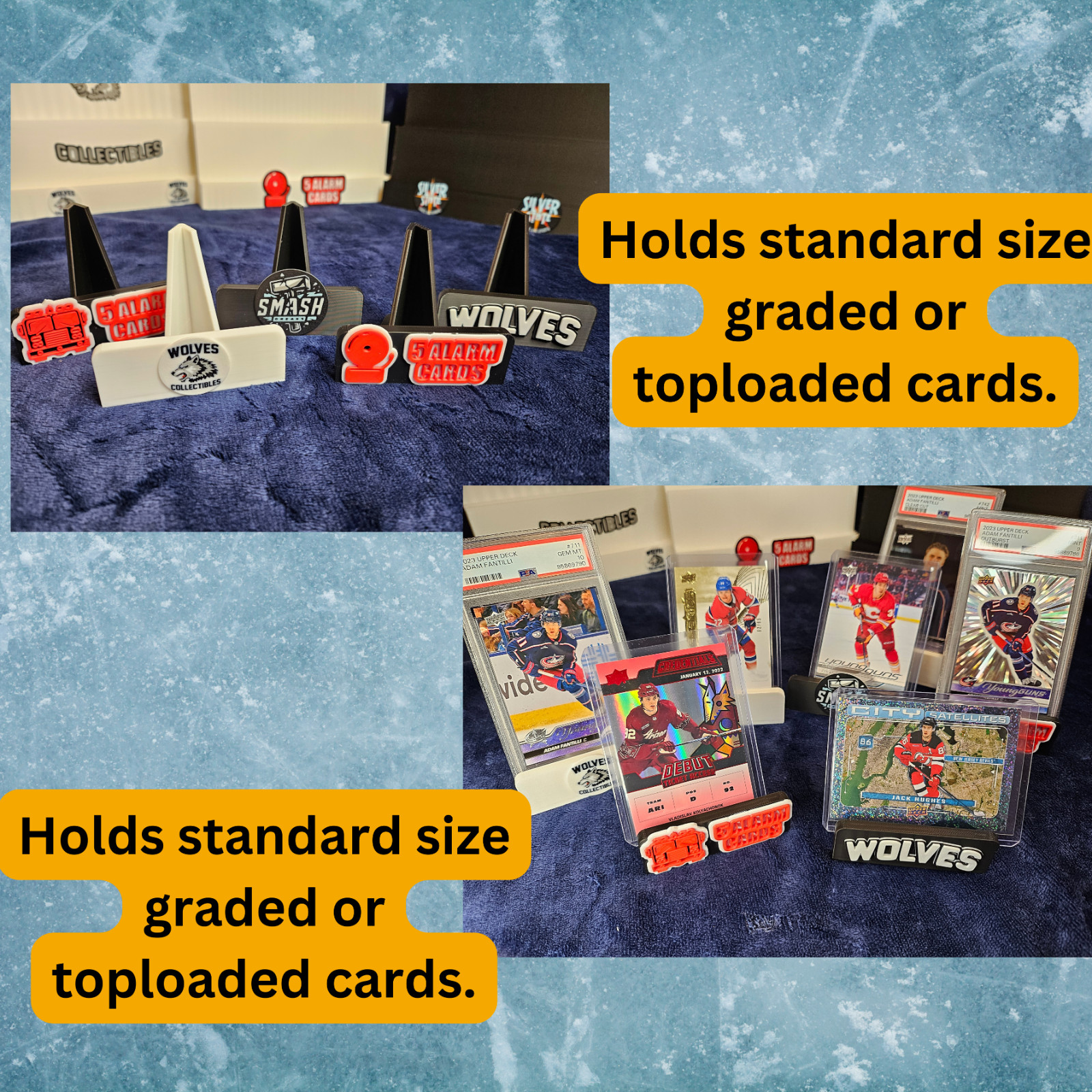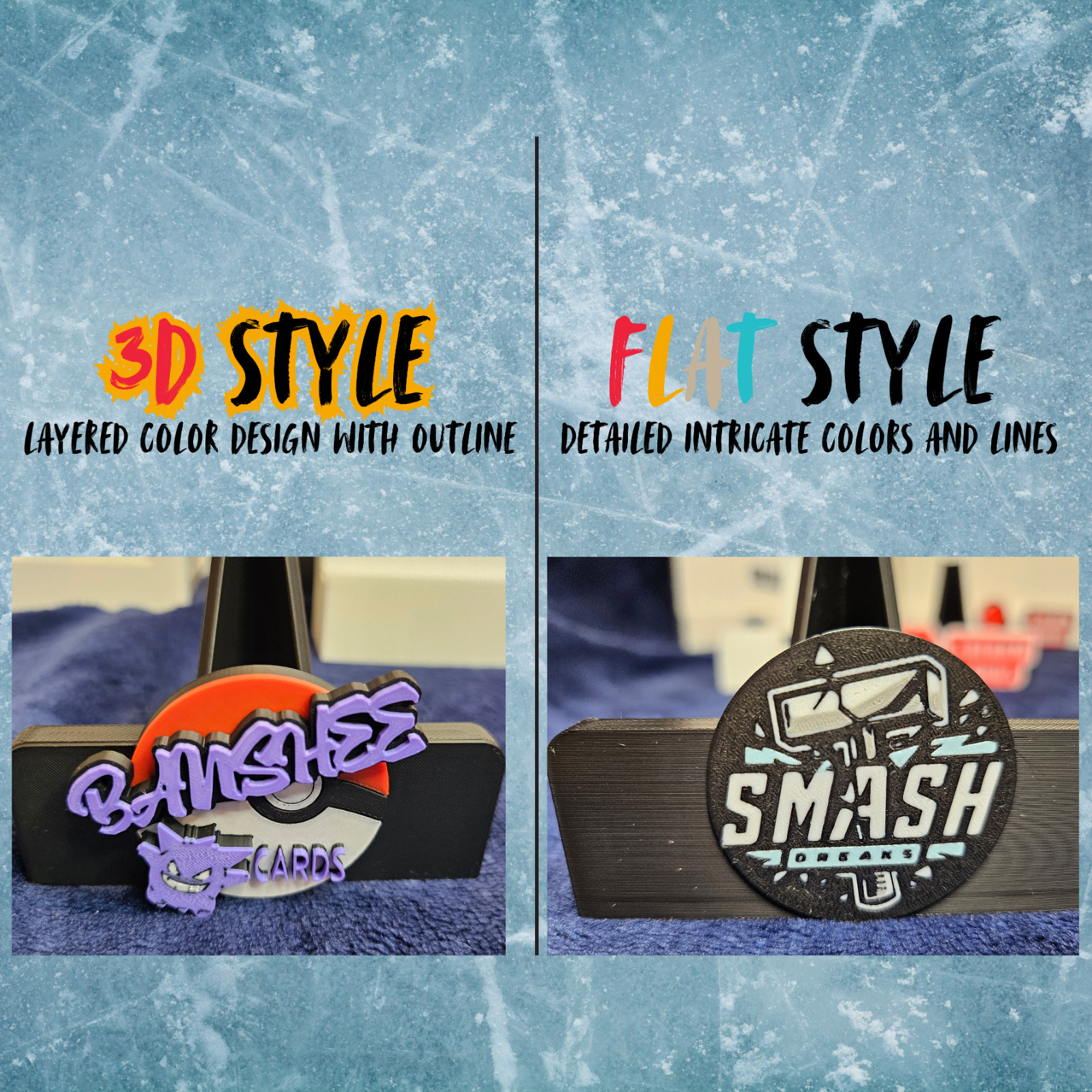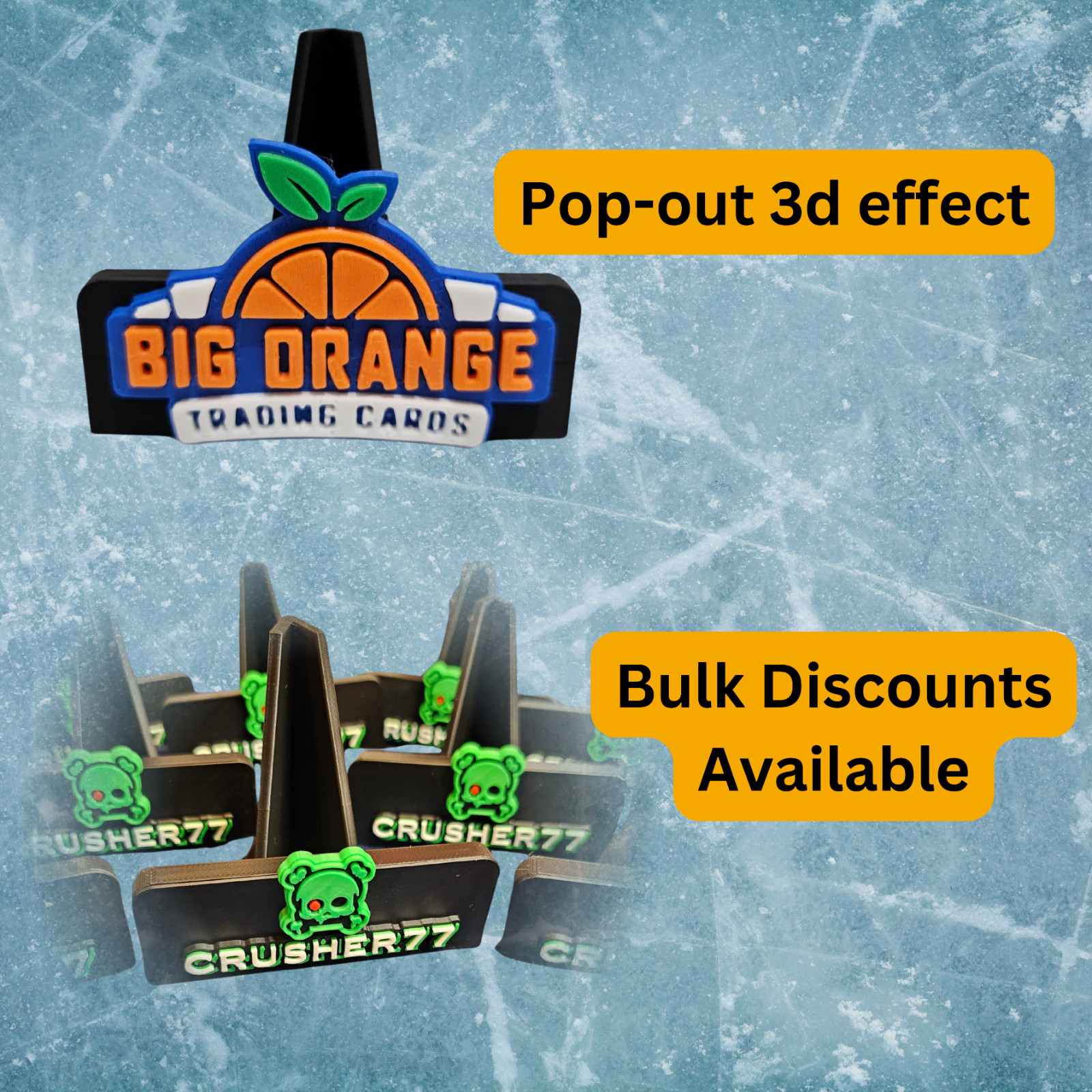 size graded slabs, one touch, top-loaded, non-sleeved, etc..)There is 2 types of 3d logo/name prints we can provide, Flat with more detail or 3d effect with less detail but layered colors.See