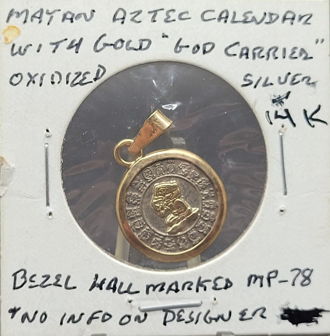 14K Yellow Gold PendantGold on Oxidized Silver CoinAztec Mayan Calendar Sun Stone Pendant Mexico. Hallmarked "14K" and "MP-78" on Bezel.17mm