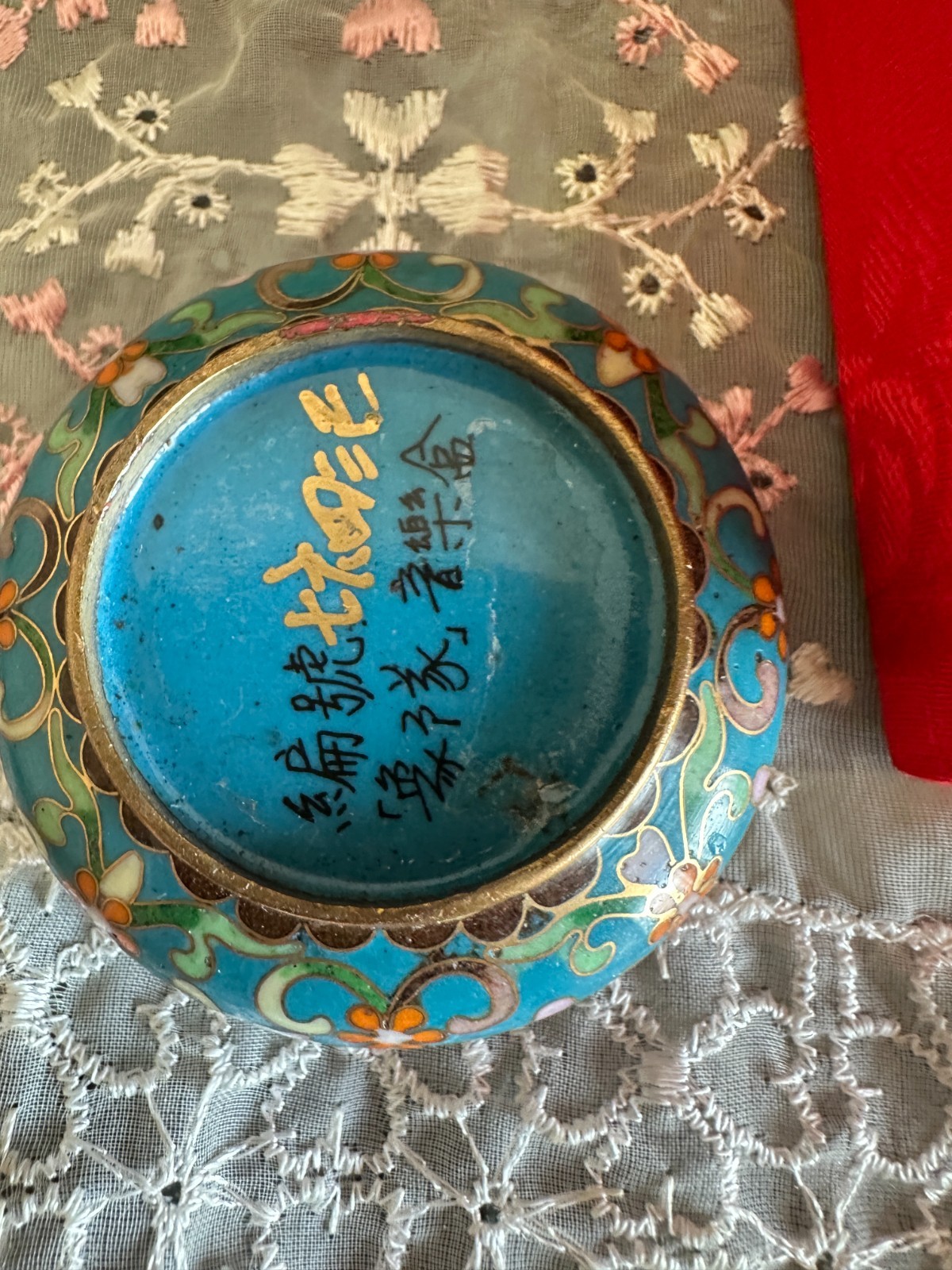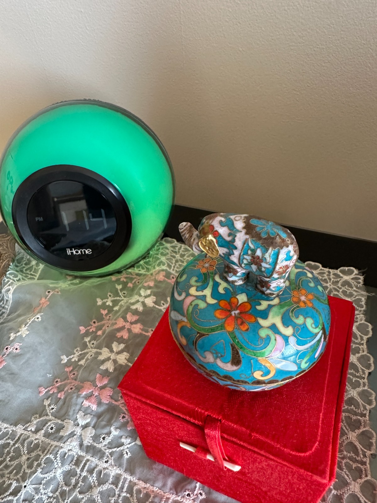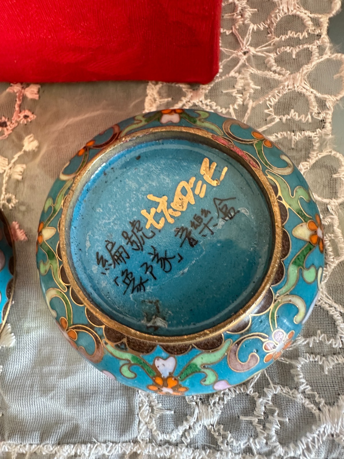 VINTAGE CHINESE CLOISONNE ENAMELED ON HEAVY BRONZE 2 PARTS TRINKET BOX , WITH BEAUTIFUL ART WORK ELEPHANT ON TOP AND WORKING MUSIC BOX.THE BOX IS IN PERFECT CONDITION NO DAMAGES AND NO REPAIRS. MEASURES: 2&1/2 INCHES - WIDE AND 3 INCHES - TALL. THIS CLOISONNE BOX WAS DONE IN CHINA FOR THE CHINESE MARKET AND HAS ITS ORIGINAL RED SILK STORAGE BOX. MANY CHINESE MARKS ON THE BASE IN BLACK AND GOLD COLORS. PLEASE SEE OUR OTHER LOTS ON EBAY AND VIEW THE PHOTOS FOR THIS LOT.