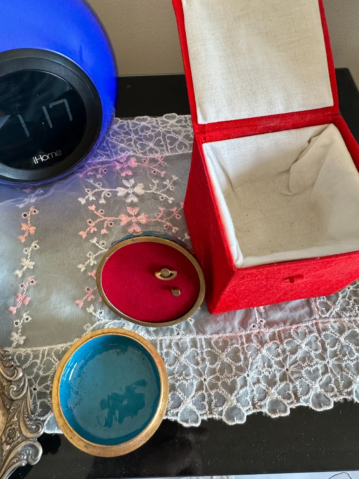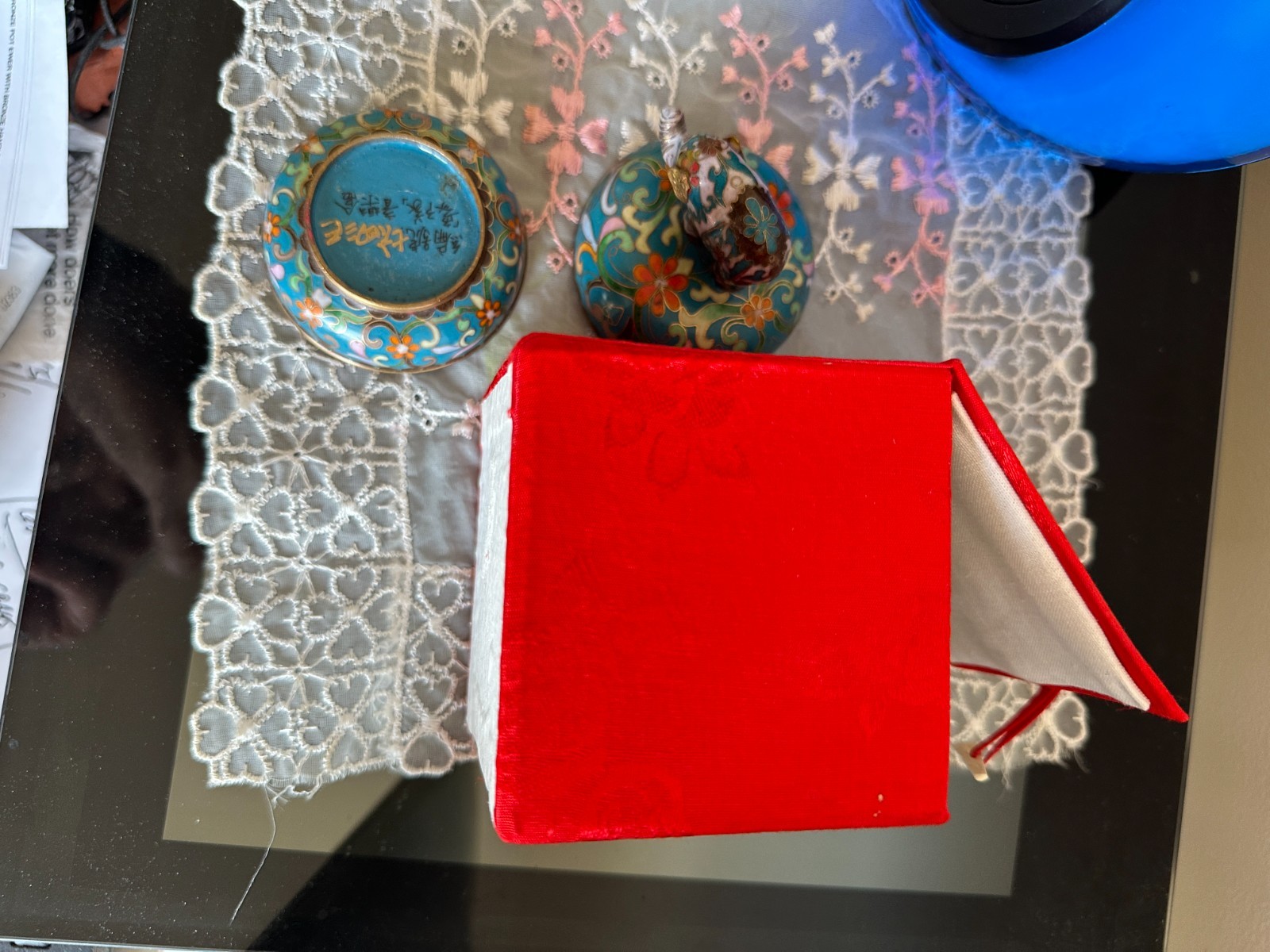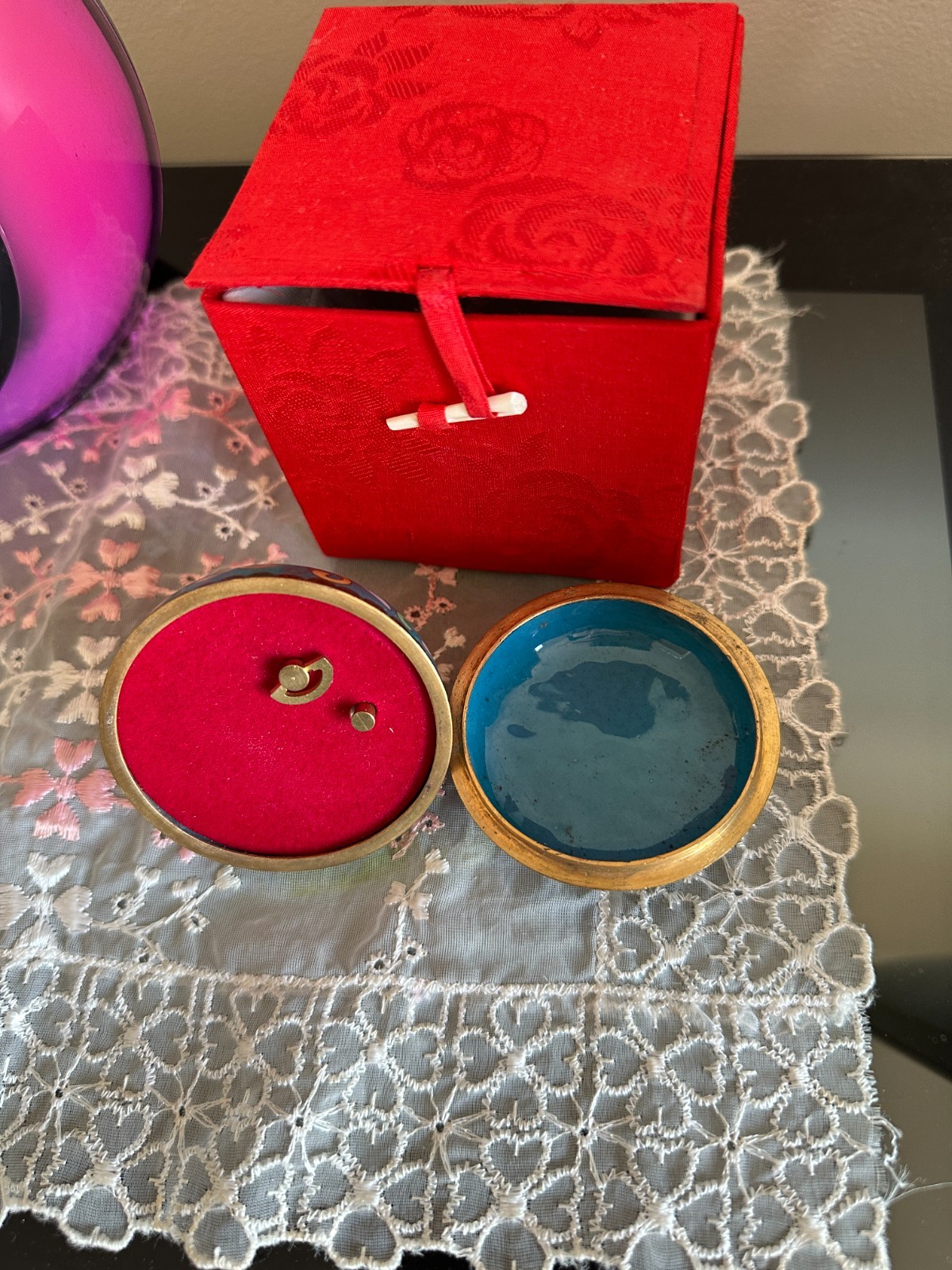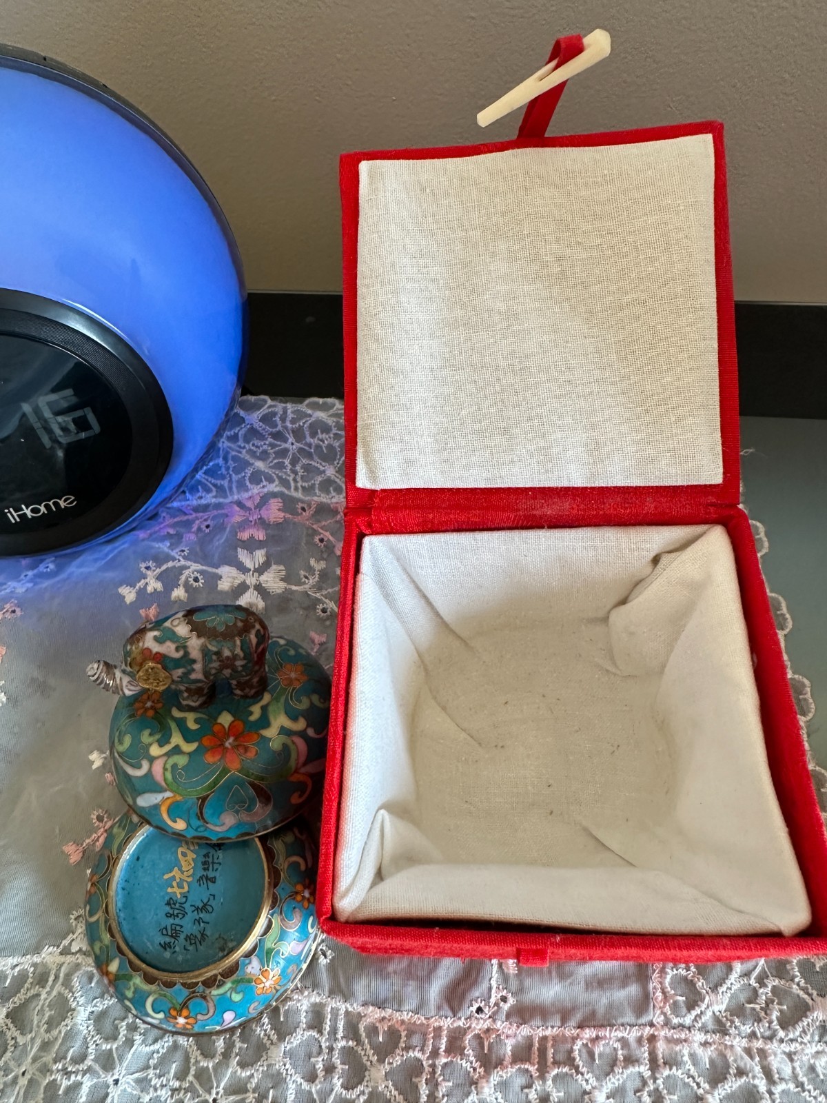 VINTAGE CHINESE CLOISONNE ENAMELED ON HEAVY BRONZE 2 PARTS TRINKET BOX , WITH BEAUTIFUL ART WORK ELEPHANT ON TOP AND WORKING MUSIC BOX.THE BOX IS IN PERFECT CONDITION NO DAMAGES AND NO REPAIRS. MEASURES: 2&1/2 INCHES - WIDE AND 3 INCHES - TALL. THIS CLOISONNE BOX WAS DONE IN CHINA FOR THE CHINESE MARKET AND HAS ITS ORIGINAL RED SILK STORAGE BOX. MANY CHINESE MARKS ON THE BASE IN BLACK AND GOLD COLORS. PLEASE SEE OUR OTHER LOTS ON EBAY AND VIEW THE PHOTOS FOR THIS LOT.