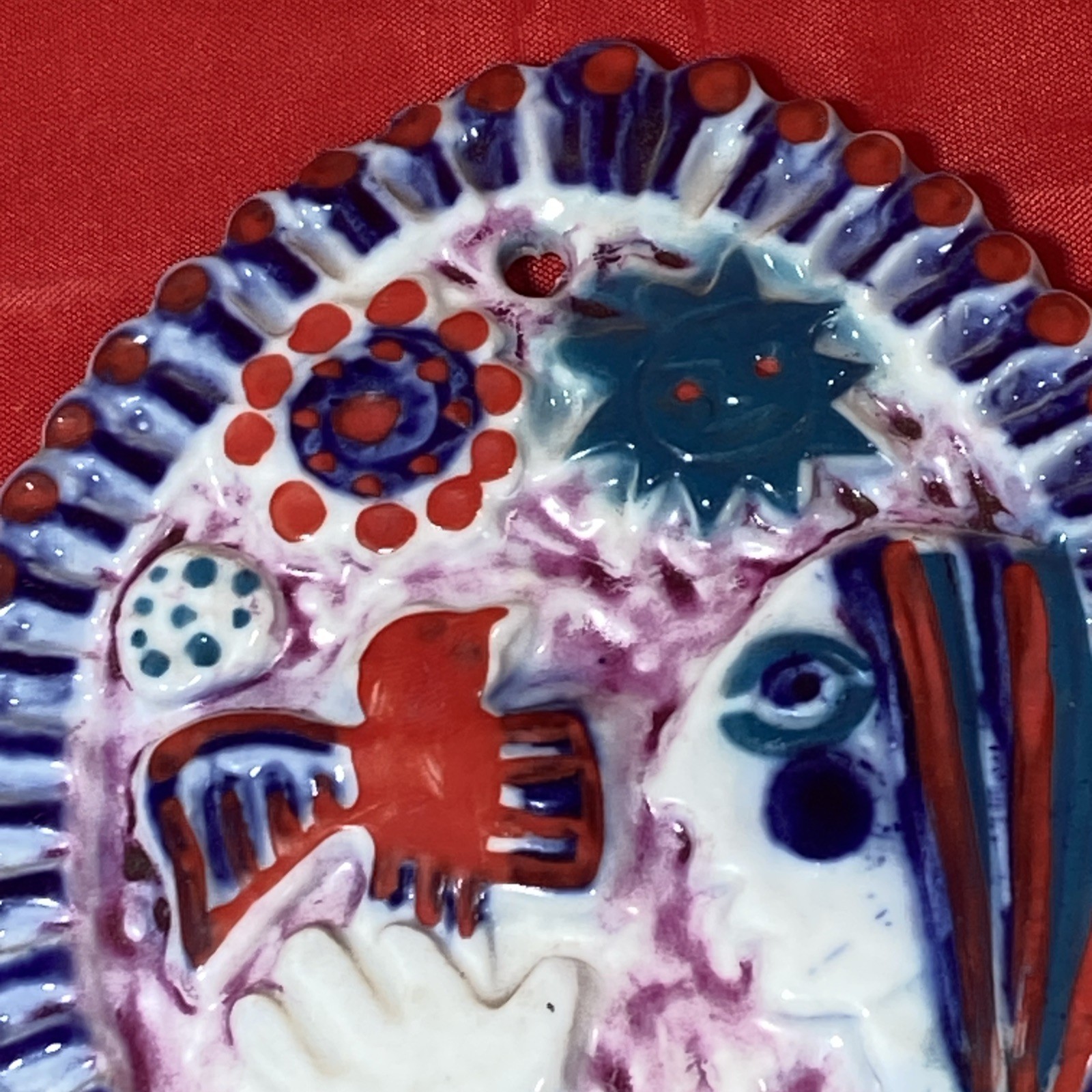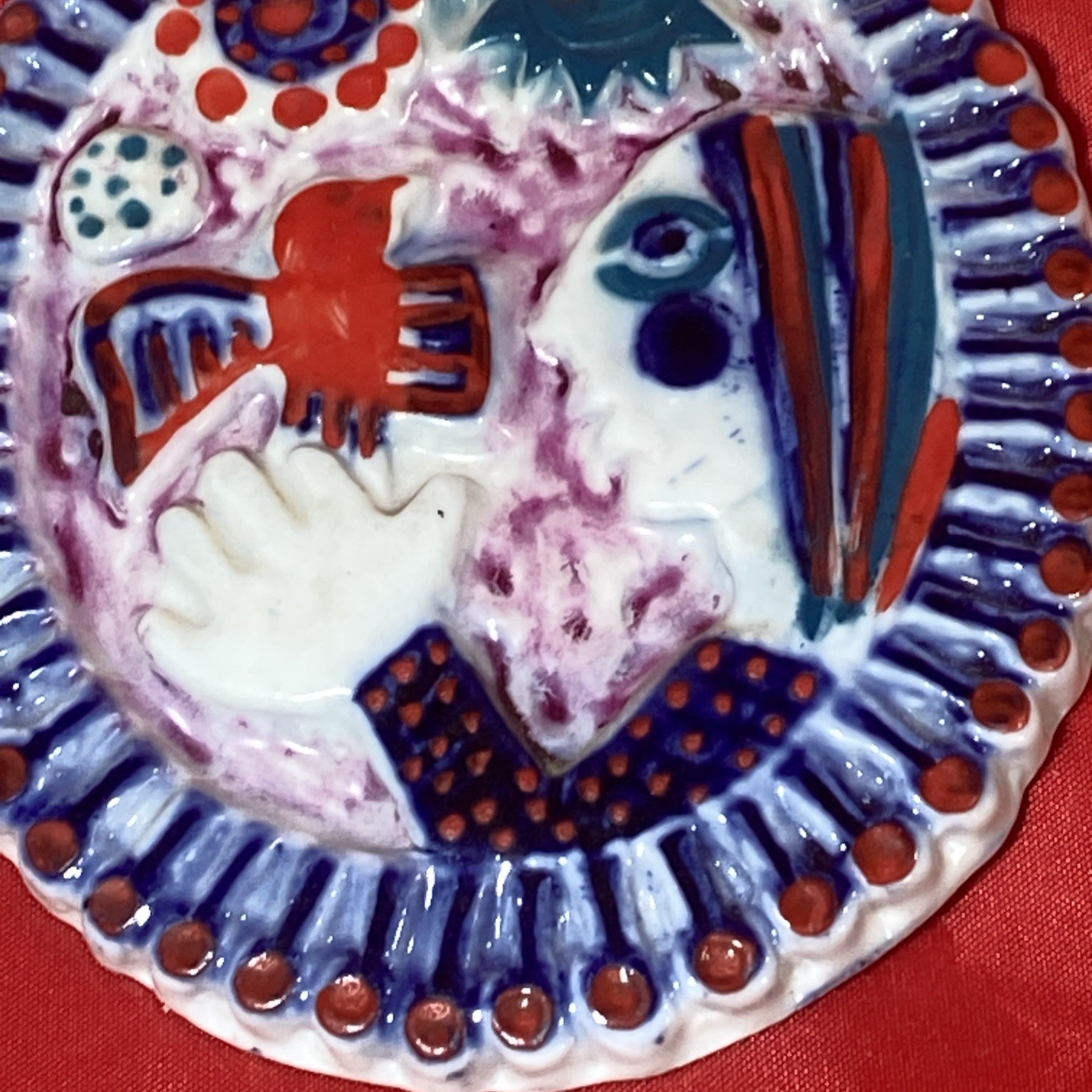 Vintage Sargadelos Porcelain Medallion, Ornament, Circa. 1970s.These highly collectable Sargadelos Medallions can symbolize the significance of a person or event ,often through portraits, saints or commemorative designs.This Bird Woman medallion is handcrafted in vibrant Cobalt Blue, Red and Turquoise on Porcelain White.Measuring approx. 4 ¼ inches by 3 ½ inches.Please look at my photos; they are part of my description. If you have questions or concerns, please ask before bidding.I've been selling on eBay for over 22 years so you can bid and buy with confidence. FREE SHIPPING IN USA