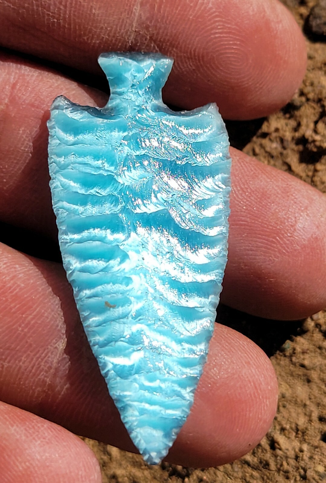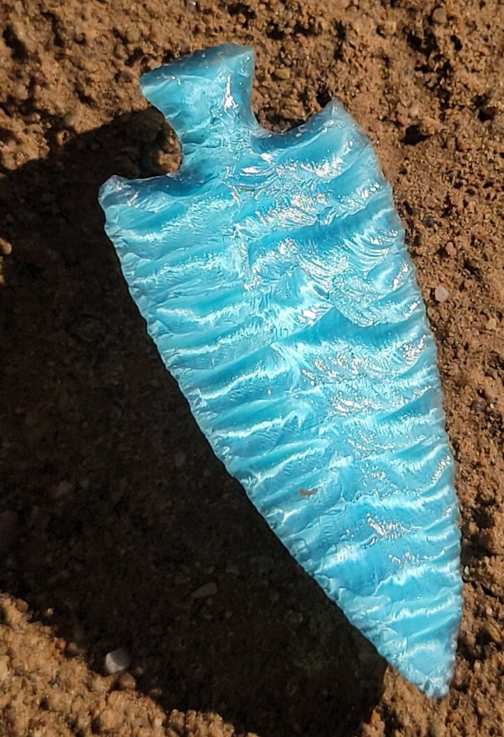 This block of TEAL GREEN Fiber Optic Glass measures 2 7/8 inches x 2 1/4 inches x 1 1/4 inches It weighs 0.8 pounds. There is a photo of the 3 colors of green that I have for sale The last 2 photos show an arrowhead made from fiber optic material. IT IS ONLY AN EXAMPLE AND NOT IN THIS SALE. Fiber optic glass is a man-made glass composed of millions of glass fibers that have been fused together into a block. This creates a reflective characteristic known as cats-eye. This material can be slabbed easily with a diamond blade. It is a great material for making cabochons as well as flint knapping into arrowheads, spears, or other shapes. We have been selling rough rock and slabs in Quartzsite, Arizona for over 20 years. Thanks for looking