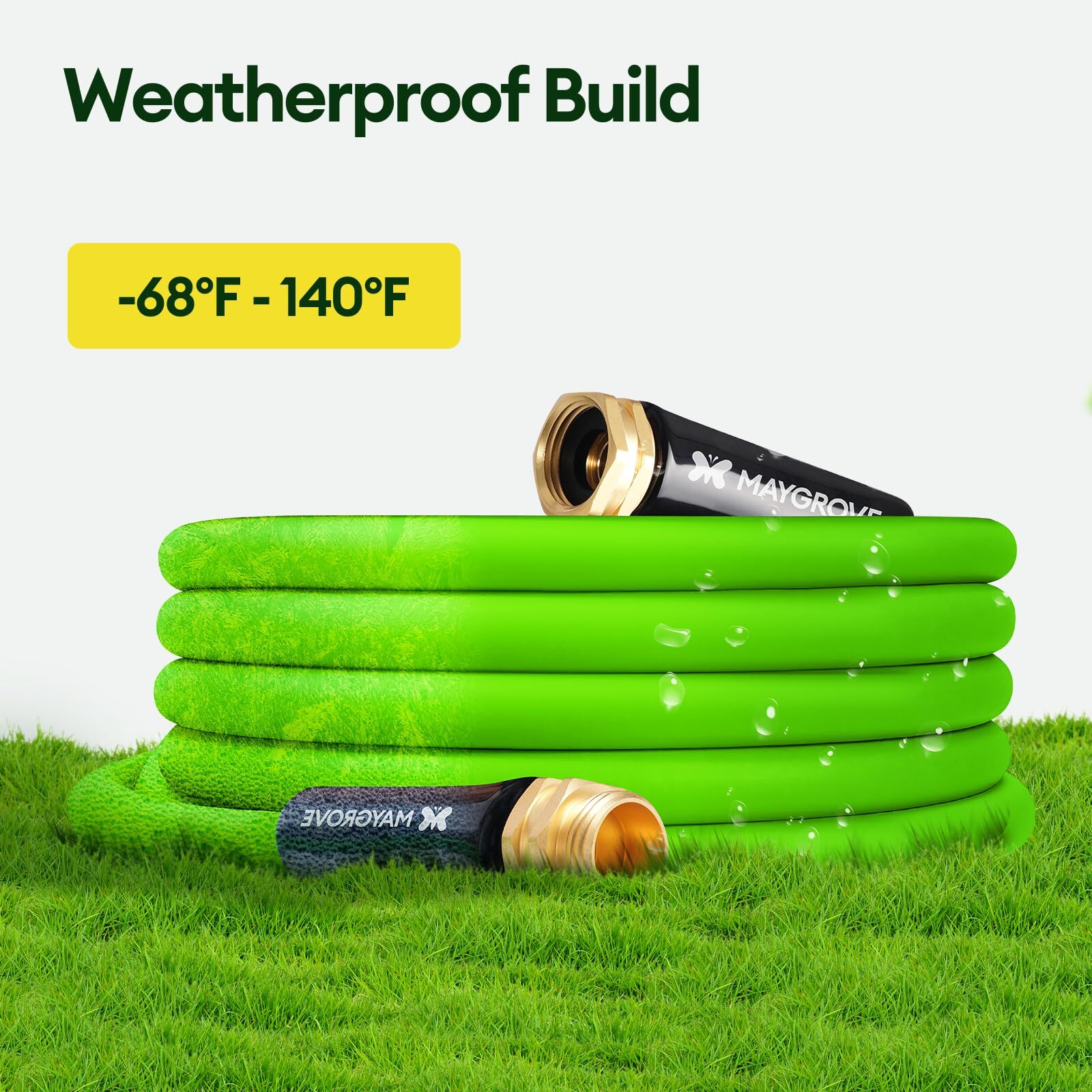 Durable and Lightweight: The three-layer construction resists corrosion, abrasion, and tearing; With a 150 PSI working pressure and 600 PSI burst pressure; It’s 30% lighter than traditional rubber hoses, making it easy to carry and maneuver Leakproof Brass Connectors: 3/4" GHT solid brass fittings prevent leaks and resist damage from pressure and rust; The 360° swivel grips ensure effortless connections to faucets, nozzles, or sprinklers Kink-Resistant and Flexible: Made from durable hybrid rubber and polymer, this hose coils and uncoils smoothly, reducing kinks and tangles (For best results, fully extend the hose before use; If the hose kinks, gently straighten it out by hand) Weatherproof Design: Designed to perform in temperatures from -68 °F to 140 °F (-20 °C to 65 °C), this hose remains flexible in all seasons; Perfect for watering plants, rinsing yards, washing cars, and cleaning pools year-round Multiple Length Options: Available in lengths ranging from 5 ft to 100 ft to meet different needs; Choose the right length for your yard and tasks(5/10/25/50/75/100ft)