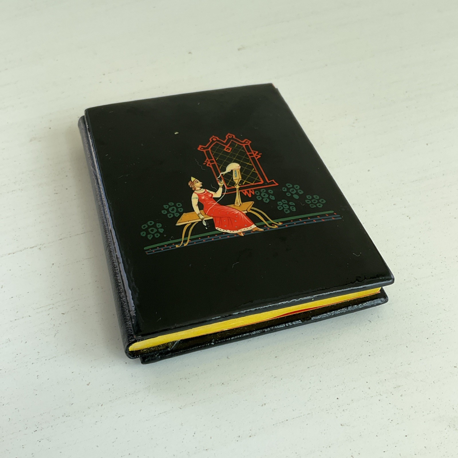 Never before used. In great condition. See photos for close-up and inside details.Smoke-free home.This vintage 1975 Russian lacquer address book is a handmade collectible featuring traditional Russian culture. The notebook includes a calendar and is perfect for storing addresses and notes in a stylish and unique way. With its distinctive design and historical significance, this piece would make a great addition to any collection or a unique gift for someone interested in Russian culture.