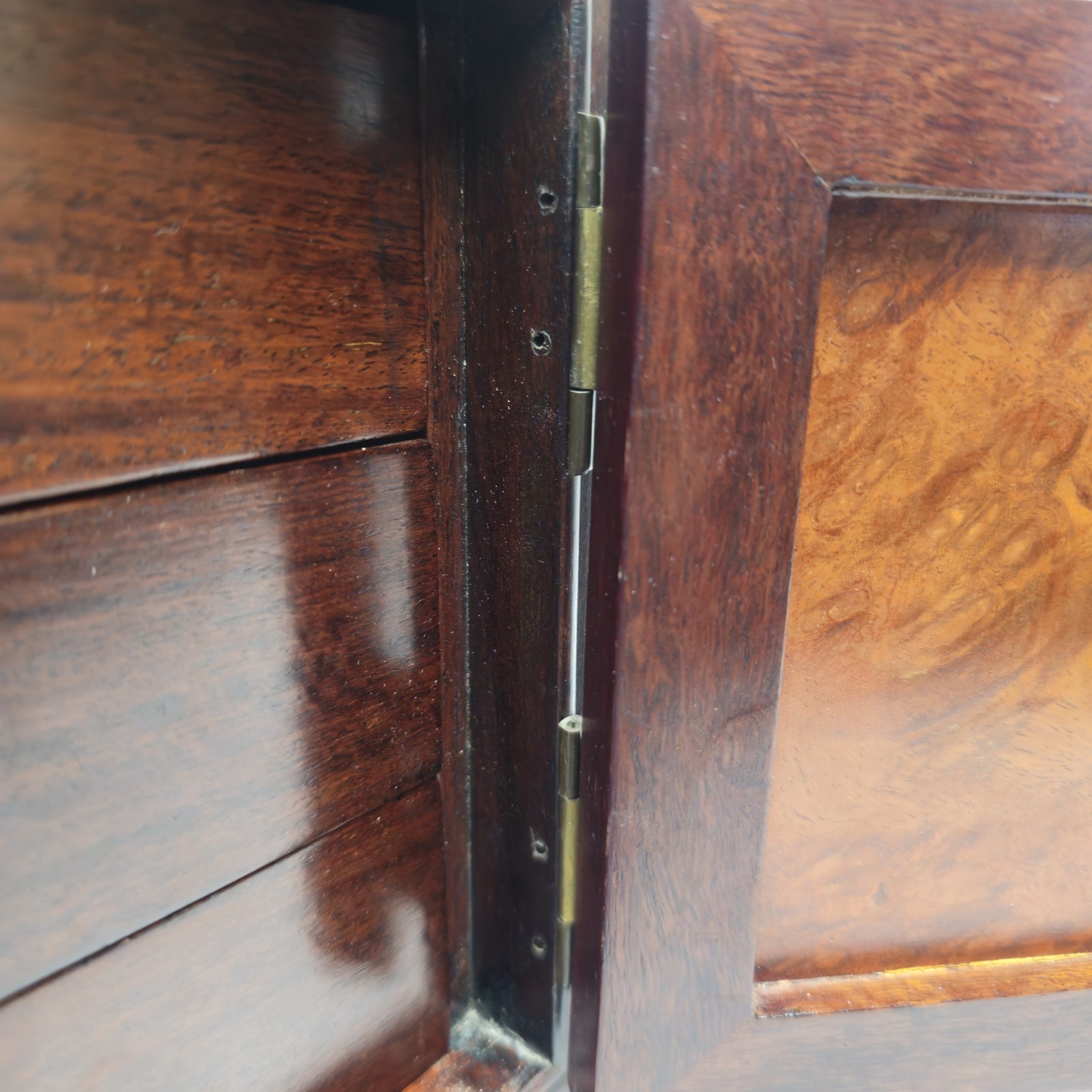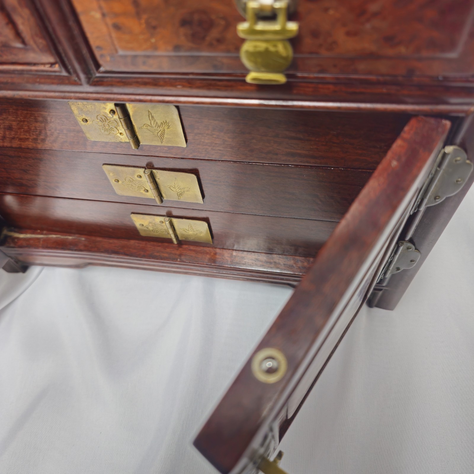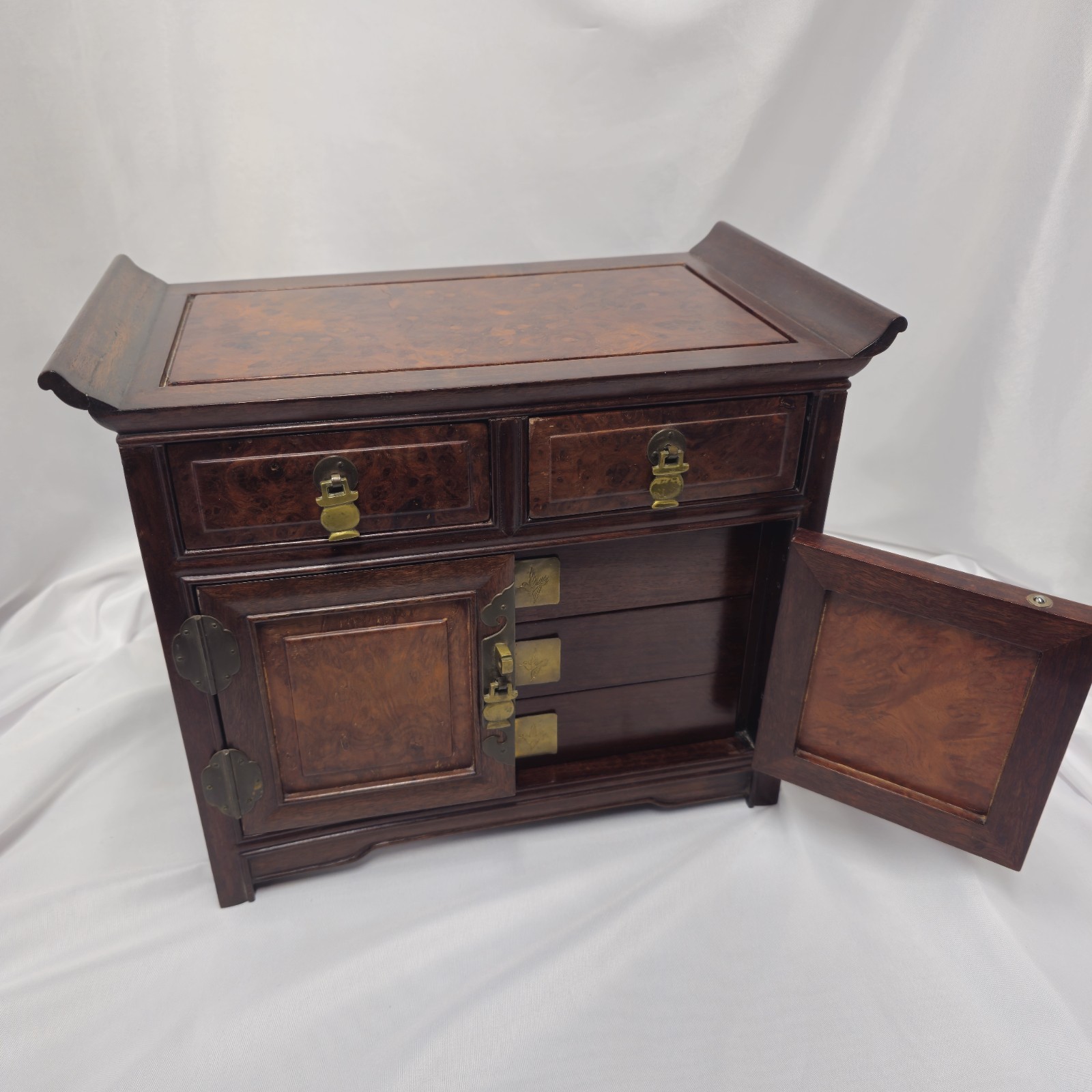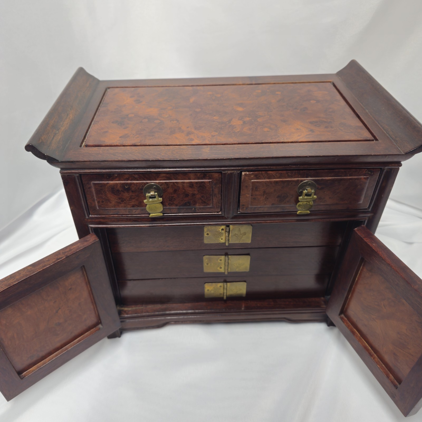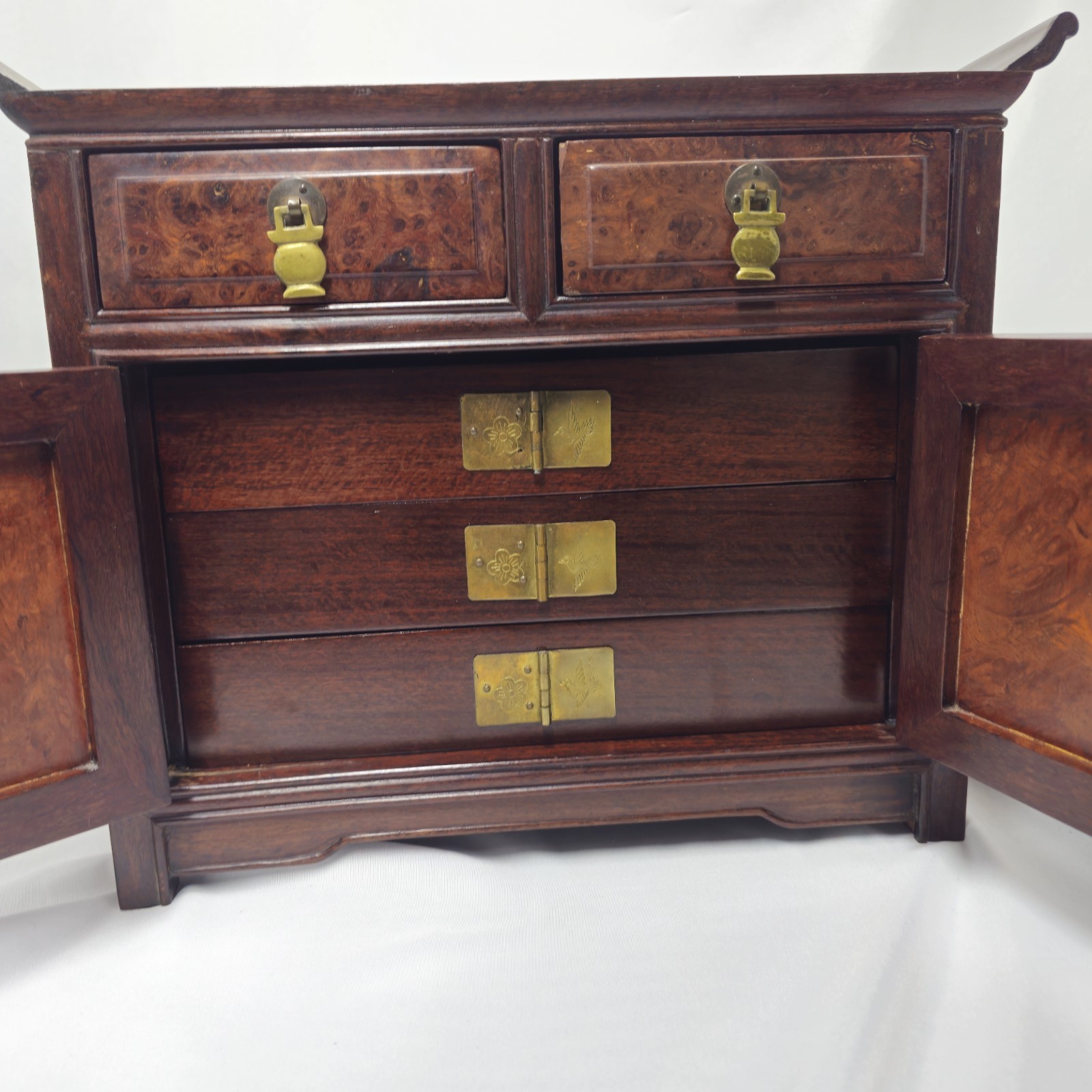 Exquisite vintage Korean jewelry chest crafted from genuine rosewood with rich burl veneer panels, finished in hand-applied lacquer.This heirloom-quality piece features ornate brass hardware, curved “ox-horn” edges, and an interior lined in deep red velvet. The double doors open to reveal three drawers accented with etched crane and floral brass motifs — symbols of longevity and beauty in Korean tradition.🌳 Materials & Craftsmanship• Frame: Solid rosewood (dense, aromatic, and richly toned)• Panels: Burl veneer with natural swirling grain• Finish: Lacquer/shellac for a high-gloss depth• Hardware: Solid brass with hand-engraved designs✨ Features• Two upper drawers with secure brass latches• Double doors revealing three inner drawers• Velvet-lined compartments for jewelry or keepsakes• Elegant mid-century Korean export design (1960s–1980s)📏 Dimensions (approx.):Height – 11 1/4"Width – 14"Depth – 8"🔸 Condition: Excellent vintage condition. Minor surface wear consistent with age. Brass has developed a light natural patina that can be polished if desired. Drawers slide smoothly; all hardware intact.🌺 A stunning display piece for collectors of fine Asian furniture or anyone seeking a unique, high-quality rosewood accent.Price: $349 (Best Offer Considered)Comparable handcrafted rosewood chests of this quality are rarely found today due to rosewood export restrictions.📦 Local pickup or carefully packed for insured shipping.