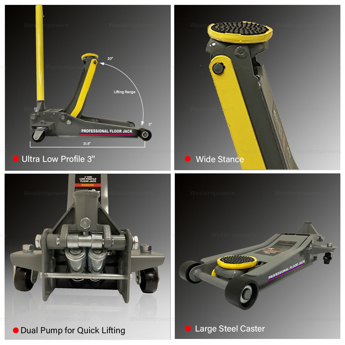 3 Ton 6000lbs Floor Jack Stand Ultra Low Profile Quick Lifting Dual Pump Pistons ITEMS DESCRIPTION This is extremely low profile, almost 1/2 the height of other steel jacks! Minimum height 3 inches.This 3 Ton floor jack is equipped with a dual parallel pump system for exclusive quick lifting. Quickly elevate vehicle with rapid pump action.The joint release provides the most precise control.Foam bumper prevents damage to vehicle finish.It's made with a heavy-duty steel lifting arm for greater stability, strength, and durability.Ultra lifting range from 3'' to 20'' allow you can gain easy access under the low-profile vehicle, even sports cars.Load capacity: 6000 Lbs. Shipping Payment Terms of Sale About us Contact us USA Buyer: USA Buyer: First Class Mail: 2- 5 business days (First Class mail may not come with tracking number) USPS Parcel Mail: 2-6 business days USPS Priority Mail: 2 - 3 busin ess days USPS Express Mail: 1- 2 business days We ship to US 50 States, All USA USPS shipping rate charge flat. Standard shipping is via UPS SurePost. UPS SurePost may utilize USPS for the final delivery. Larger orders may be delivered via UPS Ground. Seller only has the responsibility for shipping out the item on time at next business day, shipping carrier delay, Weather delay is NOT we can control. International Buyer: USPS International First Class or Priority mail only have customs number, NO tracking number. International first class mail will take 10-45 business days Seller only has the responsibility for shipping out the item on time at next business day, shipping carrier delay, Weather delay or international Customs inspections delay is NOT we can control. We Accept Paypal We Accept 30 Days Return After Purchase,Buyer Respond Return Shipping Fee and 20% Restocking Fee Our warehouse at California USA Please contact us with ebay message, thank you.