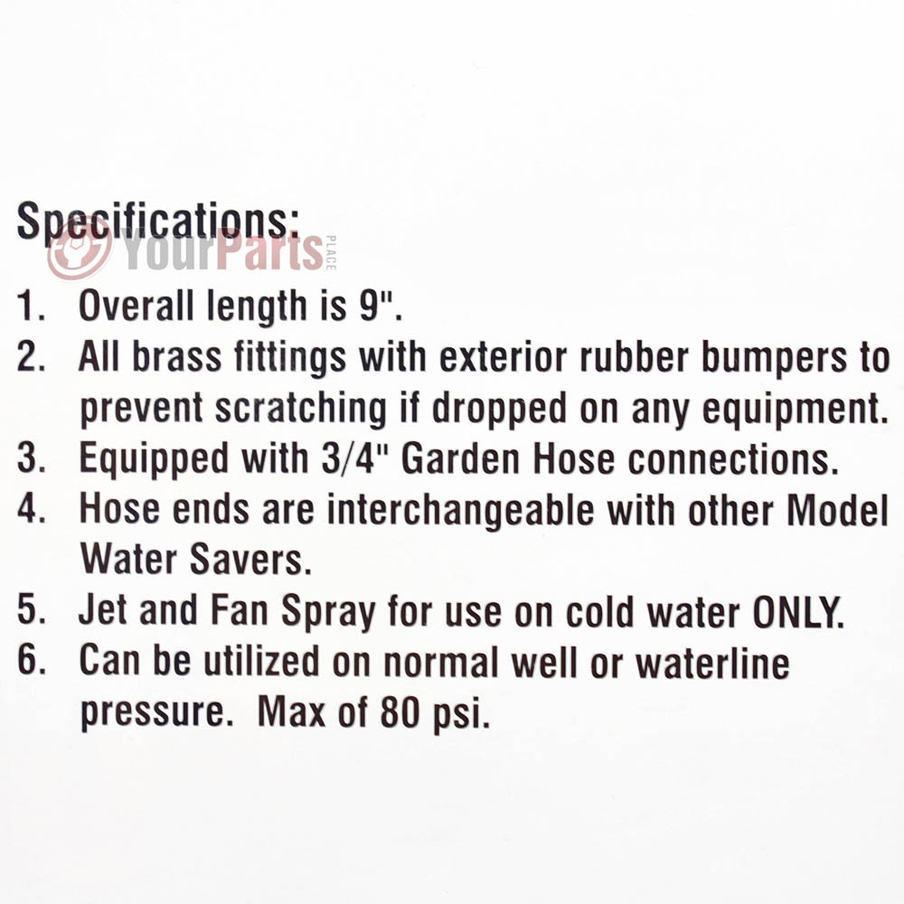The Water Saver cant be accidentally left on. Just simply release the grip on this hose for an instant shut-off. This water savers automatic shut-offs will reduce consumption by approximately 50%. It can withstand water up to 150 Degrees F on continuous use or 212 Degrees F On occasional operation. The hose end is interchangeable and with 4 different spray patterns to choose from, this water nozzle will be your go-to for all your watering needs. eBay Template Design by OCDesignsOnline Home All Items Contact Us Menu Categories Combination Wrenches Socket Wrenches Sockets Pliers Cutters Saws Hammers Tool Kits Compressor Parts Adjustable Wrenches Pipe Wrenches Utility Knives Other Store Newsletter Add our Shop to your Favorites and receive our email newsletters about new items and special promotions. Sign up Lonn Water Saver Rubber Water Nozzle with 4 Different Spray Patterns 05RP Product Description Lonn Water Saver Rubber Water Nozzle 026-002 The Water Saver cant be accidentally left on. Just simply release the grip on this hose for an instant shut-off. This water savers automatic shut-off will reduce consumption by approximately 50%. It can withstand water up to 150 Degrees F on continuous use or 212 Degrees F On occasional operation. The hose end is interchangeable and with 4 different spray patterns to choose from, this water nozzle will be your go-to for all your watering needs. Features • Overall length is 9"• All brass fittings with exterior rubber bumpers to prevent scratching if dropped on any equipment• Equipped with 3/4" garden hose connections• Jet and fan spray for use on cold water ONLY• Can be utilized on normal well or water line pressure. Max of 80 psi• Release the grip on this hose for an instant shut-off• Will reduce consumption by approximately 50%• Can withstand water up to 150 Degrees F on continuous use or 212 Degrees F On occasional operation• Hose end is interchangeable and has 4 different spray patterns Payment Shipping Returns Payment All Payments are made through PayPal. If you have any questions feel free to Message us via the eBay message system at any time. Shipping At Your Parts Place we are dedicated to our service for you! We ship all items within 24 hours of payment Monday-Friday. We are closed on weekends and holidays. Most all items ordered Tuesday-Friday by 10:00 am Central Time, will ship the same day. If for any reason there is an issue with your order we will contact you right away. If you are in need of expedited shipping, please contact us via ebay messaging system. Returns We accept returns within 30 days of purchase. A 20% restocking fee applies on all items returned for a refund. If you receive a manufacture defective item and want to exchange it there is no restocking fee. No refunds will be given on items that have been opened or used and will be exchange only. Anything being returned must include all original parts sent or fees will apply. Buyer is responsible for return shipping costs to us. We will pay to ship the item replacement back to you. All returns need to have a note included with the buyers information and reason for return or exchange. Home All Items Contact Us Copyright 2017 YourPartsPlace. All Rights Reserved. eBay Template Design By OcDesign