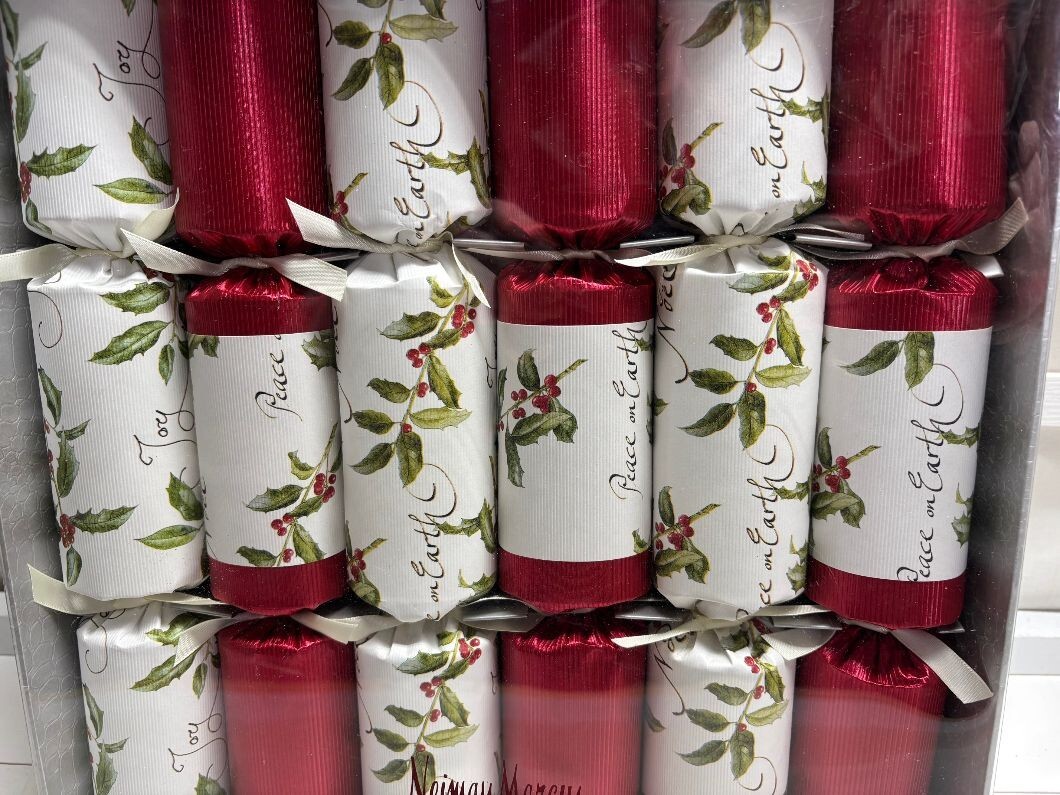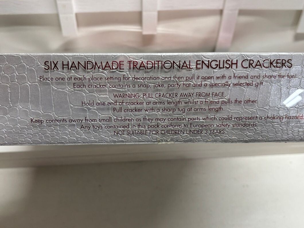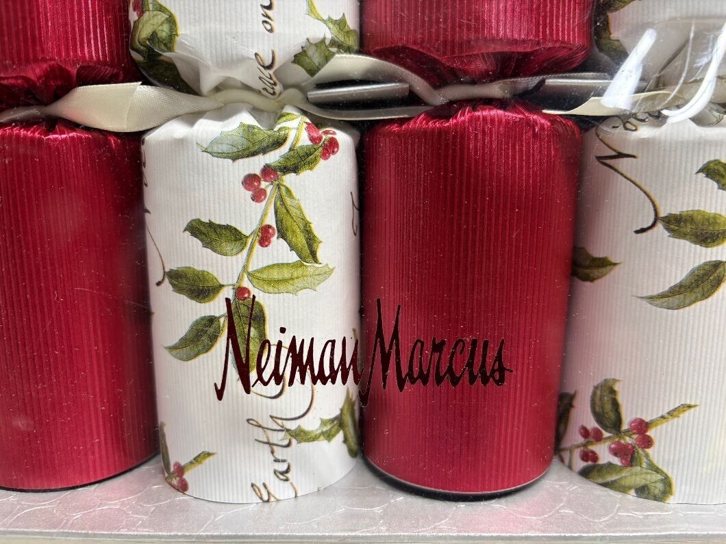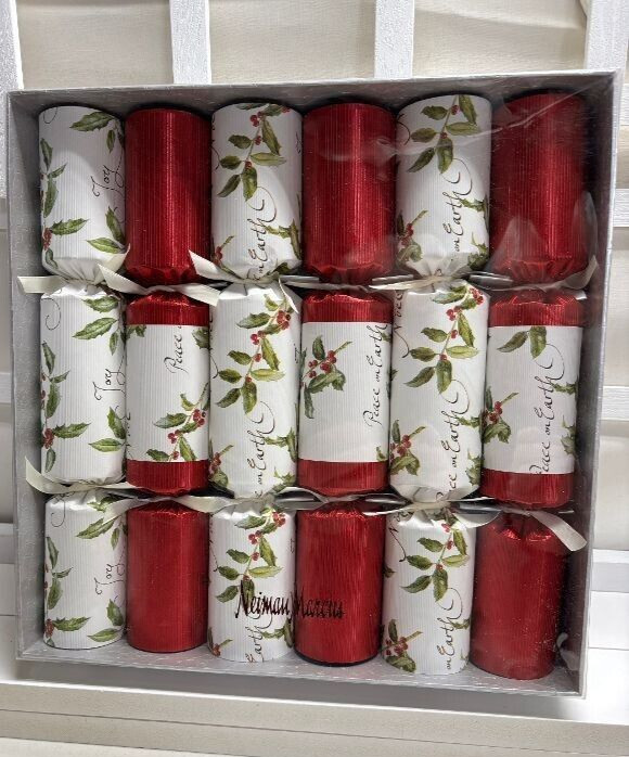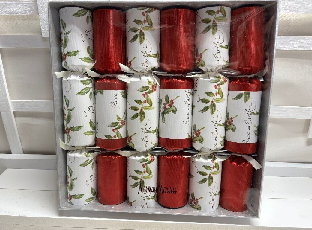 NEIMAN MARCUS~ Six~ PEACE ON EARTH / JOY / NOEL ~ English Holiday CrackersIncludes 6 Handmade English Crackers in a box.Multicolored foil finished with "PEACE ON EARTH/ JOY/ NOEL"Each cracker contains a snap, joke, party hat and a specially selected gift. Size: Each cracker is 11 1/2 " long.THE TRADITION OF ENGLISH FESTIVE AND PARTY CRACKERS:Party crackers are a British tradition dating back to Victorian times when a confectioner started selling sugared almonds, each with a motto and wrapped in a twisted paper package, as love tokens. One day a jet of resin from the confectioners log fire burst into flame with a loud 'crack'. Using this idea he decided to make a log shaped package that would produce a surprise bang and inside would be an almond and a motto. It soon became a firm favourite at parties with toys, hats and jokes added to each 'cracker'.By the end of the century it was well established as a traditional holiday custom and now each year virtually every household in the UK has crackers. In recent years crackers have become essential ice breakers at all types of parties, dinner parties, weddings and celebrations