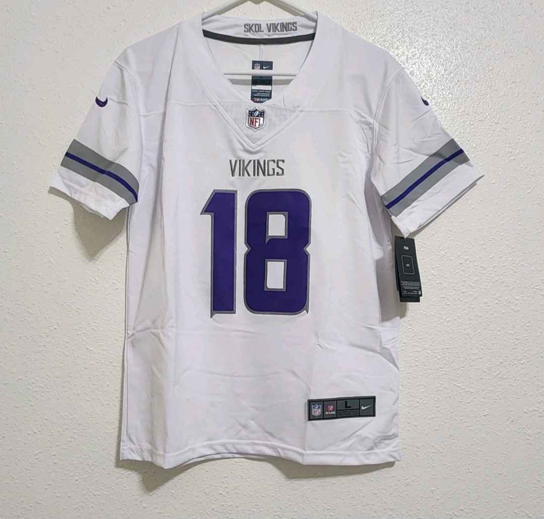 Minnesota Vikings Justin Jefferson #18 kids stitched jersey in youth size L (14/16). Condition is pre-owned; check the listing for details on any signs of wear and what is included. This jersey is a good option for young fans looking for team apparel for games, school spirit days, or casual wear. Free shipping is included, and the item ships as described in the listing. Review the photos and any seller notes to confirm exact condition, fit, and details before purchase.